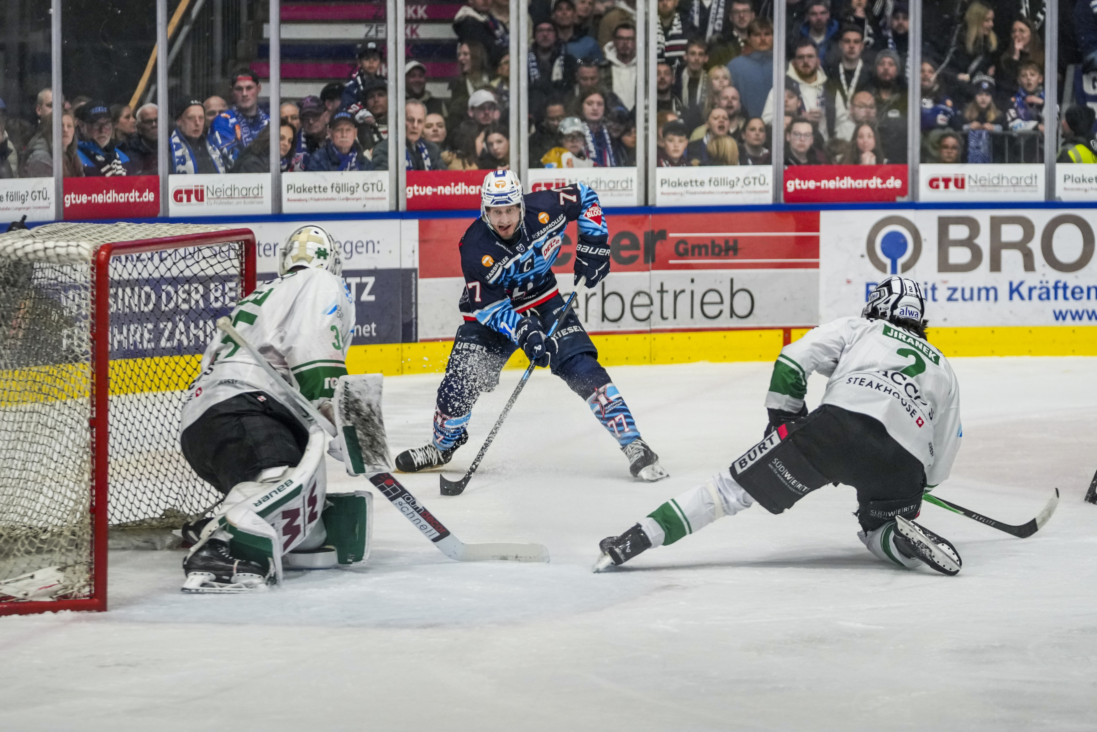 Torchance von Louis Latta (Ravensburg Towerstars, #74) zum 1:2 gegen Olafr Schmidt (Bietigheim Steelers, #35), GER, Ravensburg Towerstars vs. Bietigheim Steelers, Eishockey, DEL2, Spielzeit 2025/2026, Playoff Viertelfinale, Spiel 3, 22.03.26 Foto: Maximilian Rist