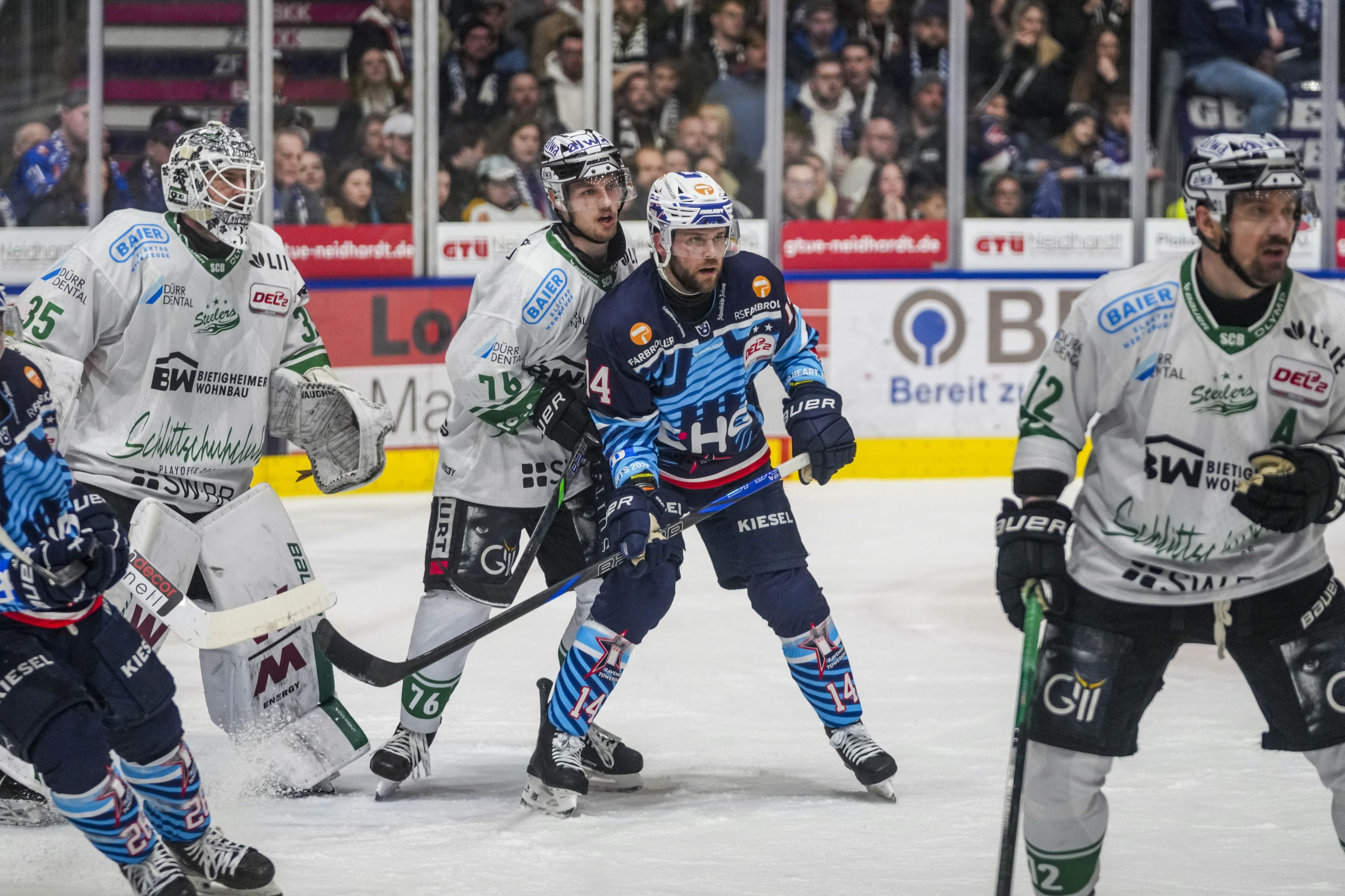 Starting Six Steelers, GER, Ravensburg Towerstars vs. Bietigheim Steelers, Eishockey, DEL2, Spielzeit 2025/2026, Playoff Viertelfinale, Spiel 3, 22.03.26 Foto: Maximilian Rist