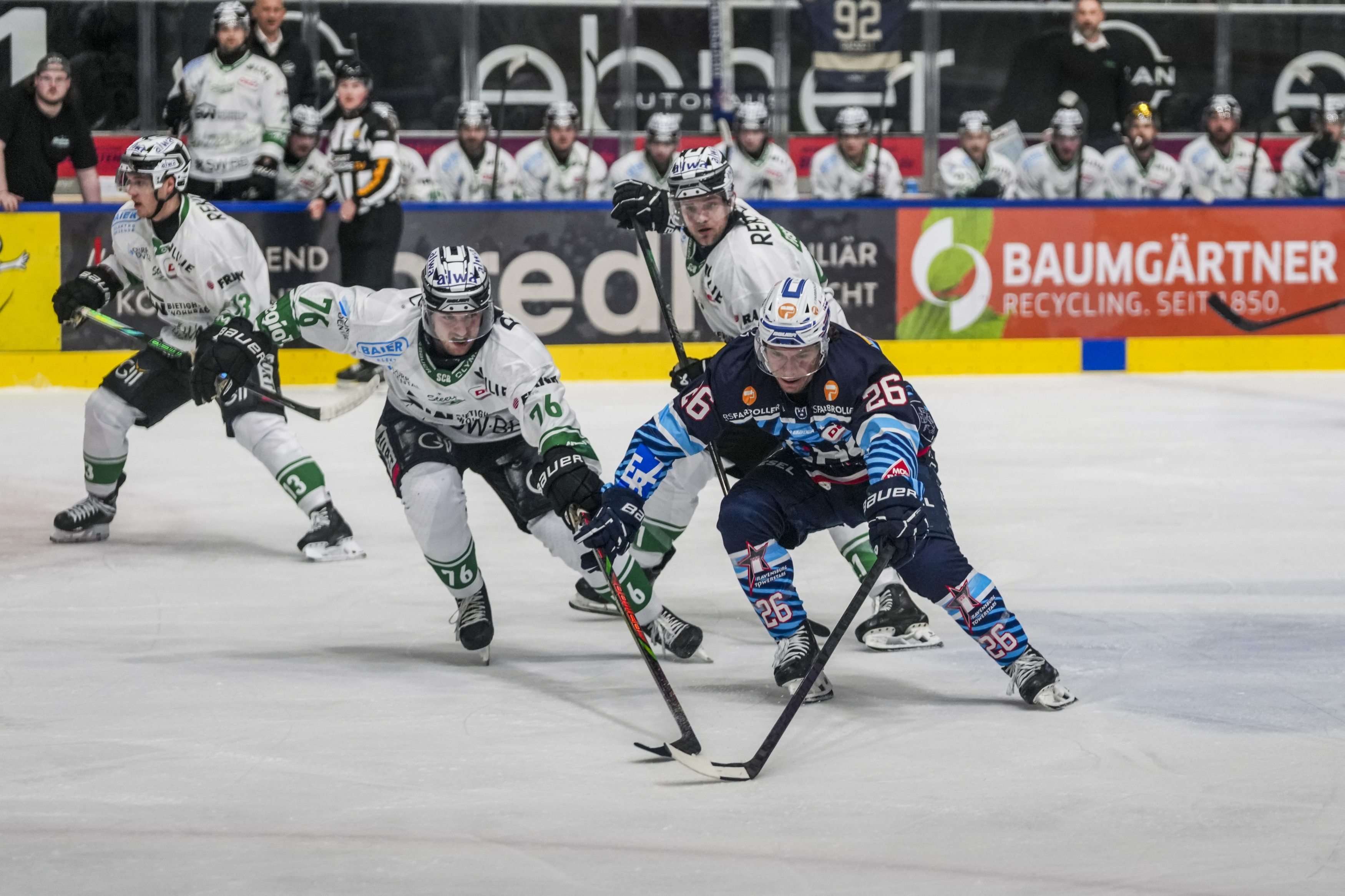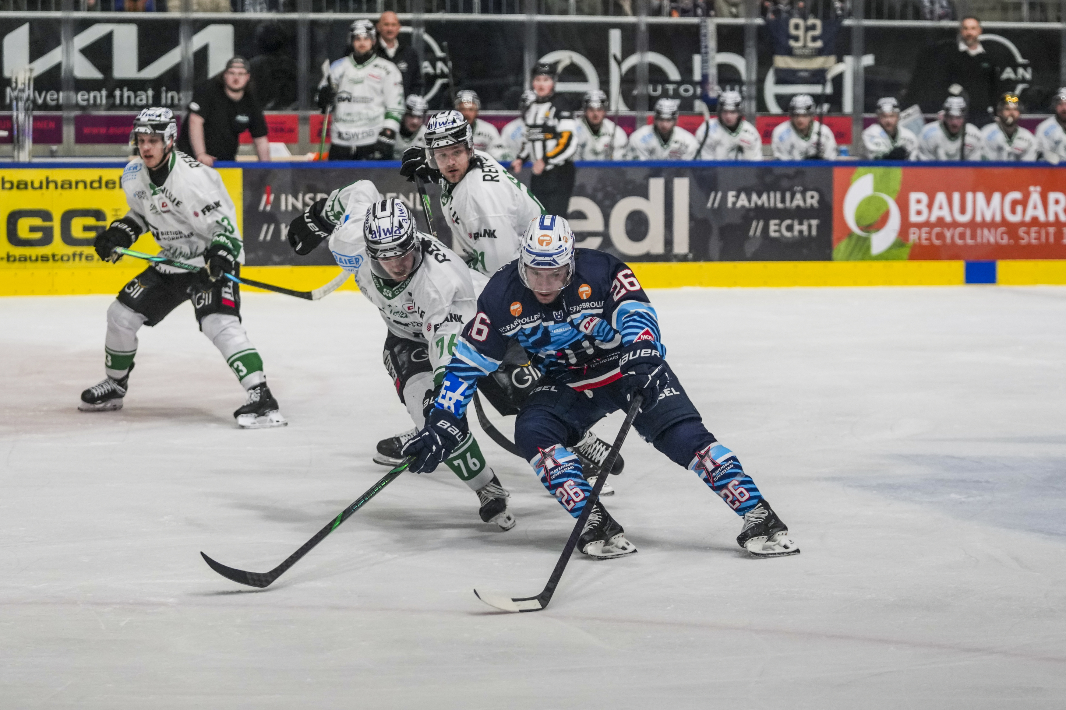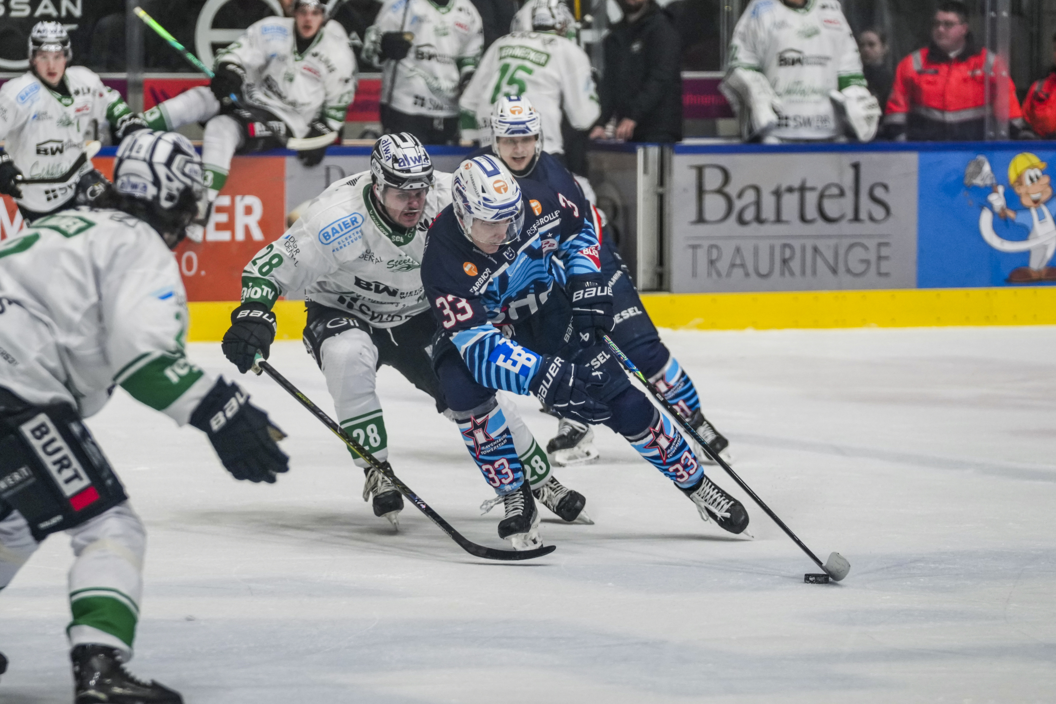 Robbie Czarnik (Ravensburg Towerstars, #77) im Austausch mit Erik Jinesjoe Karlsson (Ravensburg Towerstars, #19), GER, Ravensburg Towerstars vs. Bietigheim Steelers, Eishockey, DEL2, Spielzeit 2025/2026, Playoff Viertelfinale, Spiel 3, 22.03.26 Foto: Maximilian Rist , GER, Ravensburg Towerstars vs. Bietigheim Steelers, Eishockey, DEL2, Spielzeit 2025/2026, Playoff Viertelfinale, Spiel 3, 22.03.26 Foto: Maximilian Rist