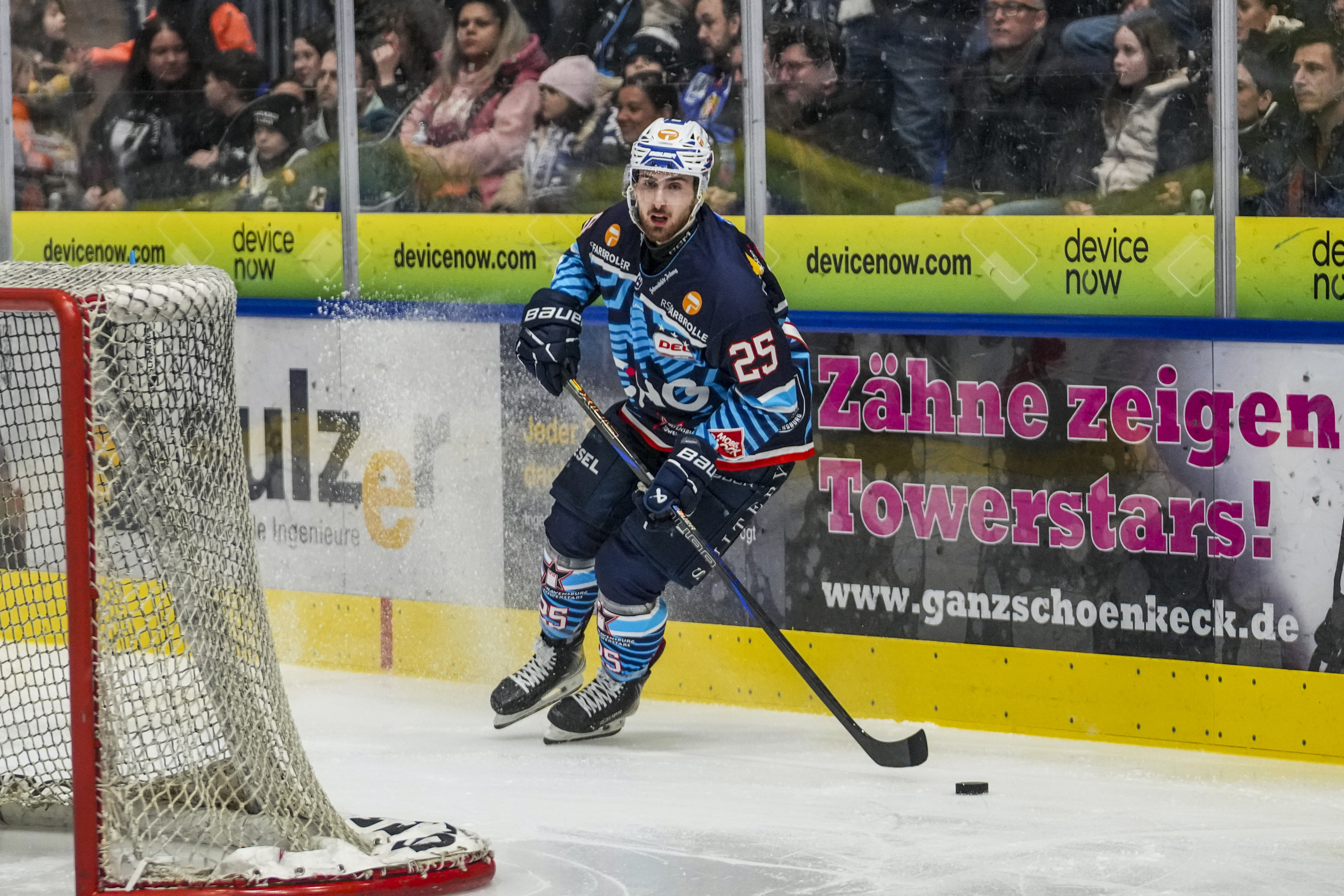 Philipp Mass (Ravensburg Towerstars, #25), GER, Ravensburg Towerstars vs. Bietigheim Steelers, Eishockey, DEL2, Spielzeit 2025/2026, Playoff Viertelfinale, Spiel 3, 22.03.26 Foto: Maximilian Rist