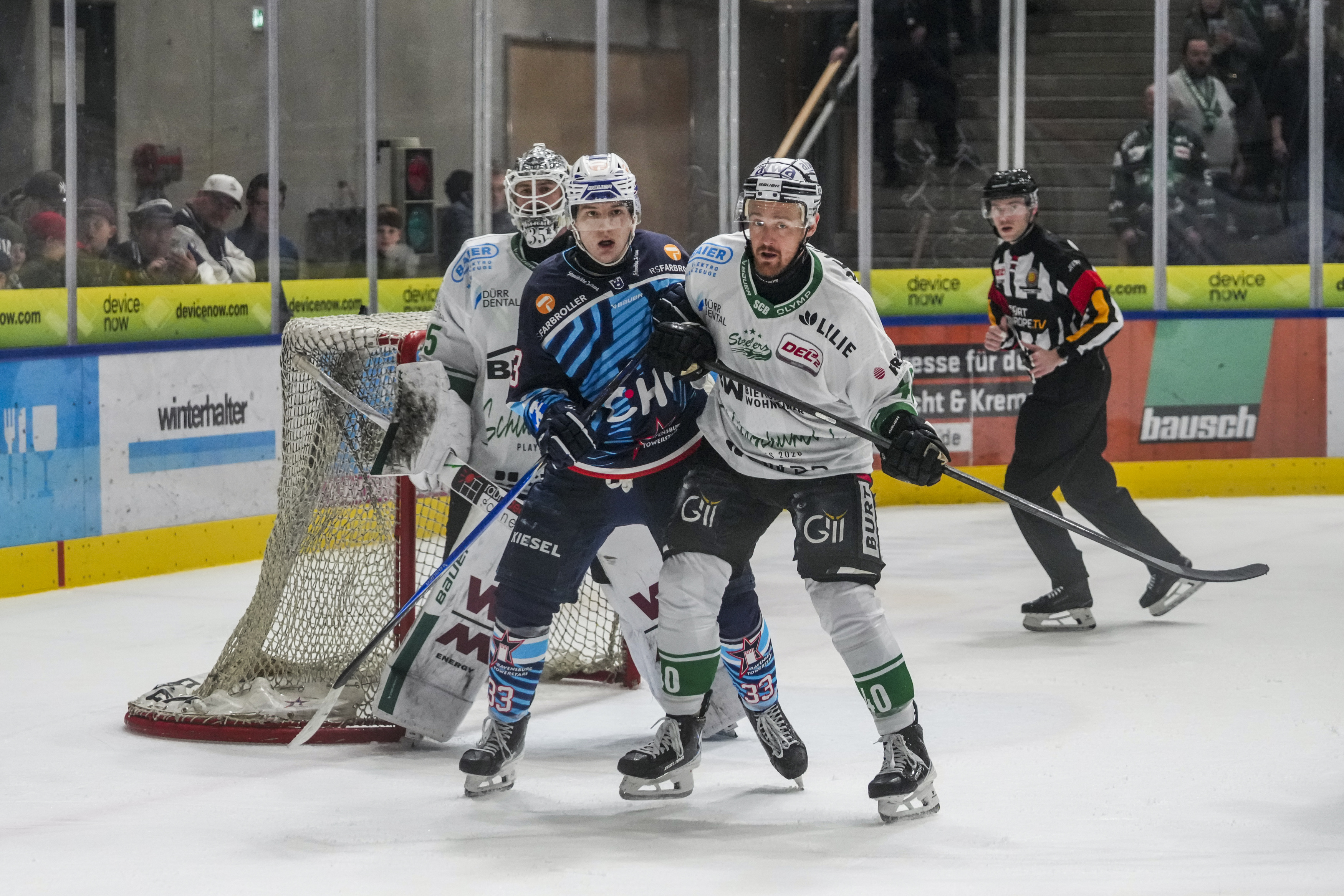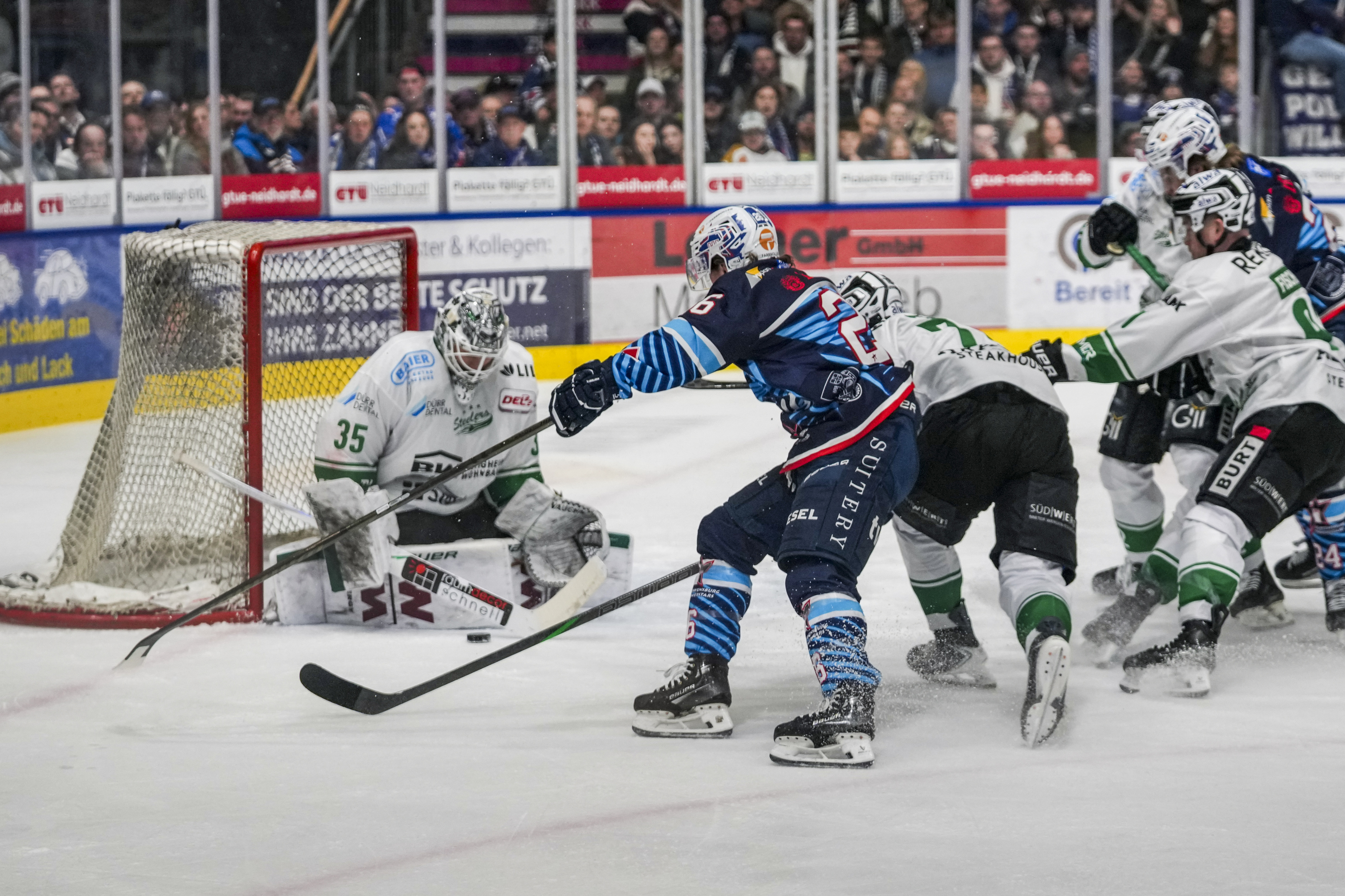 Tim Schuele (Bietigheim Steelers, #40) verteidigt gegen Nikita Kessler (Ravensburg Towerstars, #33) vor dem Tor von Olafr Schmidt (Bietigheim Steelers, #35), GER, Ravensburg Towerstars vs. Bietigheim Steelers, Eishockey, DEL2, Spielzeit 2025/2026, Playoff Viertelfinale, Spiel 3, 22.03.26 Foto: Maximilian Rist , GER, Ravensburg Towerstars vs. Bietigheim Steelers, Eishockey, DEL2, Spielzeit 2025/2026, Playoff Viertelfinale, Spiel 3, 22.03.26 Foto: Maximilian Rist