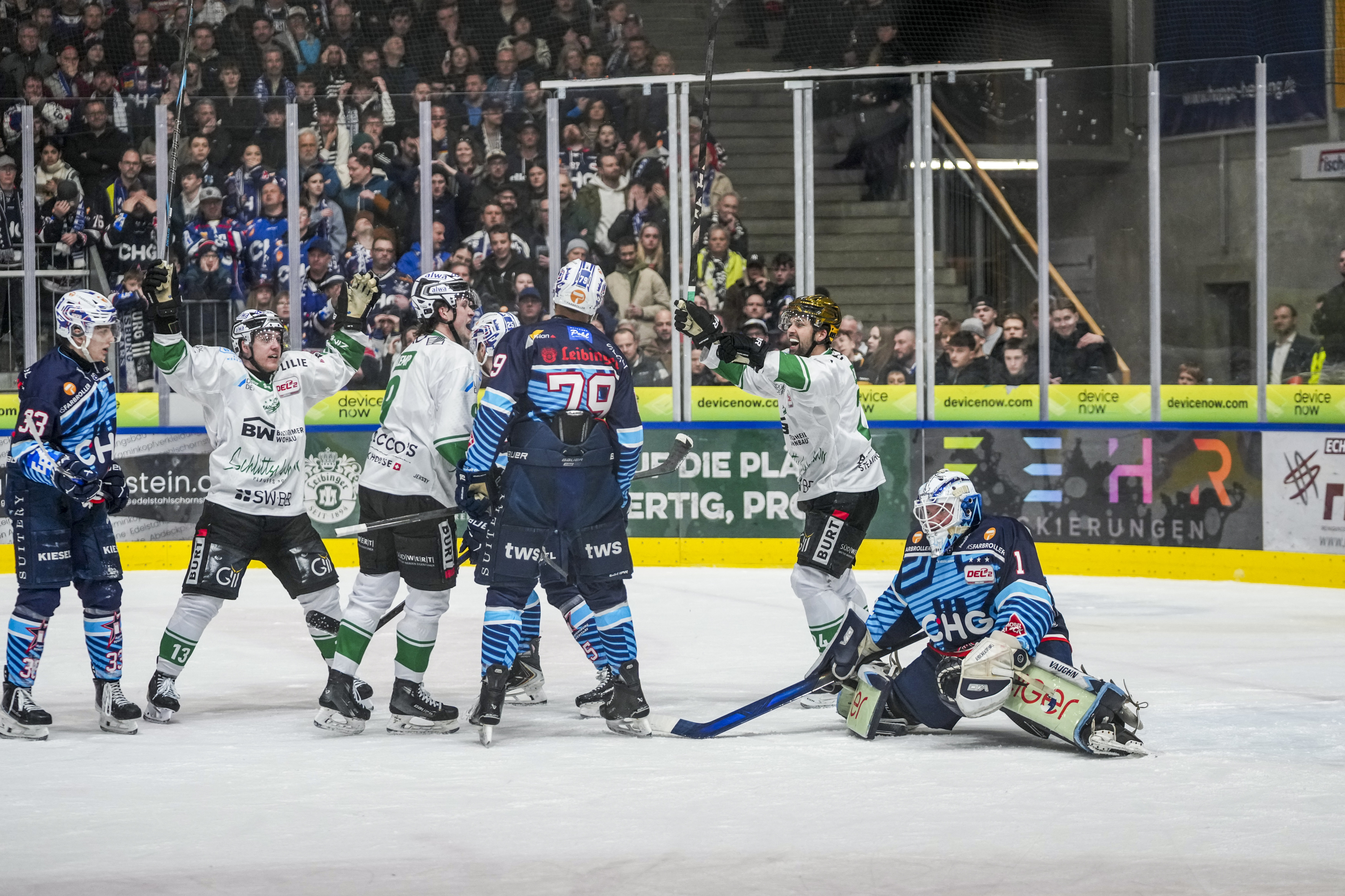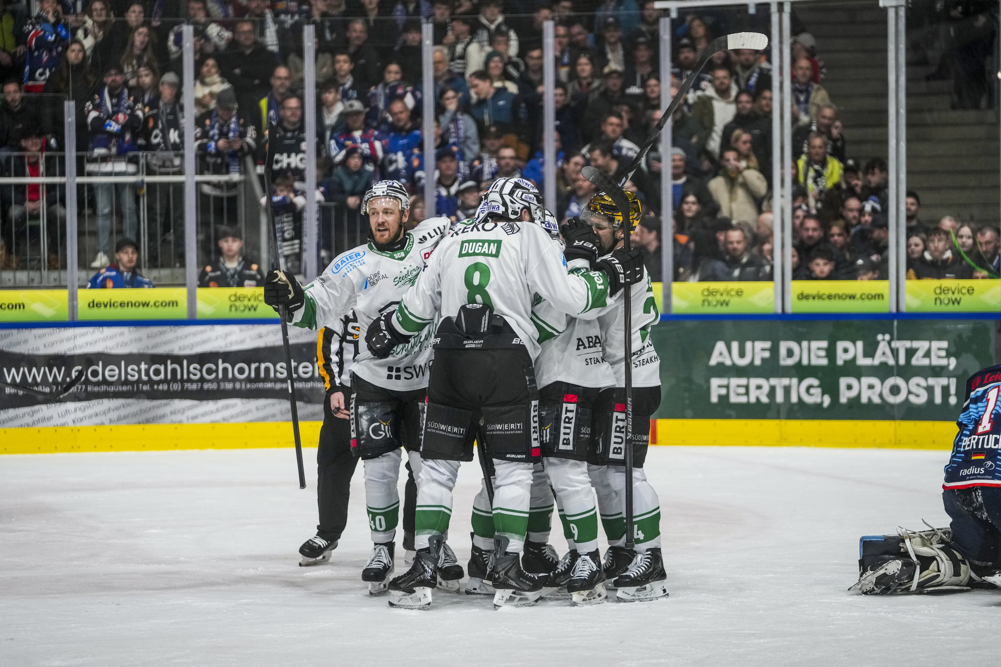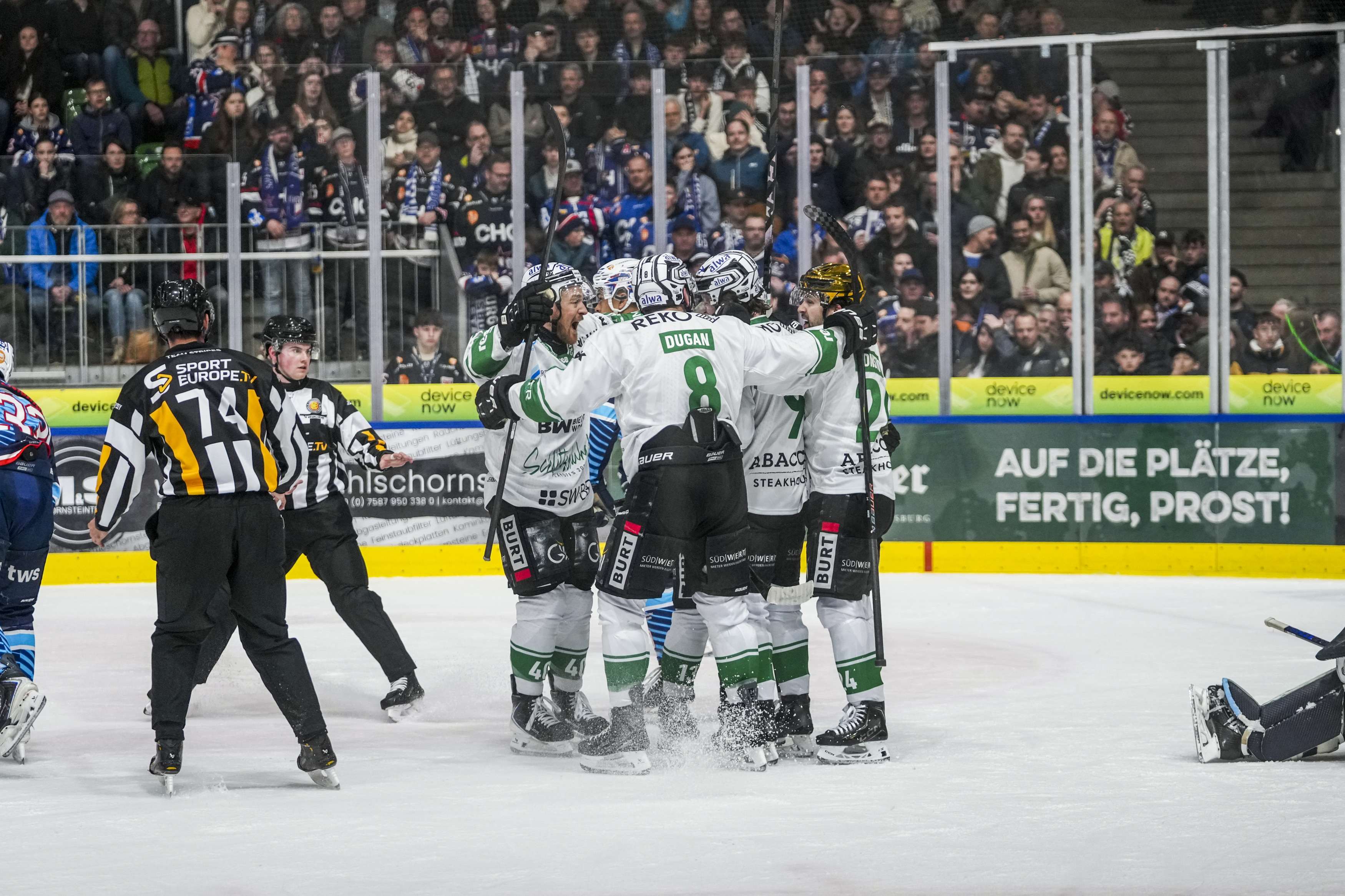Torjubel zum 0:3, GER, Ravensburg Towerstars vs. Bietigheim Steelers, Eishockey, DEL2, Spielzeit 2025/2026, Playoff Viertelfinale, Spiel 3, 22.03.26 Foto: Maximilian Rist