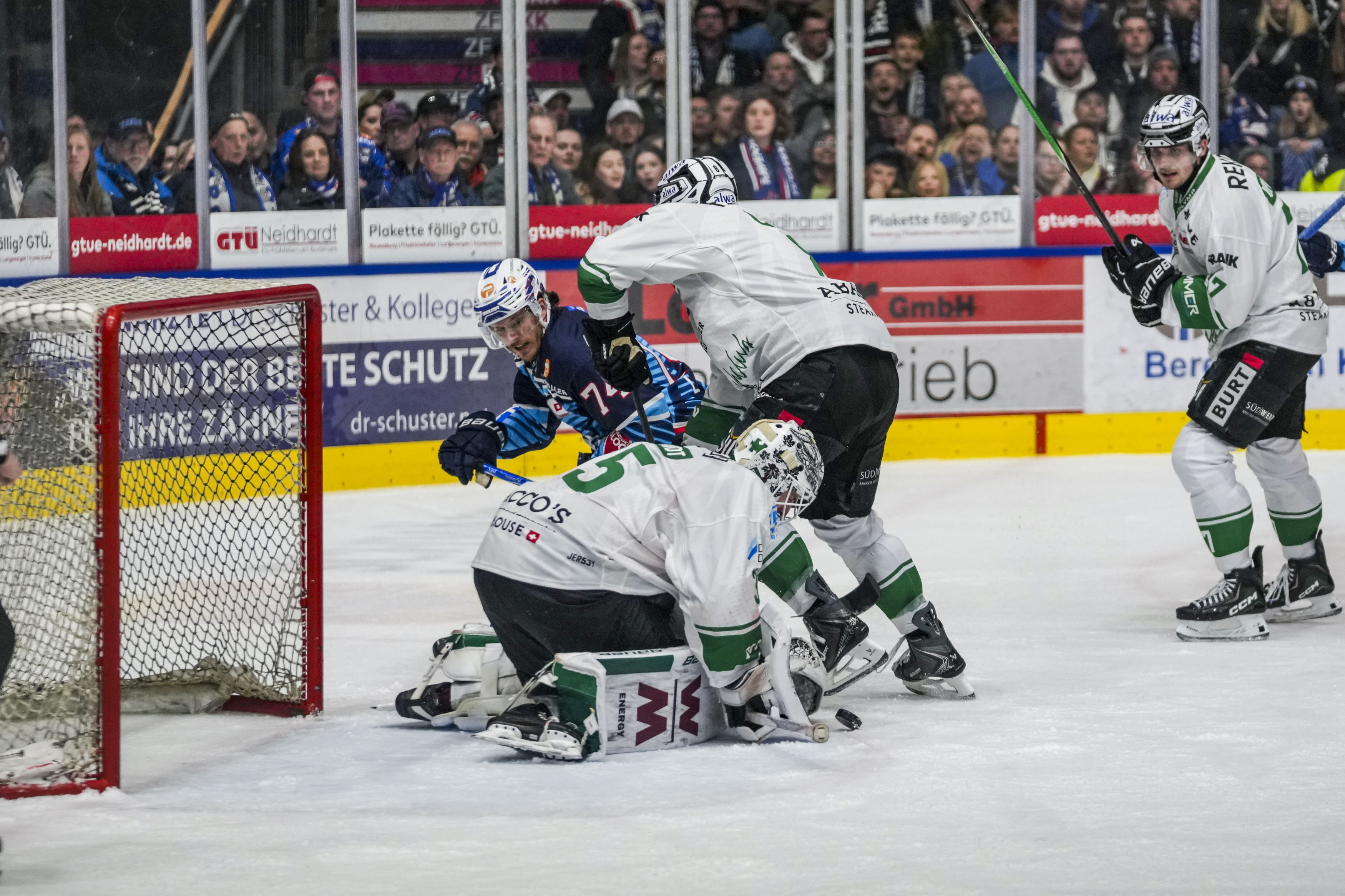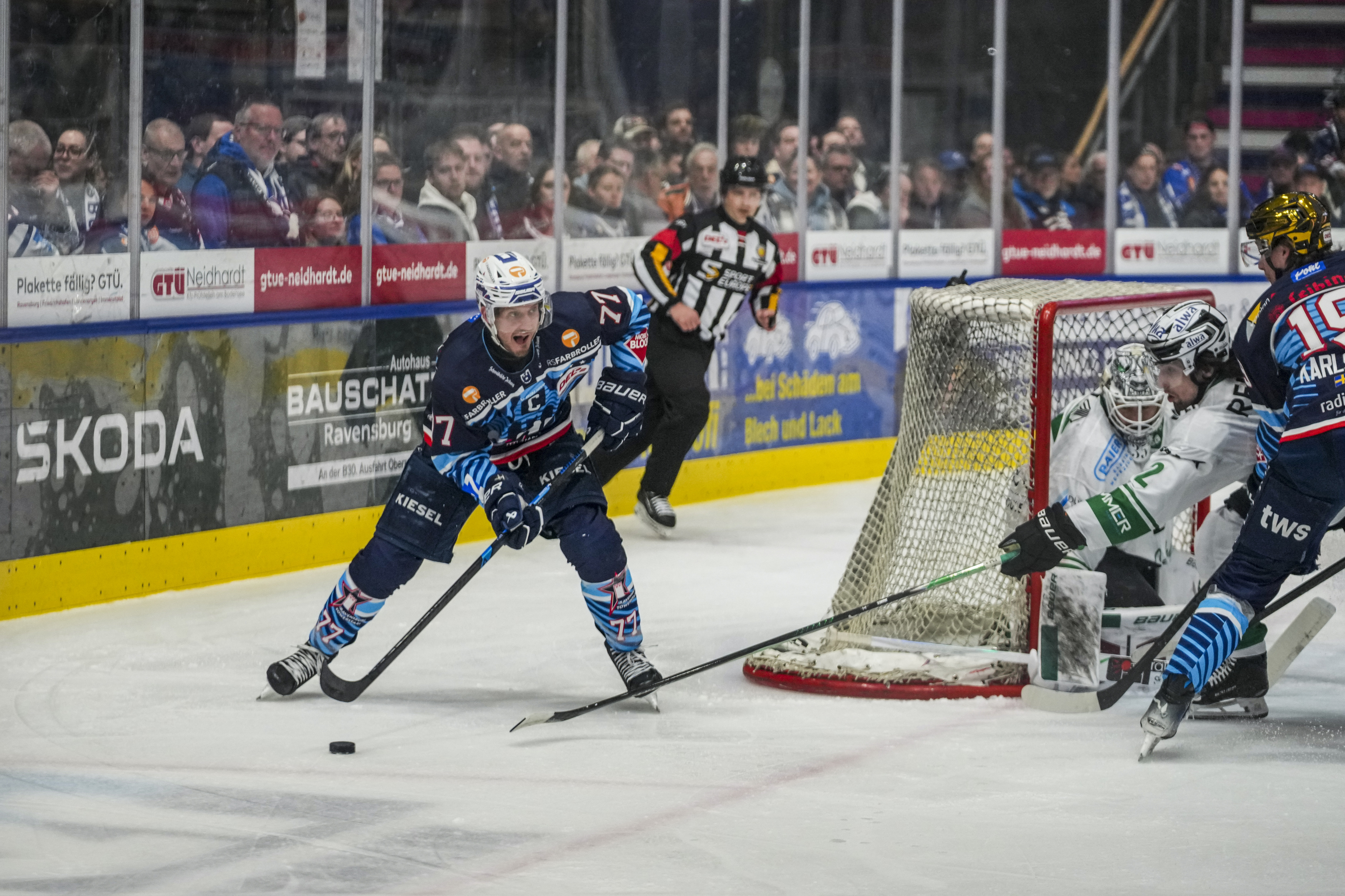 Tor zum 0:3 Louis Latta (Ravensburg Towerstars, #74) kann den Puck nicht mehr von der Linie nehmen, GER, Ravensburg Towerstars vs. Bietigheim Steelers, Eishockey, DEL2, Spielzeit 2025/2026, Playoff Viertelfinale, Spiel 3, 22.03.26 Foto: Maximilian Rist