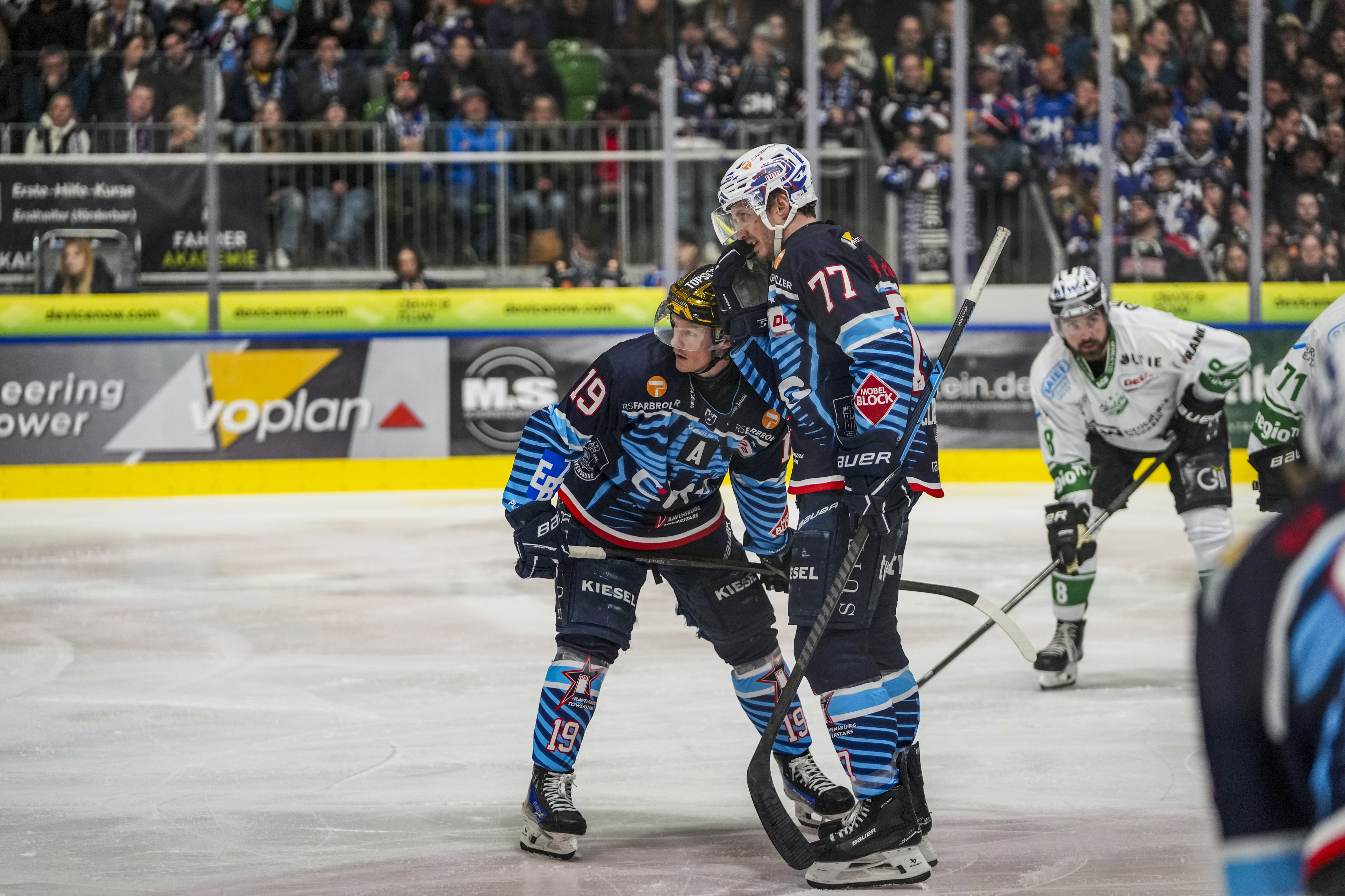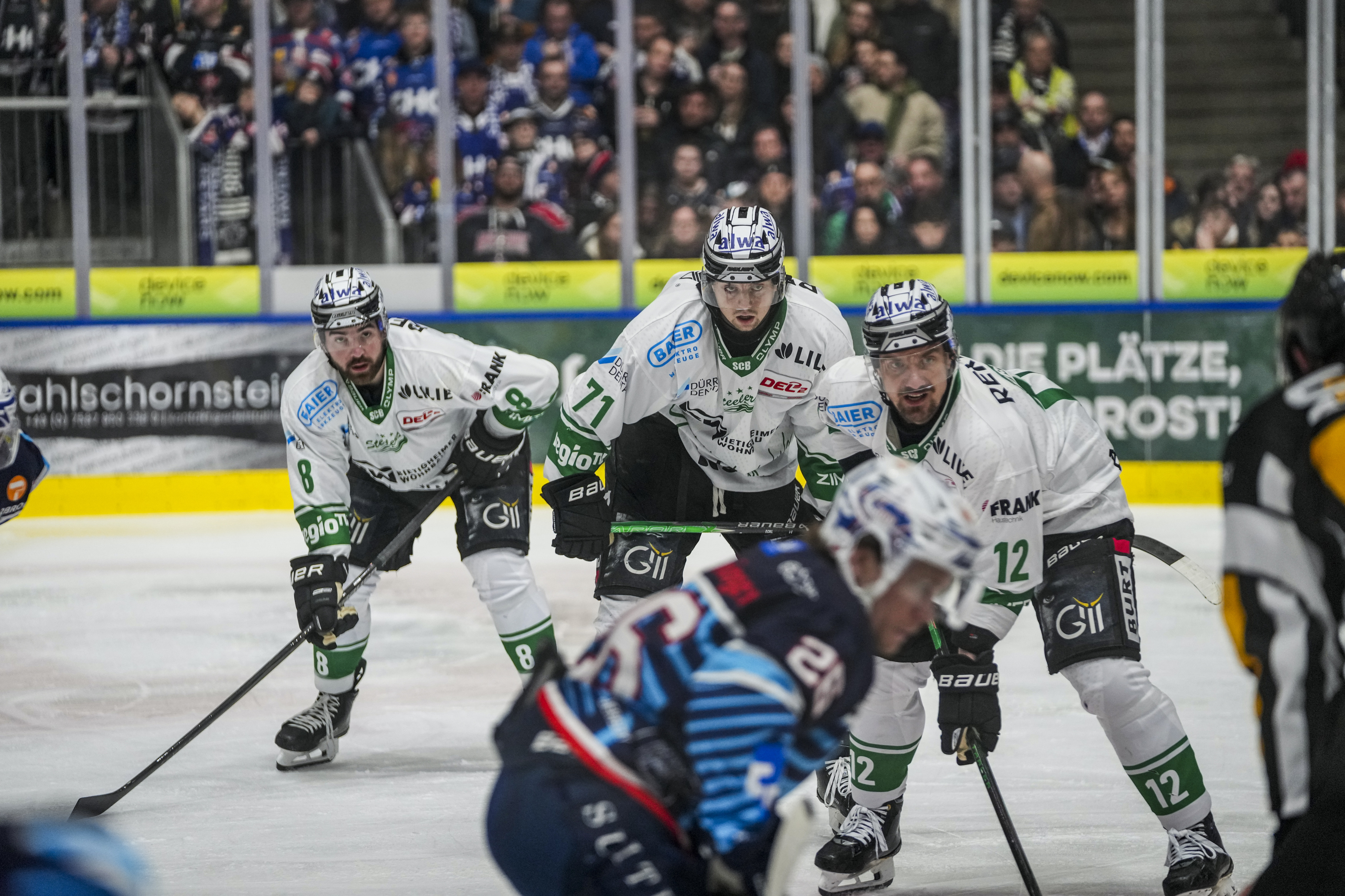Jack Dugan (Bietigheim Steelers, #8) Bastian Eckl (Bietigheim Steelers, #71) und Pawel Dronia (Bietigheim Steelers, #12), GER, Ravensburg Towerstars vs. Bietigheim Steelers, Eishockey, DEL2, Spielzeit 2025/2026, Playoff Viertelfinale, Spiel 3, 22.03.26 Foto: Maximilian Rist , GER, Ravensburg Towerstars vs. Bietigheim Steelers, Eishockey, DEL2, Spielzeit 2025/2026, Playoff Viertelfinale, Spiel 3, 22.03.26 Foto: Maximilian Rist