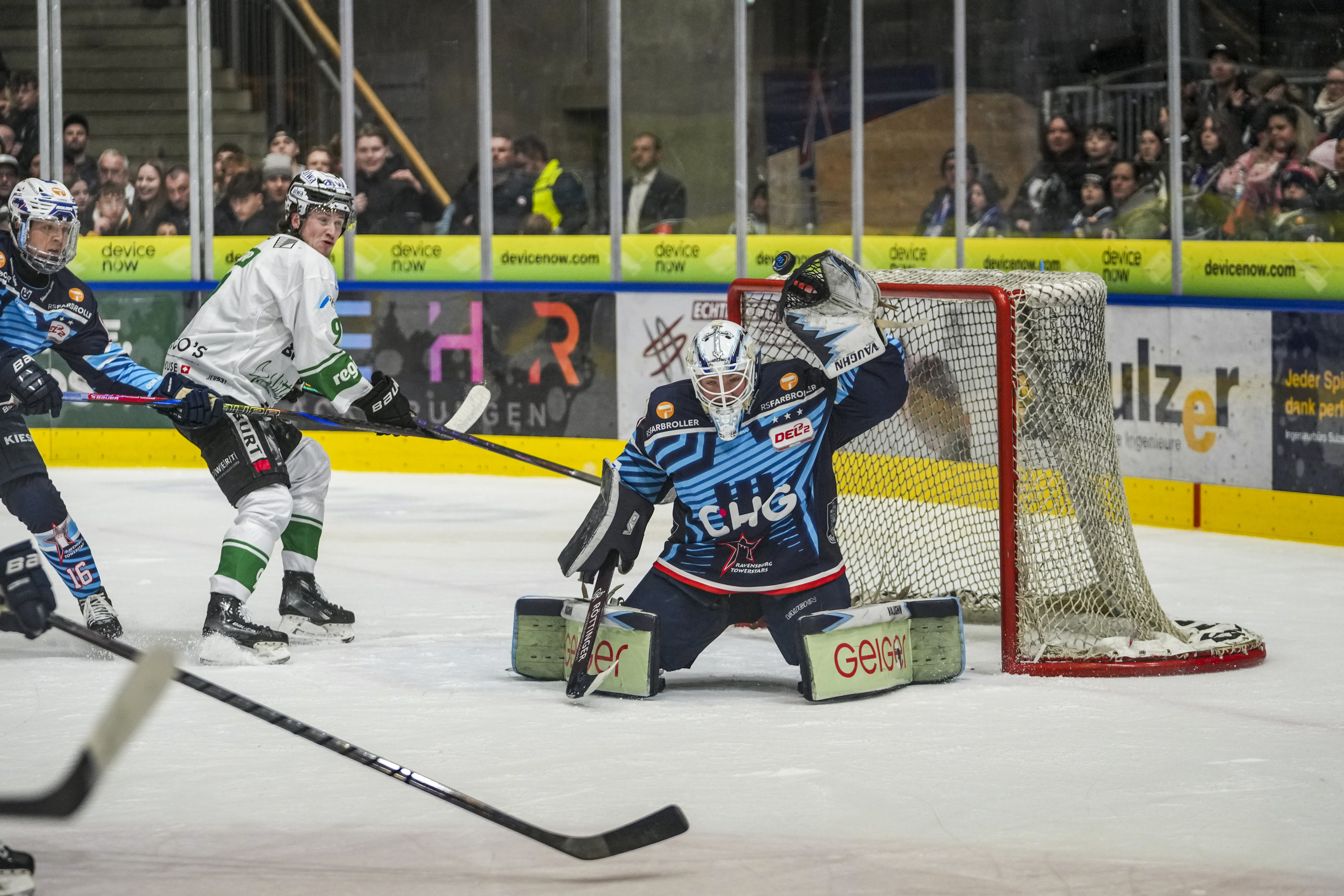 Robbie Czarnik (Ravensburg Towerstars, #77) hinter de Tor von Olafr Schmidt (Bietigheim Steelers, #35), GER, Ravensburg Towerstars vs. Bietigheim Steelers, Eishockey, DEL2, Spielzeit 2025/2026, Playoff Viertelfinale, Spiel 3, 22.03.26 Foto: Maximilian Rist
