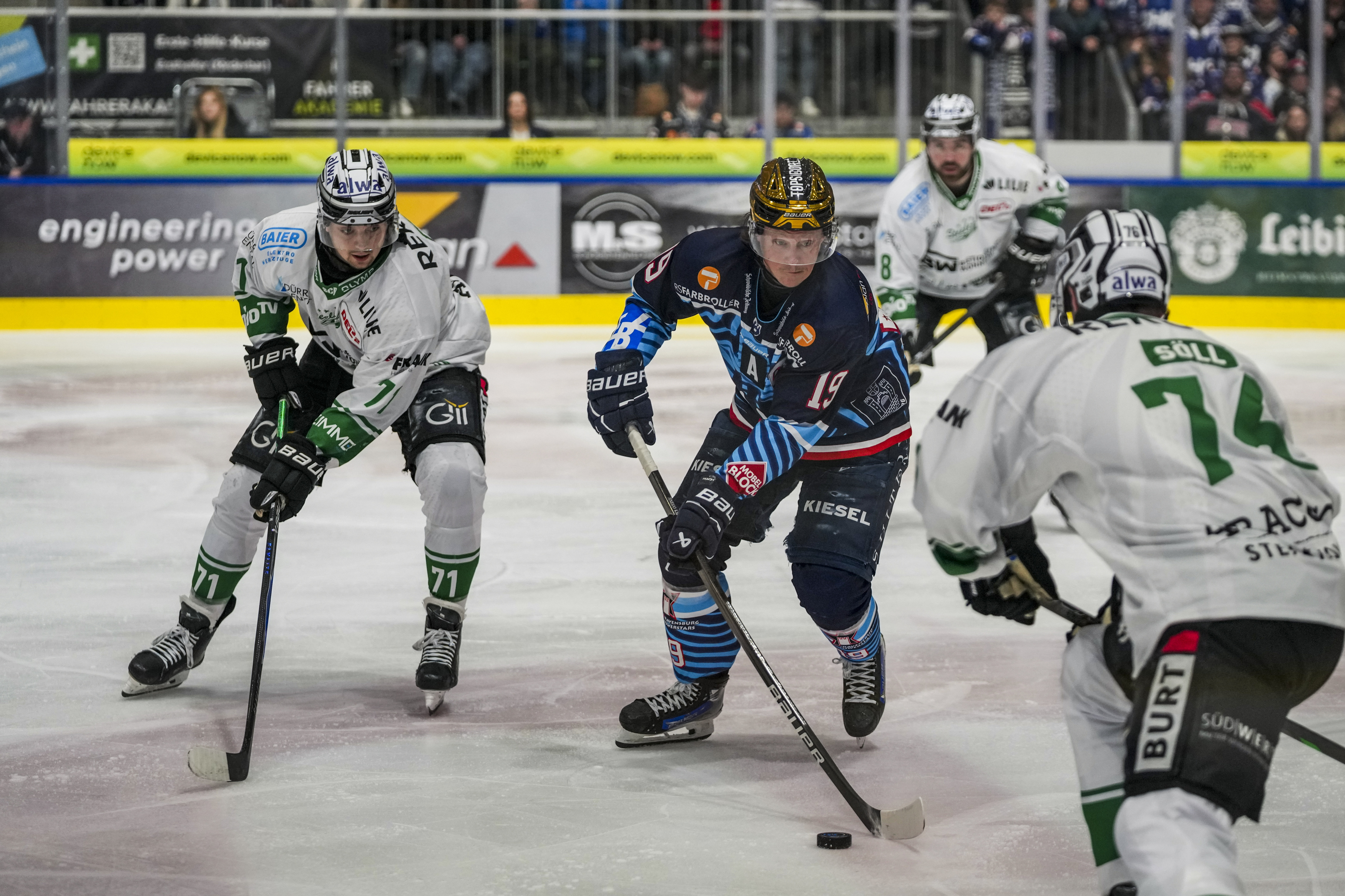 Erik Jinesjoe Karlsson (Ravensburg Towerstars, #19) gegen Bastian Eckl (Bietigheim Steelers, #71), GER, Ravensburg Towerstars vs. Bietigheim Steelers, Eishockey, DEL2, Spielzeit 2025/2026, Playoff Viertelfinale, Spiel 3, 22.03.26 Foto: Maximilian Rist , GER, Ravensburg Towerstars vs. Bietigheim Steelers, Eishockey, DEL2, Spielzeit 2025/2026, Playoff Viertelfinale, Spiel 3, 22.03.26 Foto: Maximilian Rist