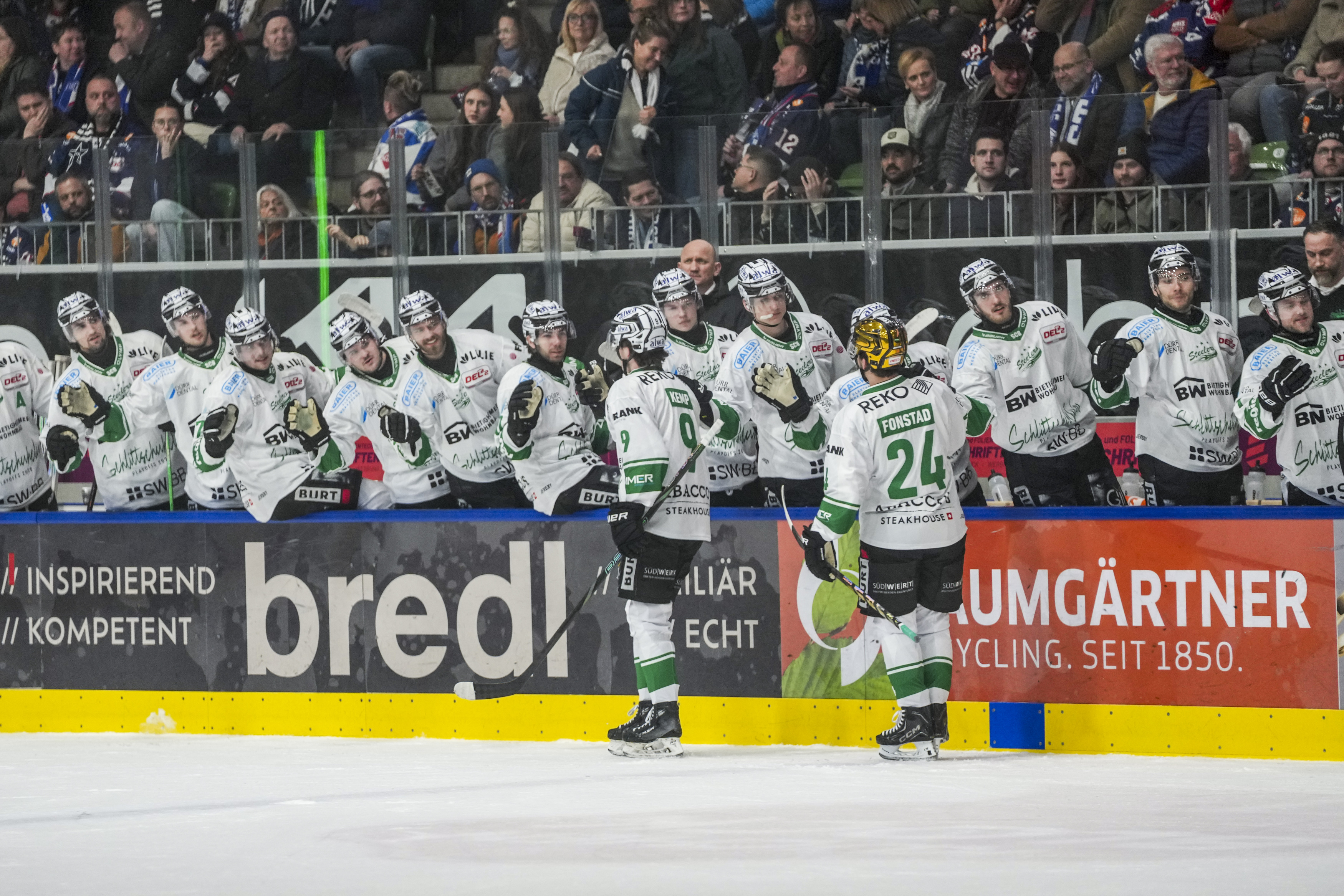 Brett Kemp (Bietigheim Steelers, #9) beim Abklatschen an der Bank nach seinem Tor zum 0:3 mit Cole Fonstad (Bietigheim Steelers, #24), GER, Ravensburg Towerstars vs. Bietigheim Steelers, Eishockey, DEL2, Spielzeit 2025/2026, Playoff Viertelfinale, Spiel 3, 22.03.26 Foto: Maximilian Rist