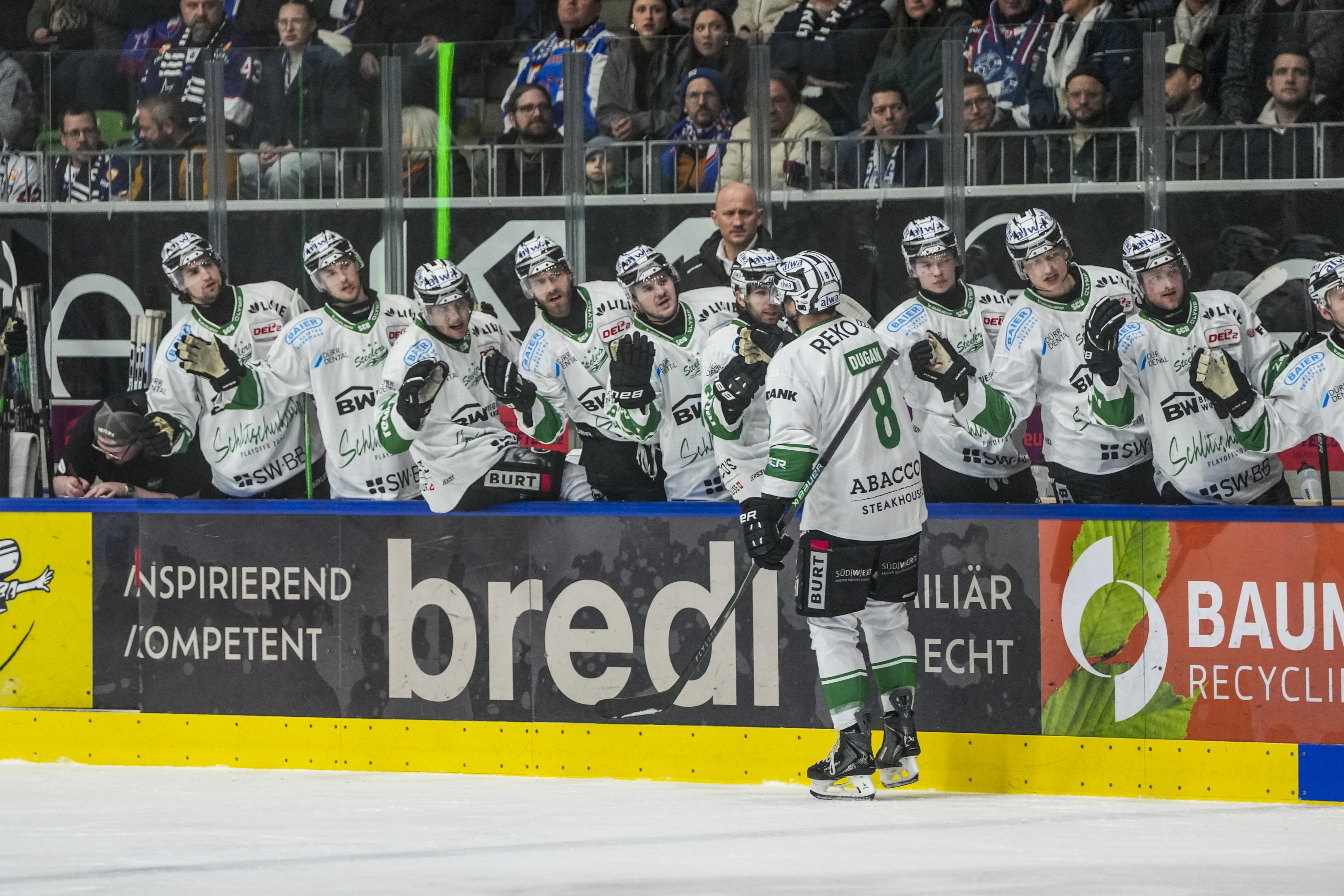 Jack Dugan (Bietigheim Steelers, #8) beim Abklatschen an der Bank nach seinem Tor zum 0:2, GER, Ravensburg Towerstars vs. Bietigheim Steelers, Eishockey, DEL2, Spielzeit 2025/2026, Playoff Viertelfinale, Spiel 3, 22.03.26 Foto: Maximilian Rist