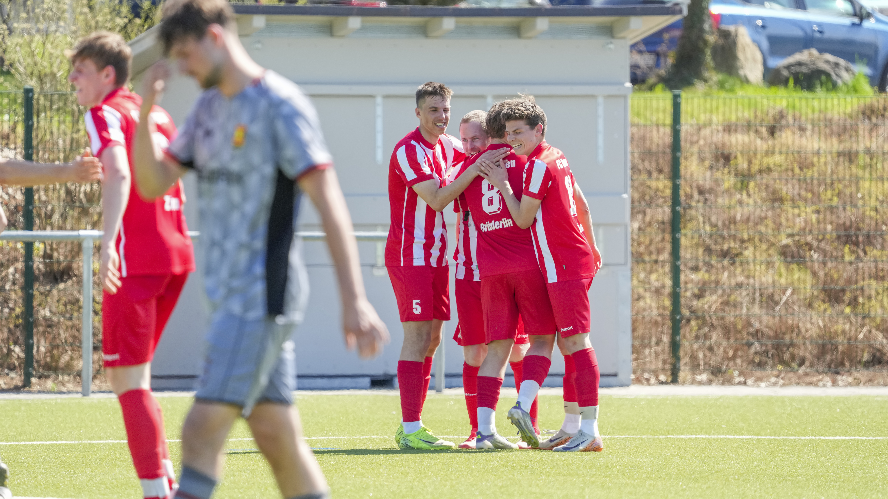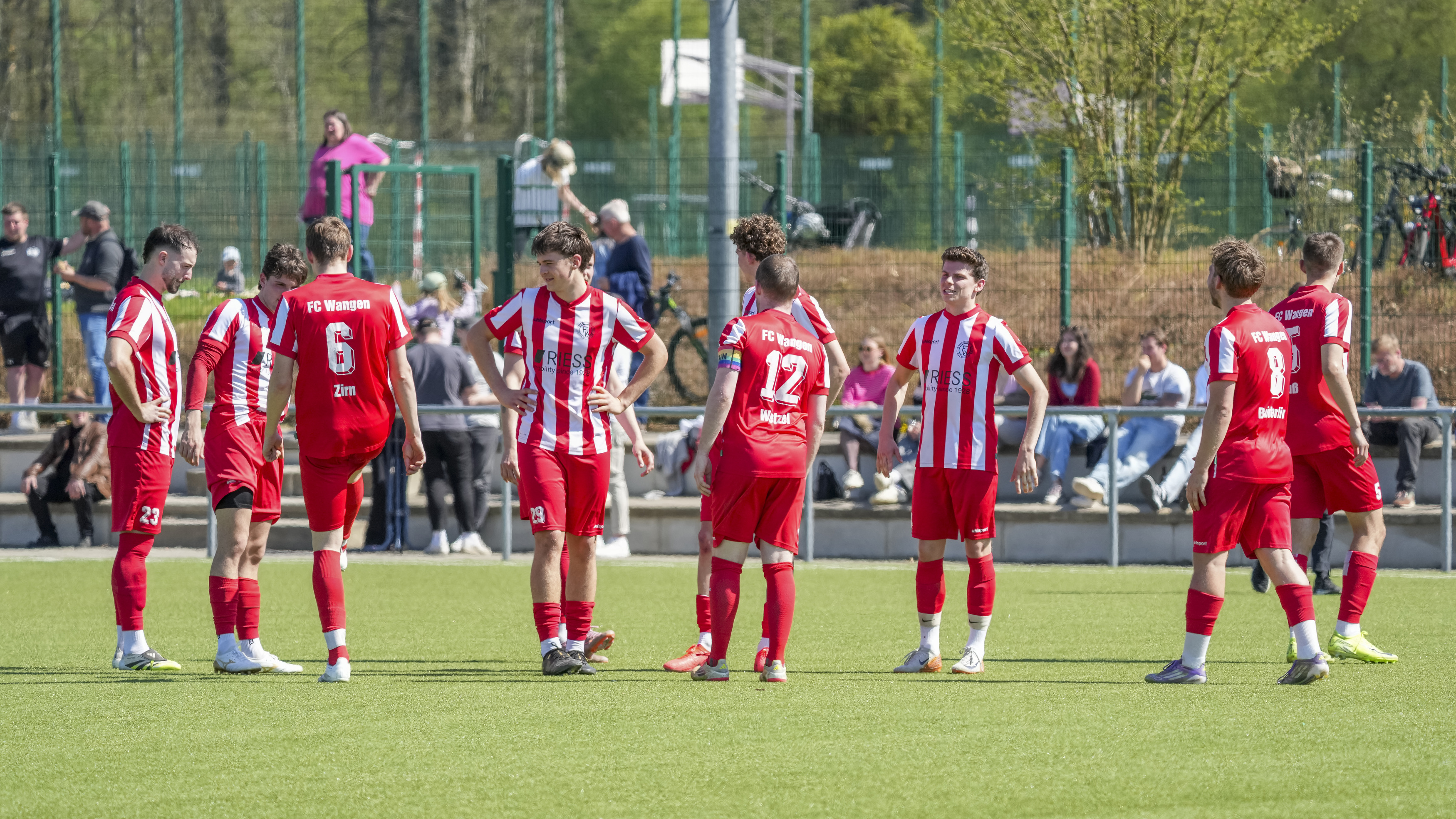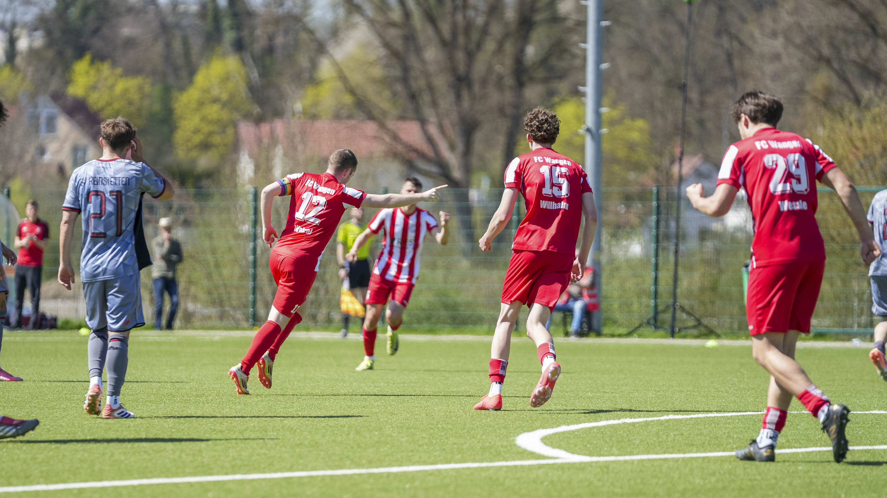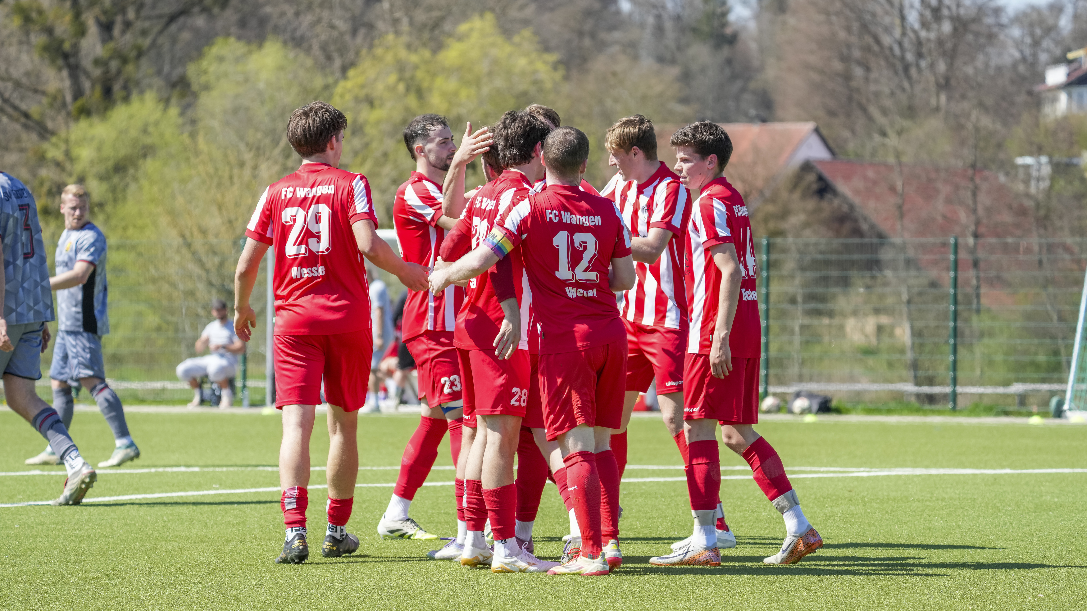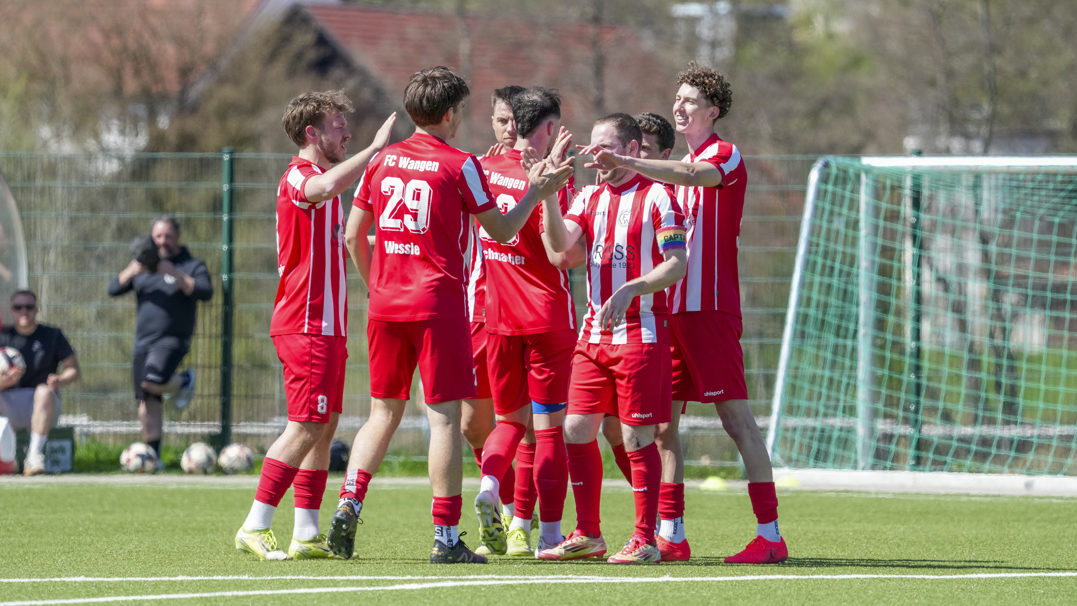 Torjubel zum 3:0 von Simon Wetzel (FC Wangen, #12) und Mannschaft, GER, FC Wangen vs. SV Reinstetten, Fussball, Landesliga, 26. Spieltag, Spielzeit 2025/2026, 11.04.26 Foto: Maximilian Rist