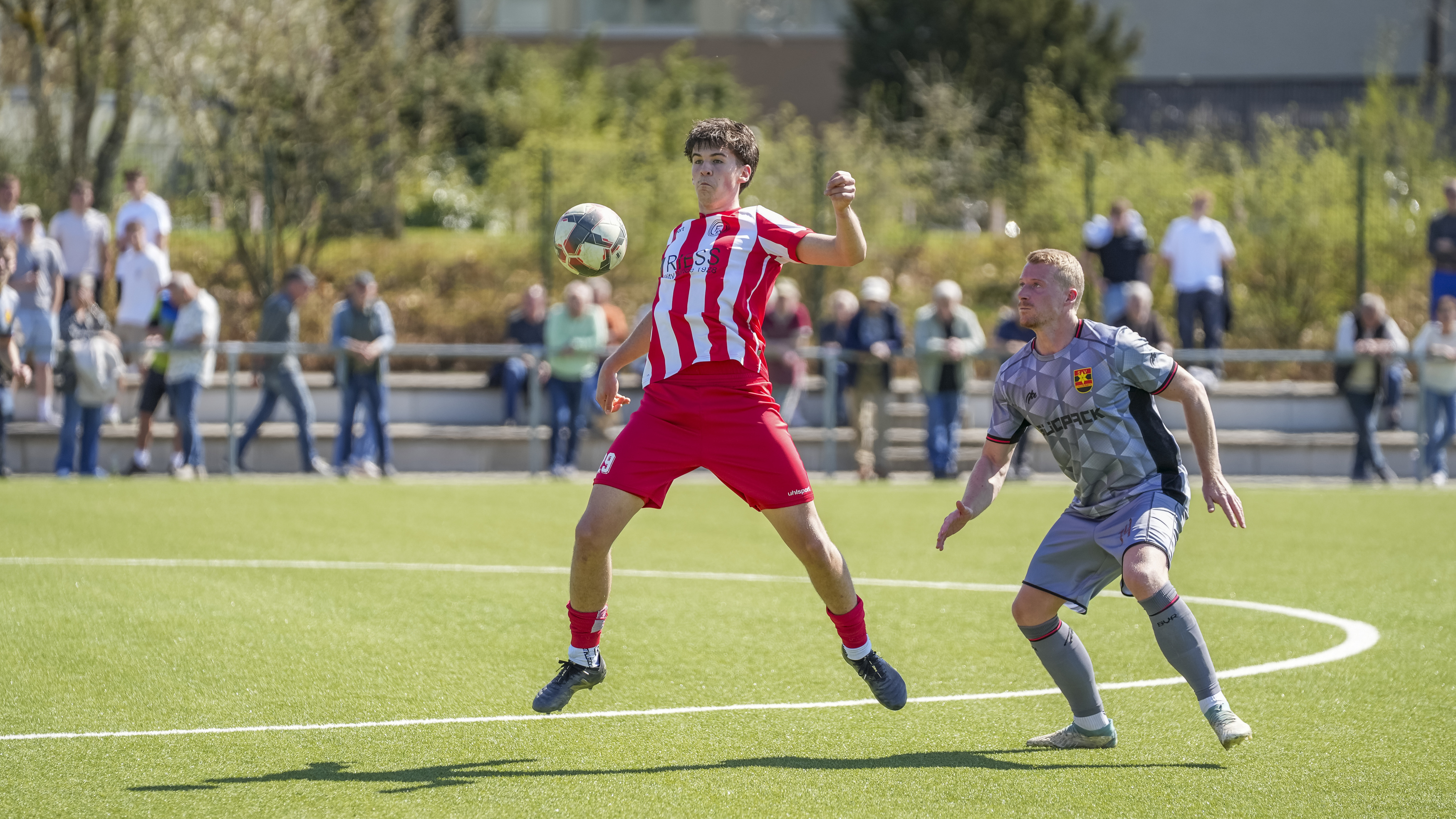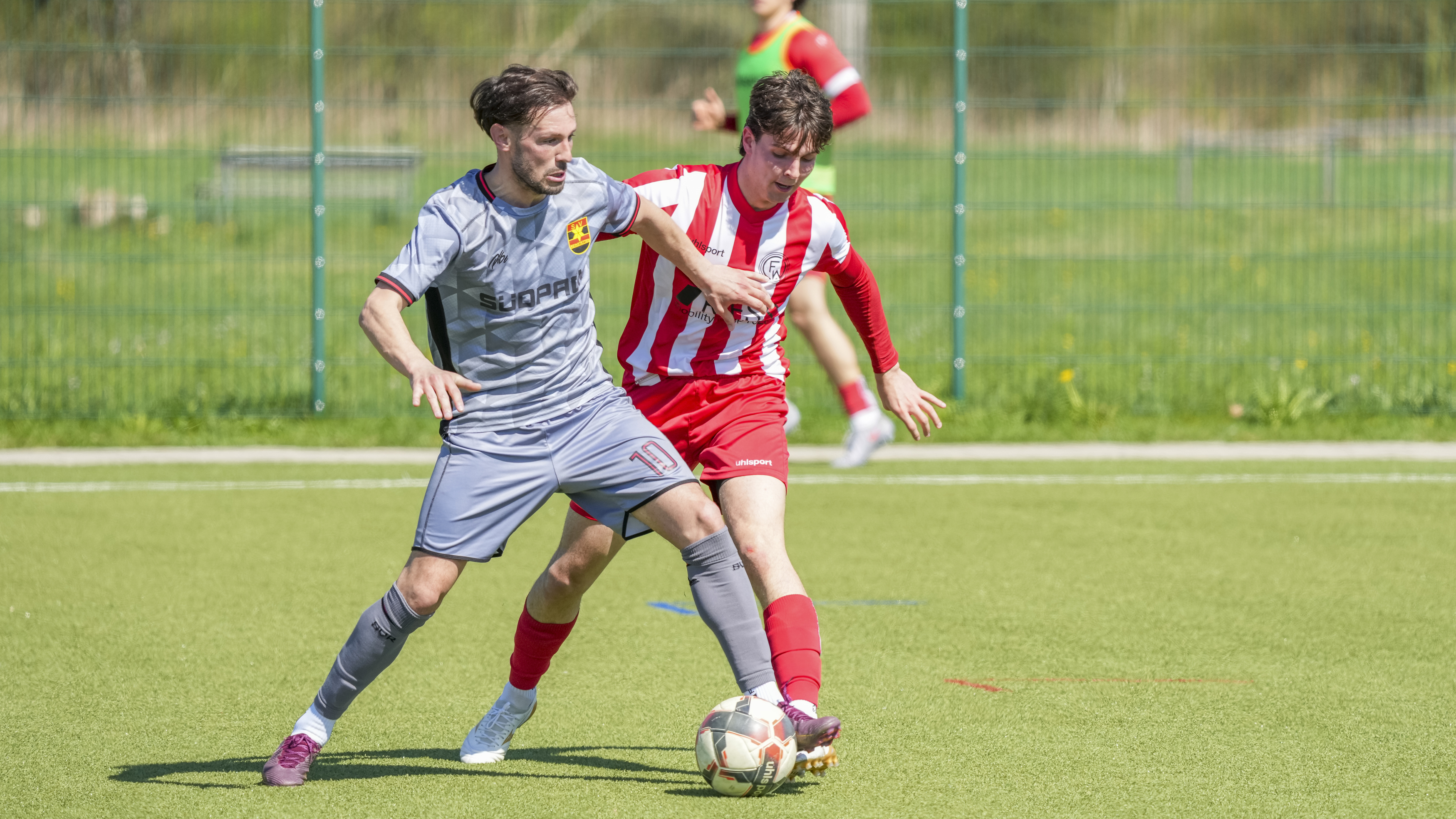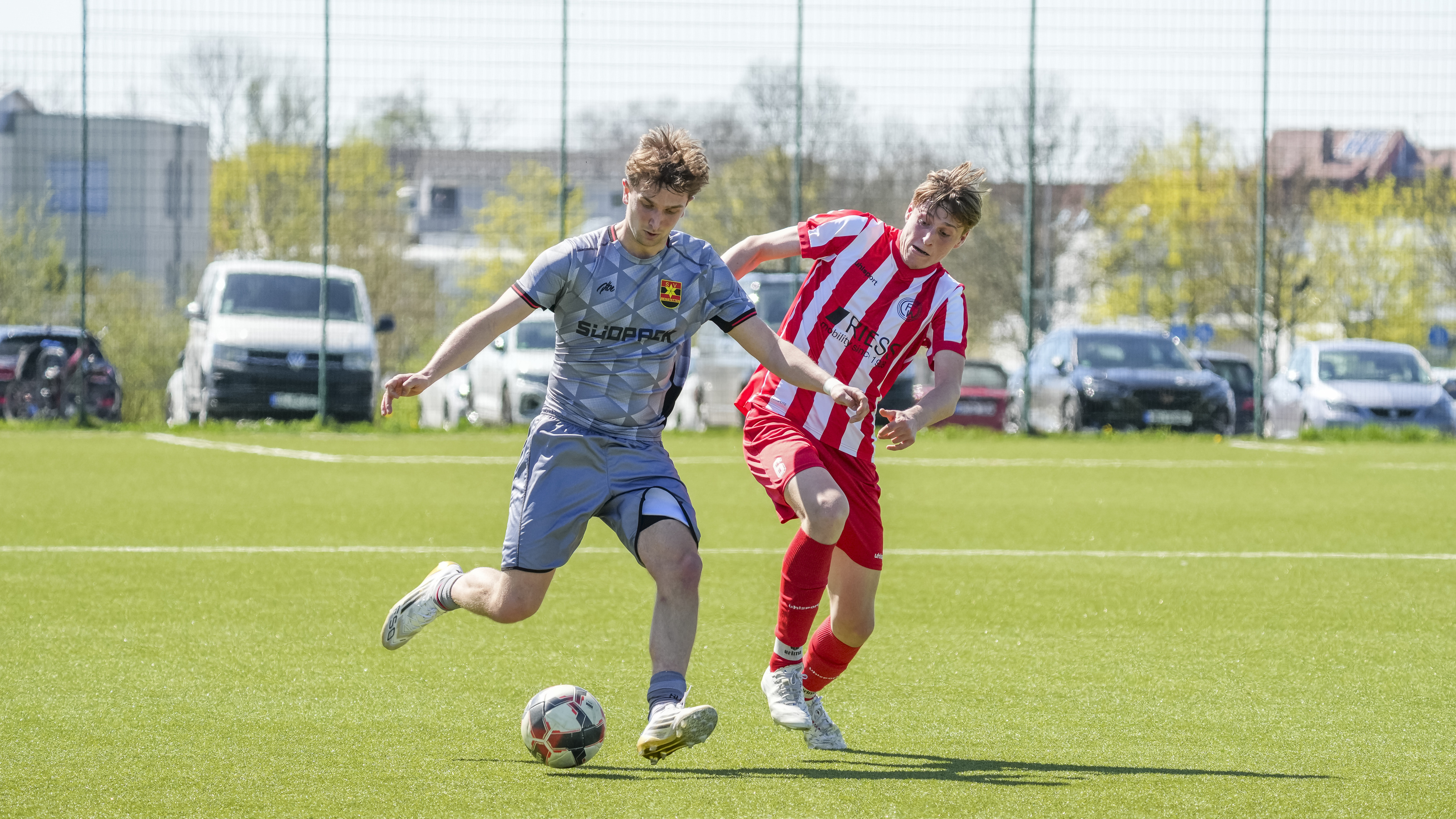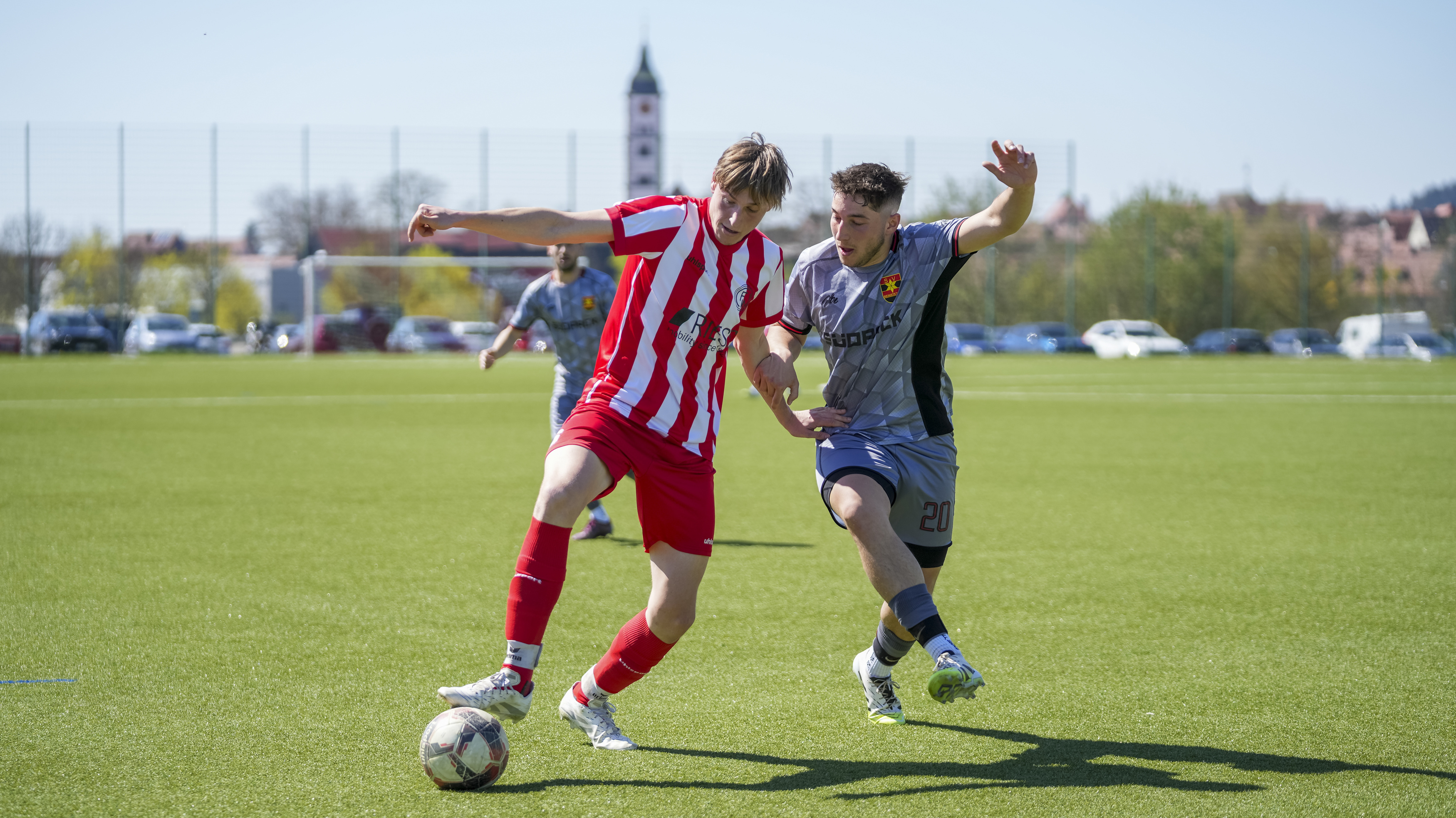 Simon Zirn (FC Wangen, #6) gegen Elias Hampp (SV Reinstetten, #20), GER, FC Wangen vs. SV Reinstetten, Fussball, Landesliga, 26. Spieltag, Spielzeit 2025/2026, 11.04.26 Foto: Maximilian Rist