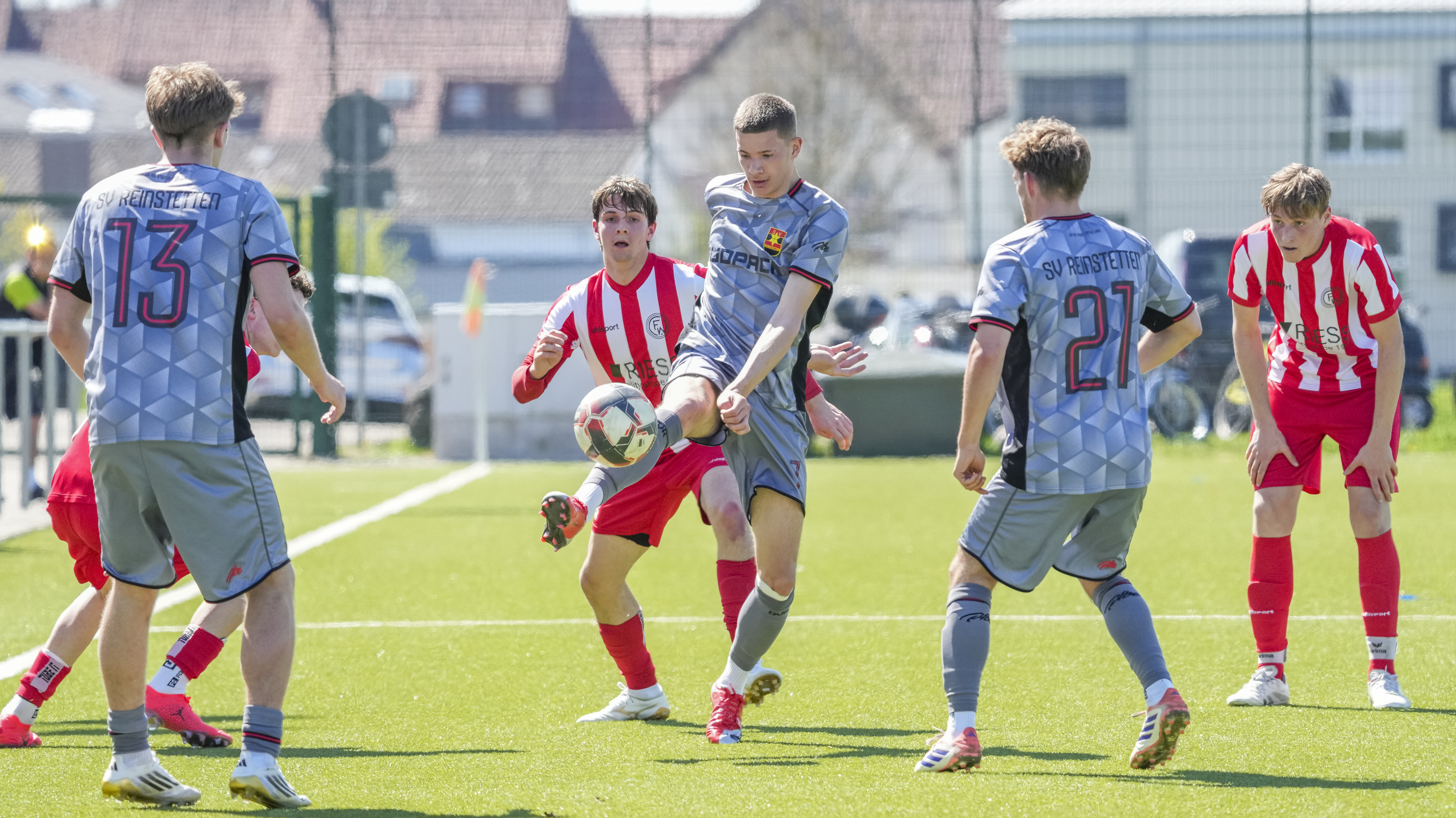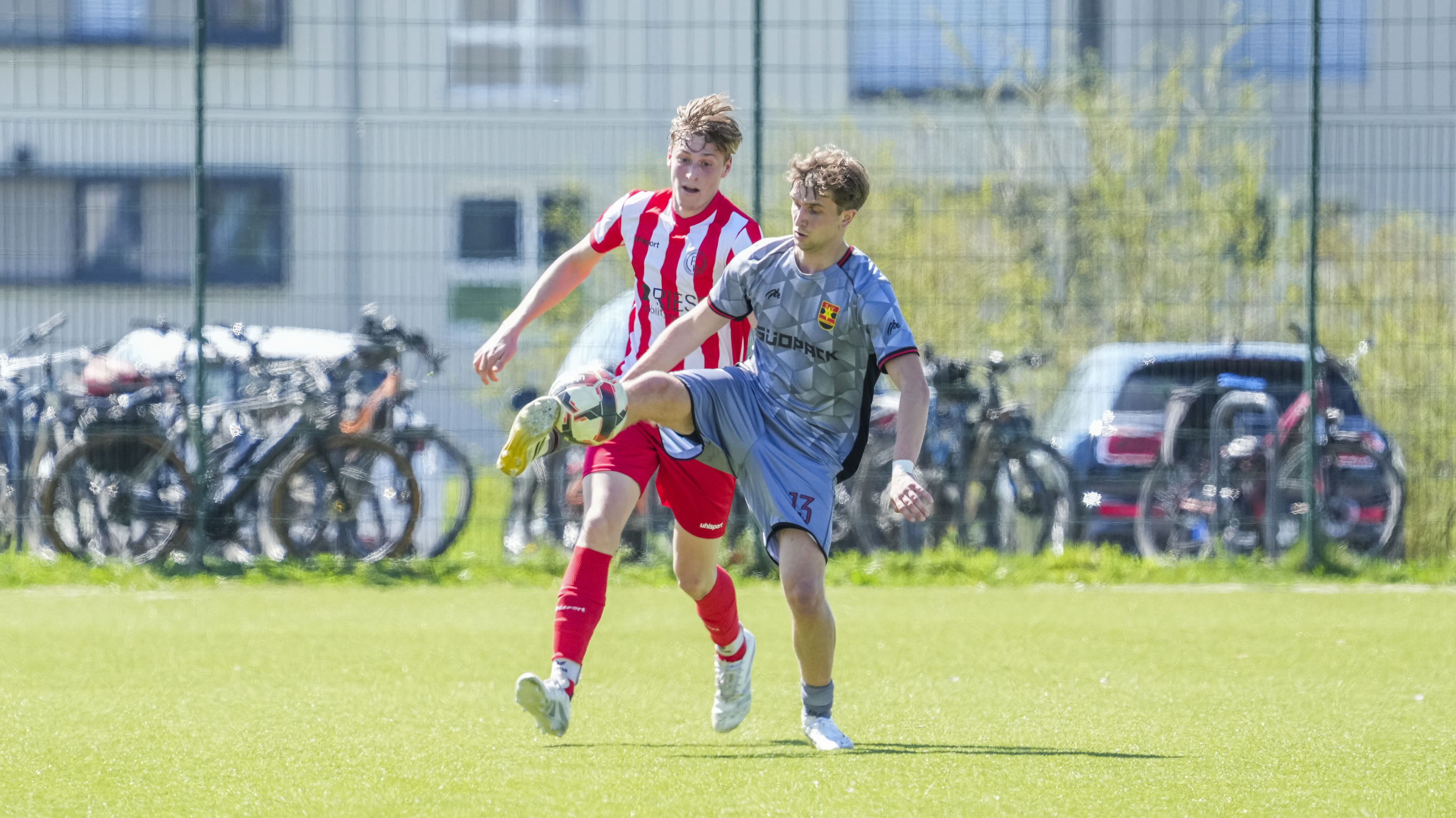 Luca Dewald (SV Reinstetten, #13) gegen Simon Zirn (FC Wangen, #6), GER, FC Wangen vs. SV Reinstetten, Fussball, Landesliga, 26. Spieltag, Spielzeit 2025/2026, 11.04.26 Foto: Maximilian Rist