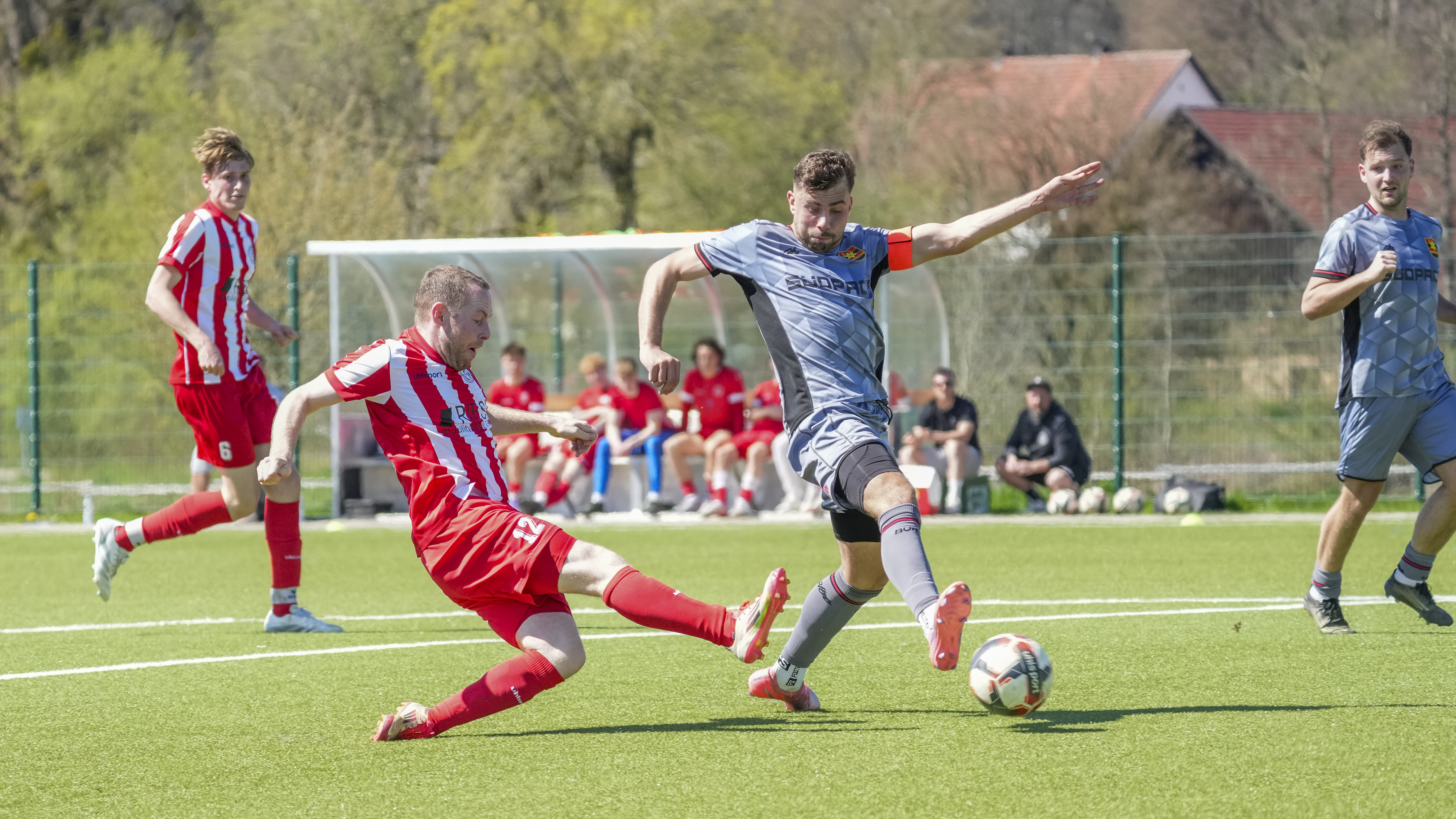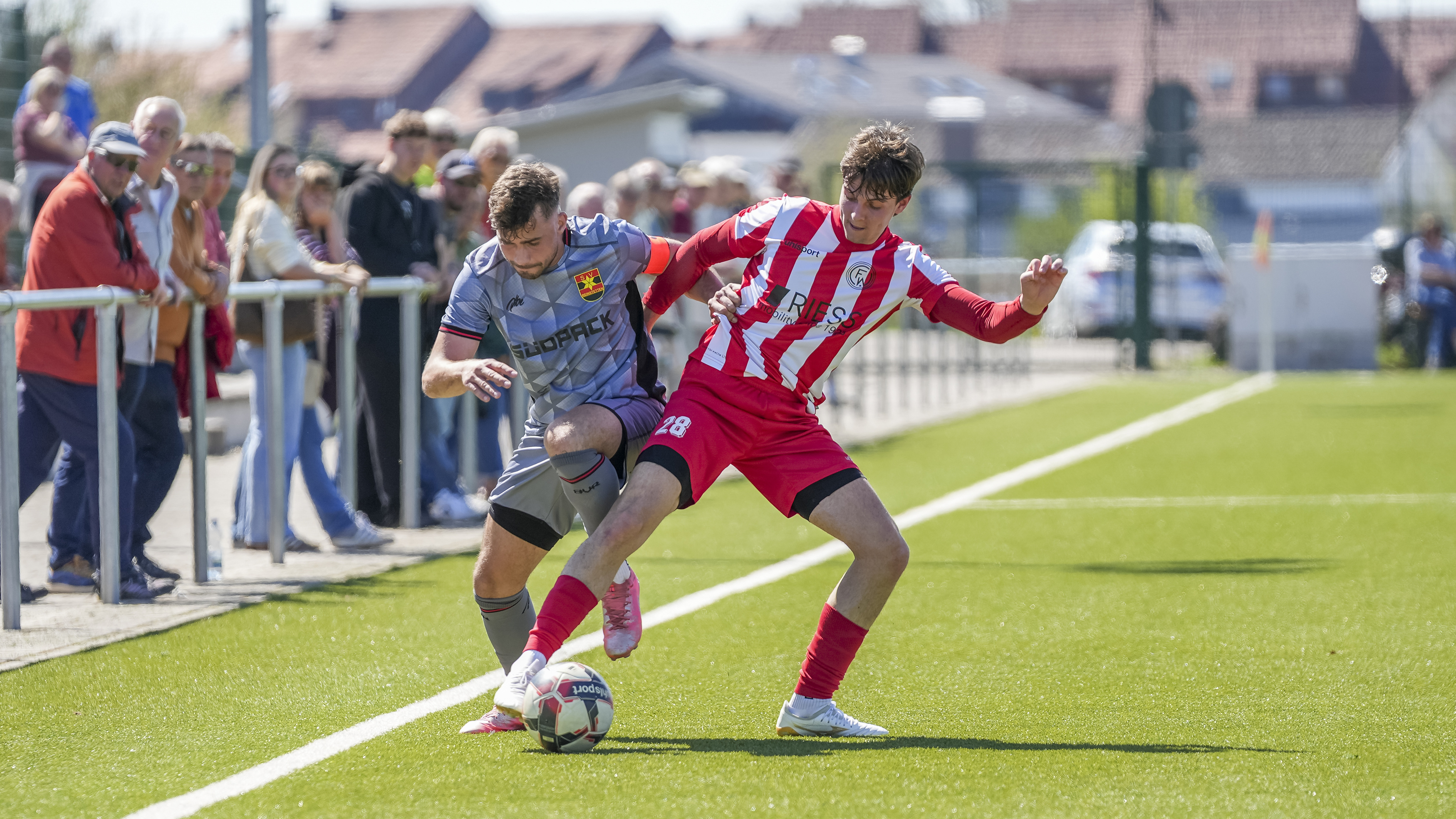 Simon Straub (FC Wangen, #28) gegen Dominik Martin (SV Reinstetten, #7), GER, FC Wangen vs. SV Reinstetten, Fussball, Landesliga, 26. Spieltag, Spielzeit 2025/2026, 11.04.26 Foto: Maximilian Rist