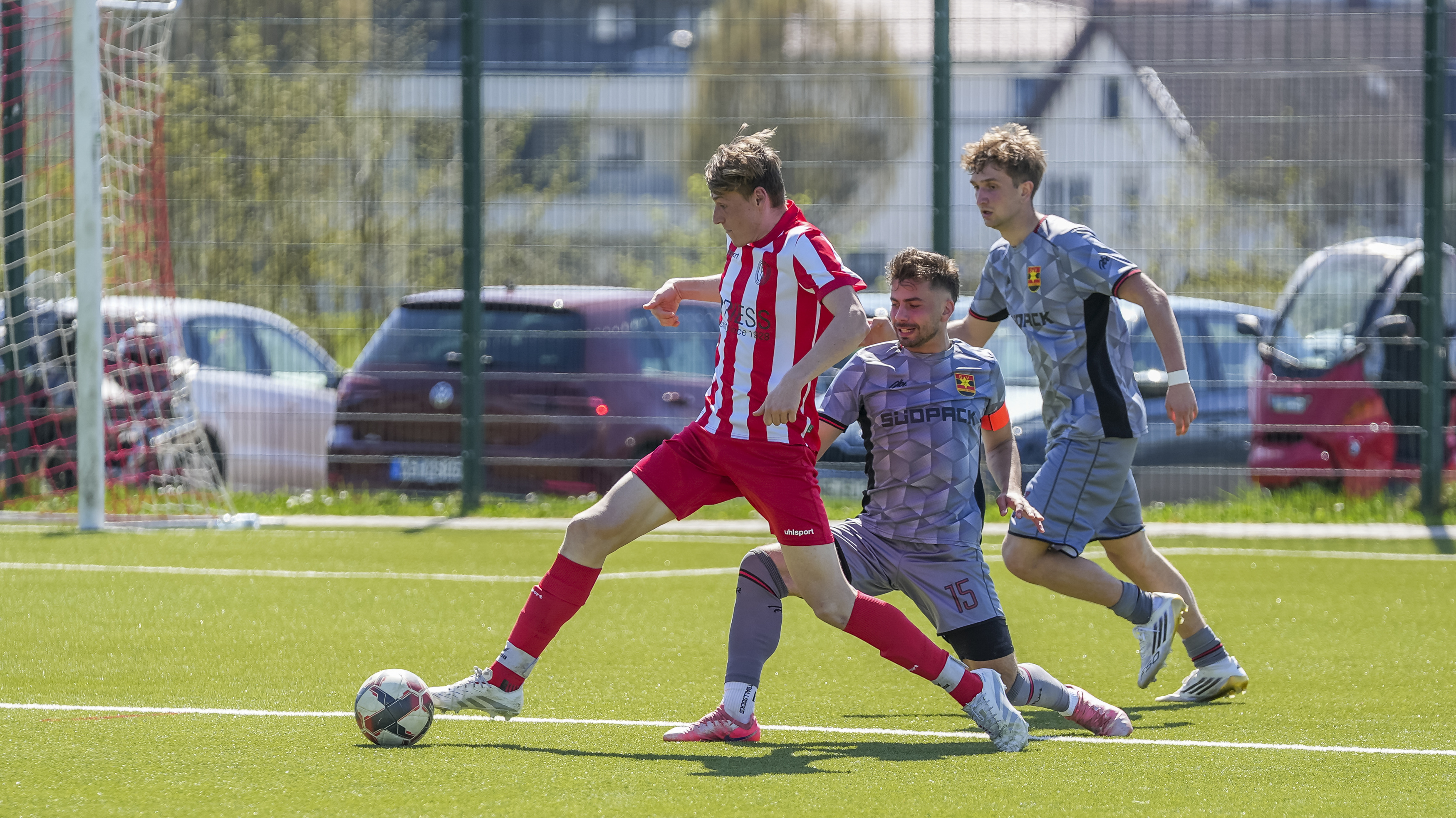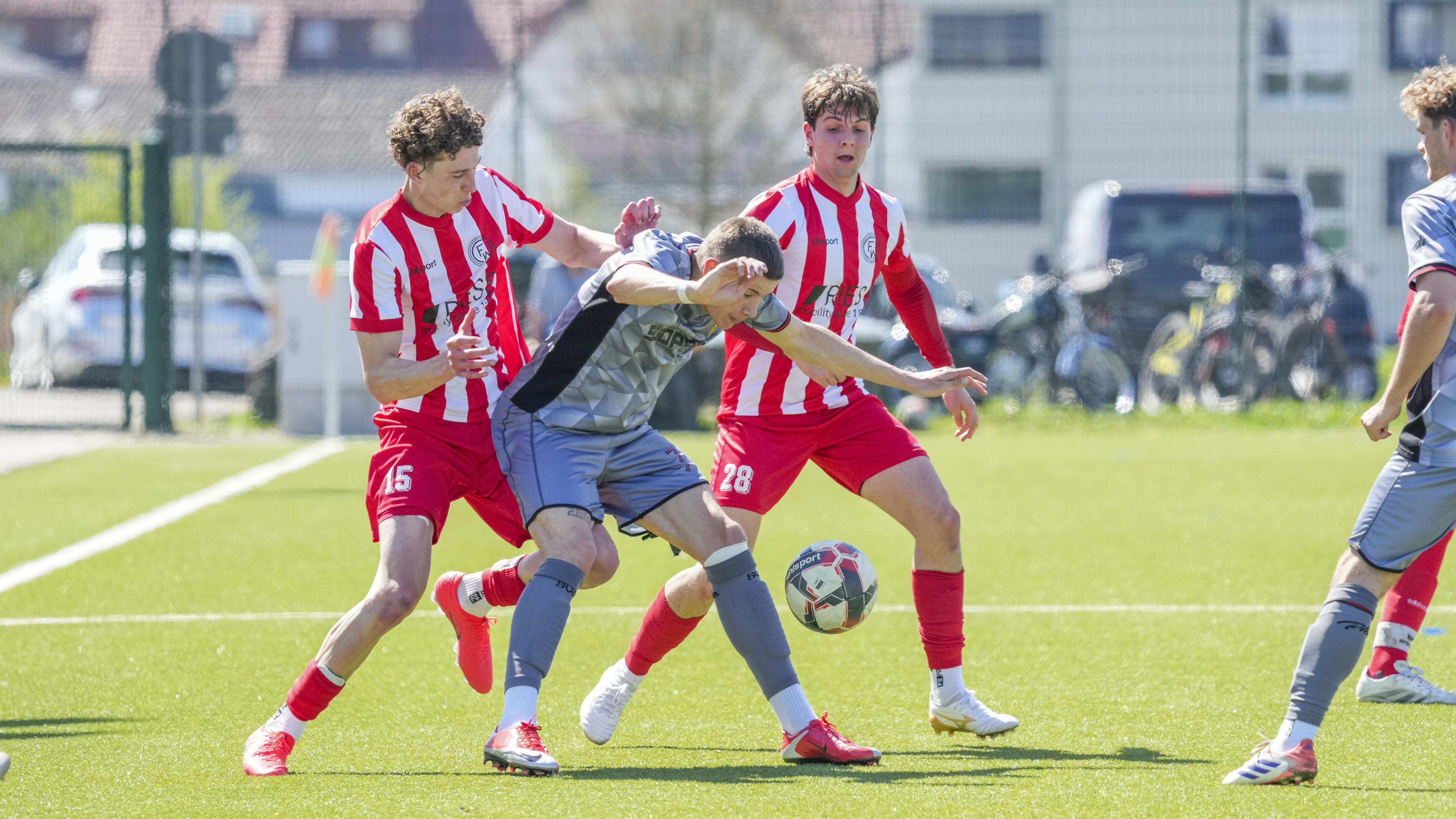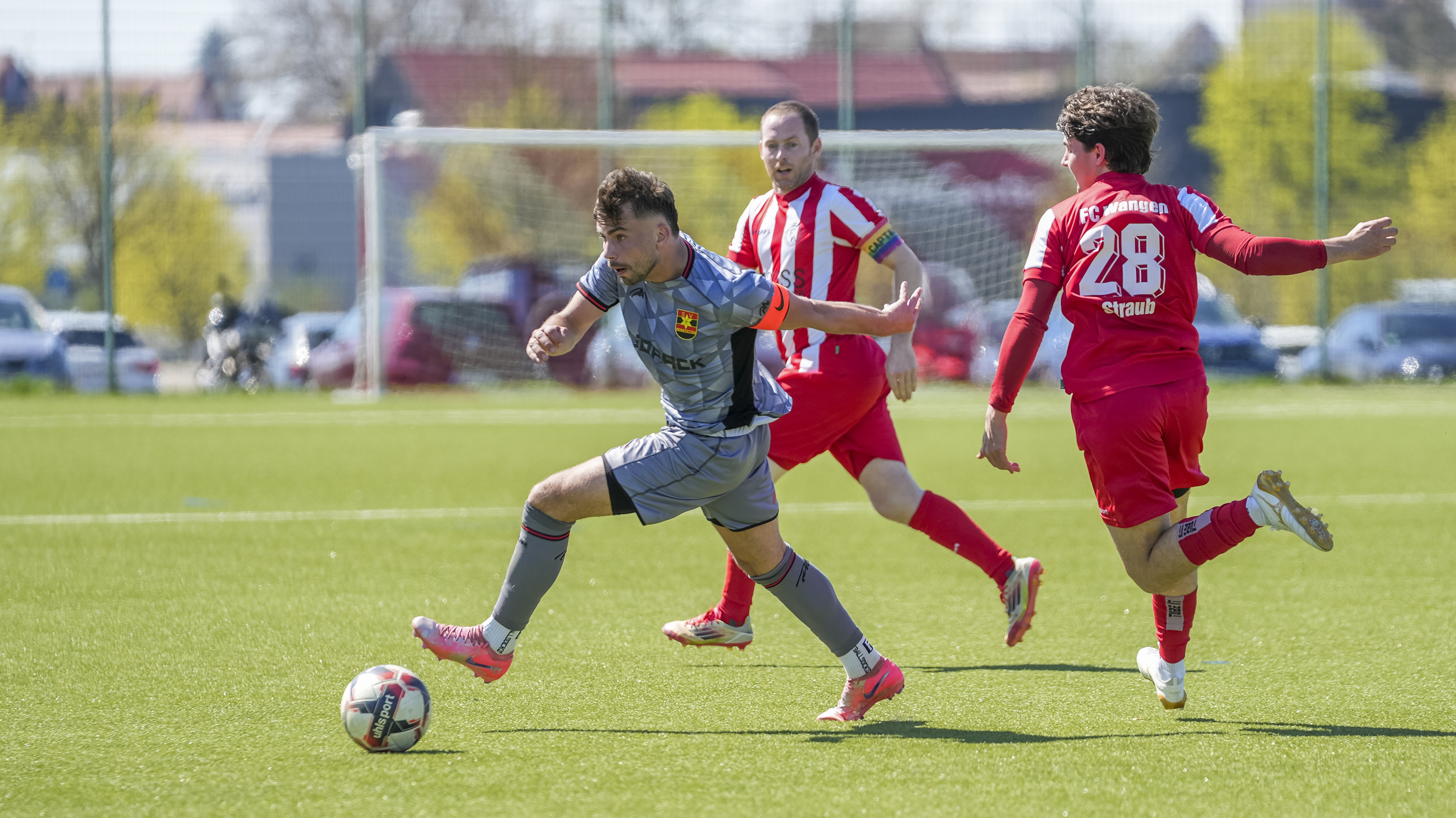 Dominik Martin (SV Reinstetten, #7) gegen Elias Willhalm (FC Wangen, #15) und Simon Straub (FC Wangen, #28), GER, FC Wangen vs. SV Reinstetten, Fussball, Landesliga, 26. Spieltag, Spielzeit 2025/2026, 11.04.26 Foto: Maximilian Rist