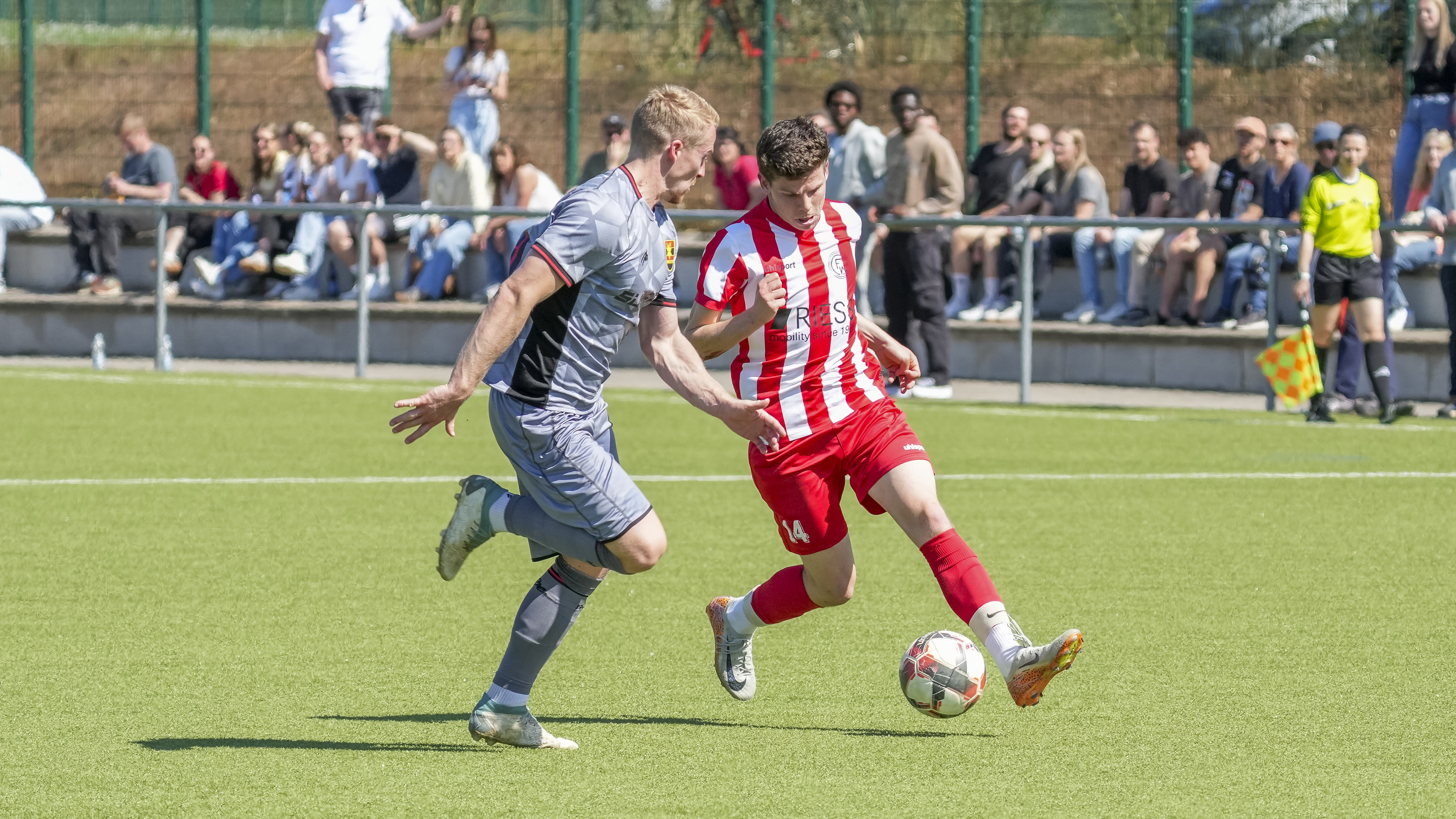 Tim Bucher (FC Wangen, #14) gegen Dominik Felger (SV Reinstetten, #14), GER, FC Wangen vs. SV Reinstetten, Fussball, Landesliga, 26. Spieltag, Spielzeit 2025/2026, 11.04.26 Foto: Maximilian Rist