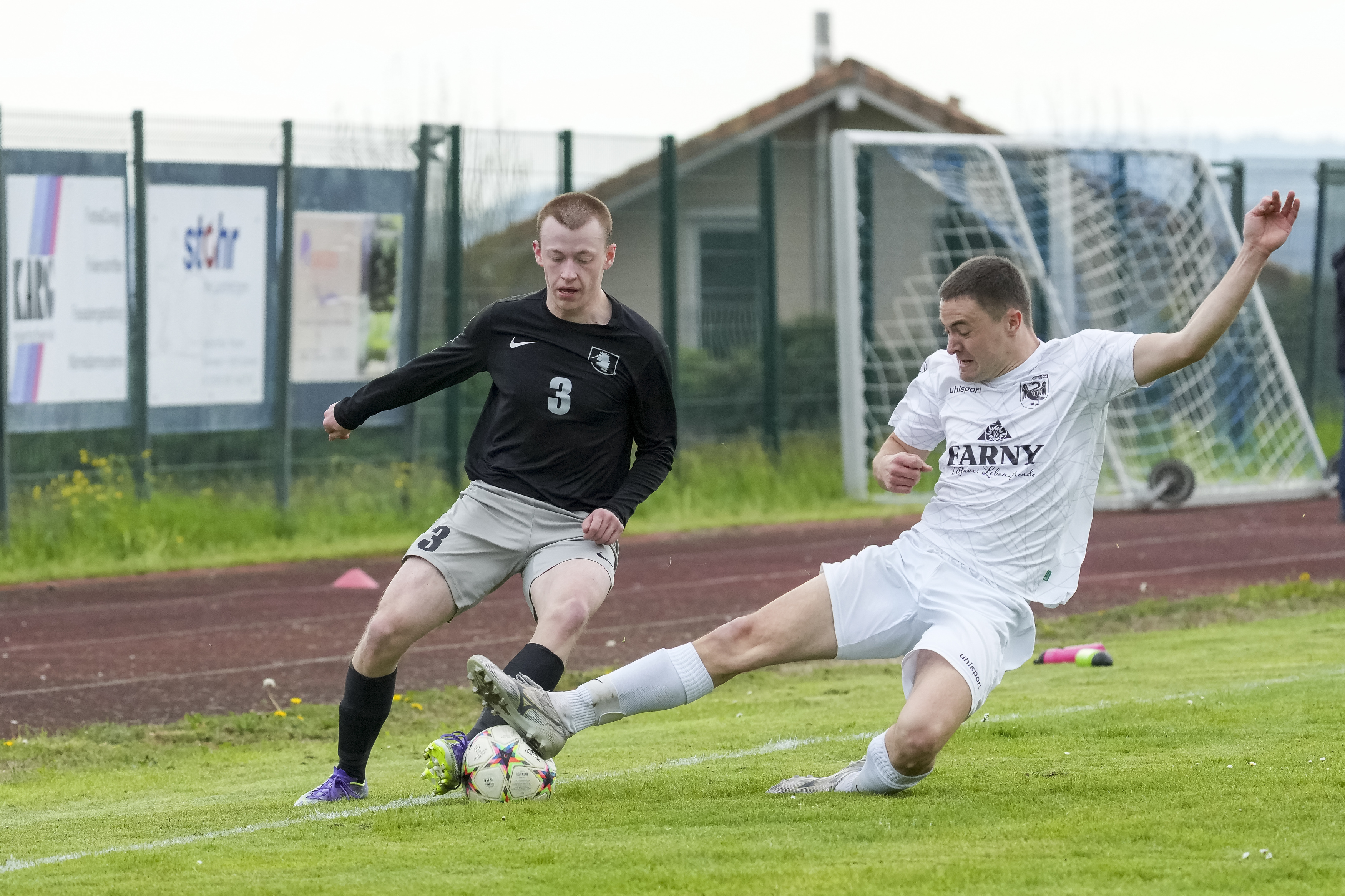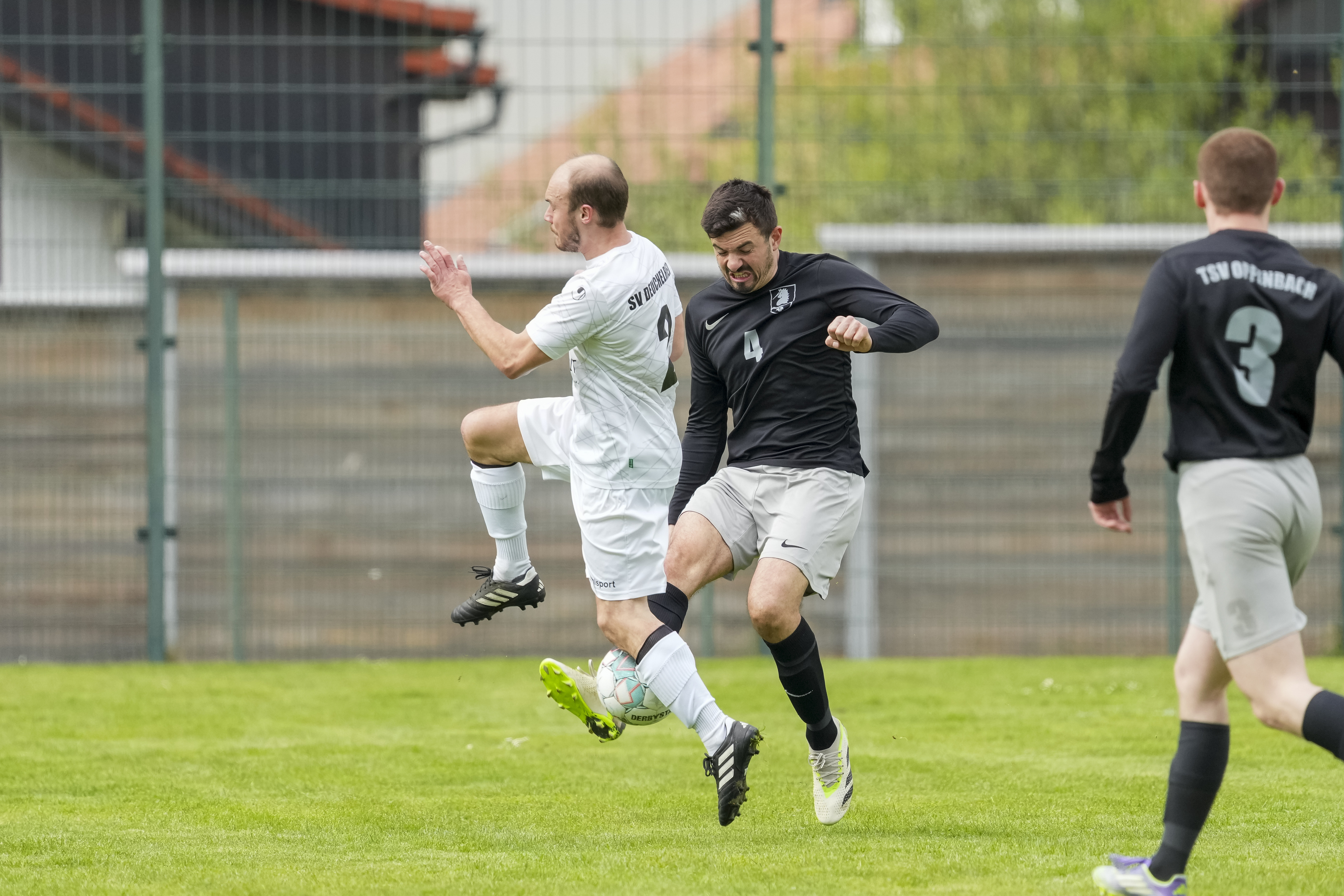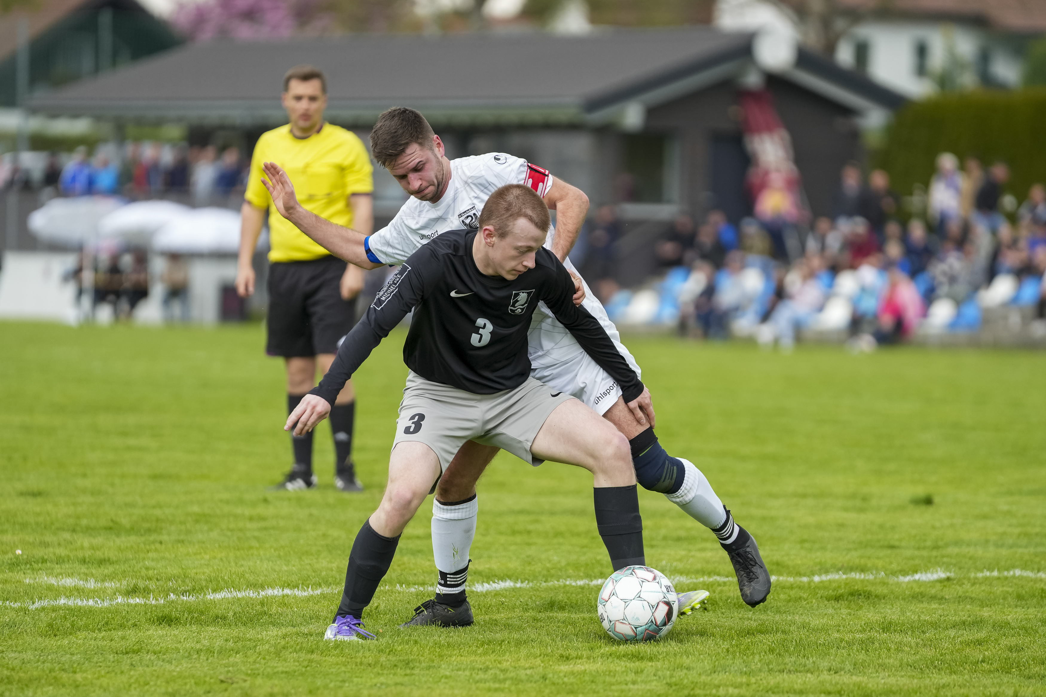 Zweikampf zwischen Hendrik Bellstedt (TSV Opfenbach, #3) und Jonathan Naegele (SV Deuchelried, #4), GER, TSV Opfenbach vs. SV Deuchelried, Fussball, Kreisliga B6 Bodensee, 16. Spieltag, Spielzeit 2025/2026, 19.04.26 Foto: Maximilian Rist