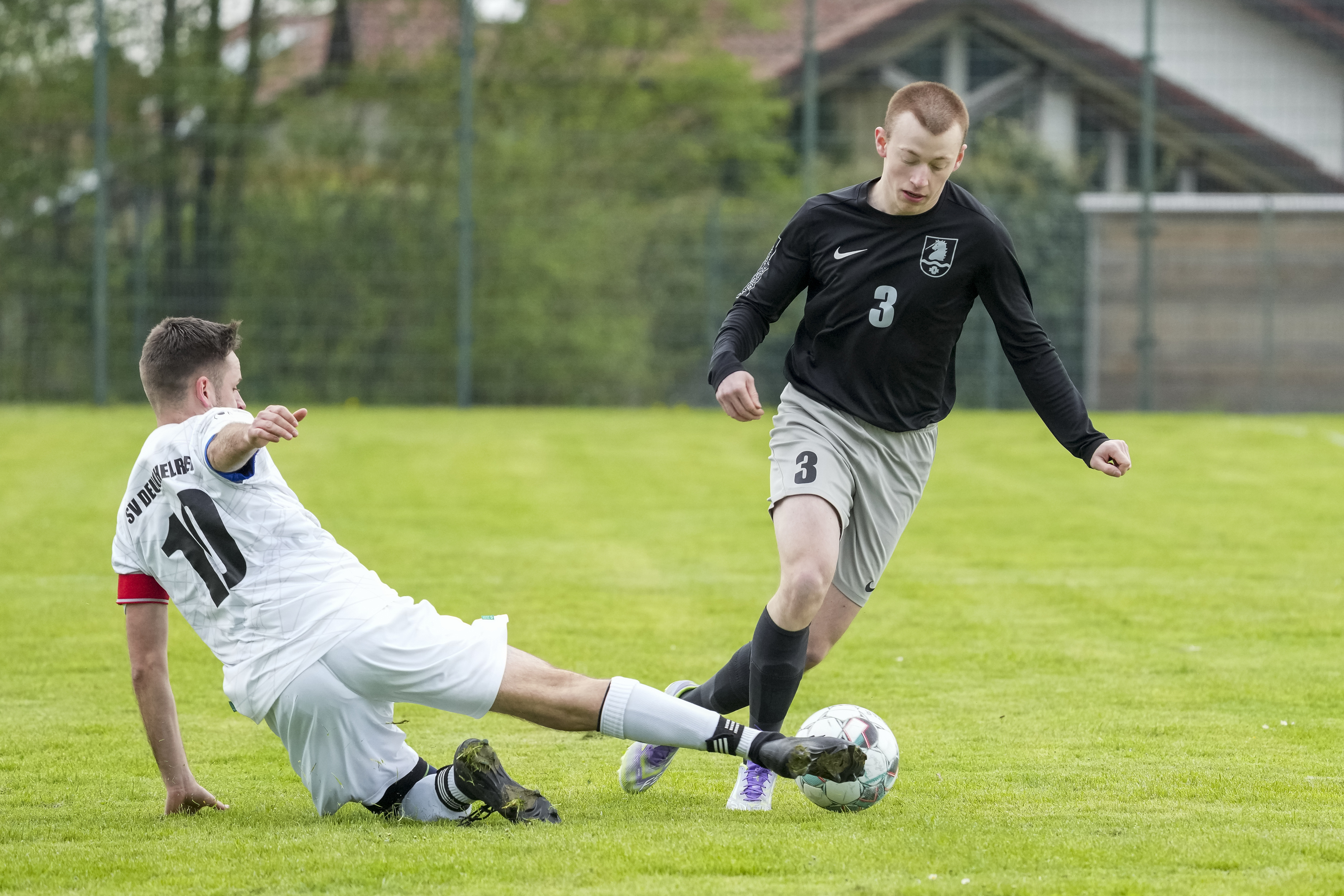 Zweikampf zwischen Hendrik Bellstedt (TSV Opfenbach, #3) und Jonathan Kugler (SV Deuchelried, #10), GER, TSV Opfenbach vs. SV Deuchelried, Fussball, Kreisliga B6 Bodensee, 16. Spieltag, Spielzeit 2025/2026, 19.04.26 Foto: Maximilian Rist