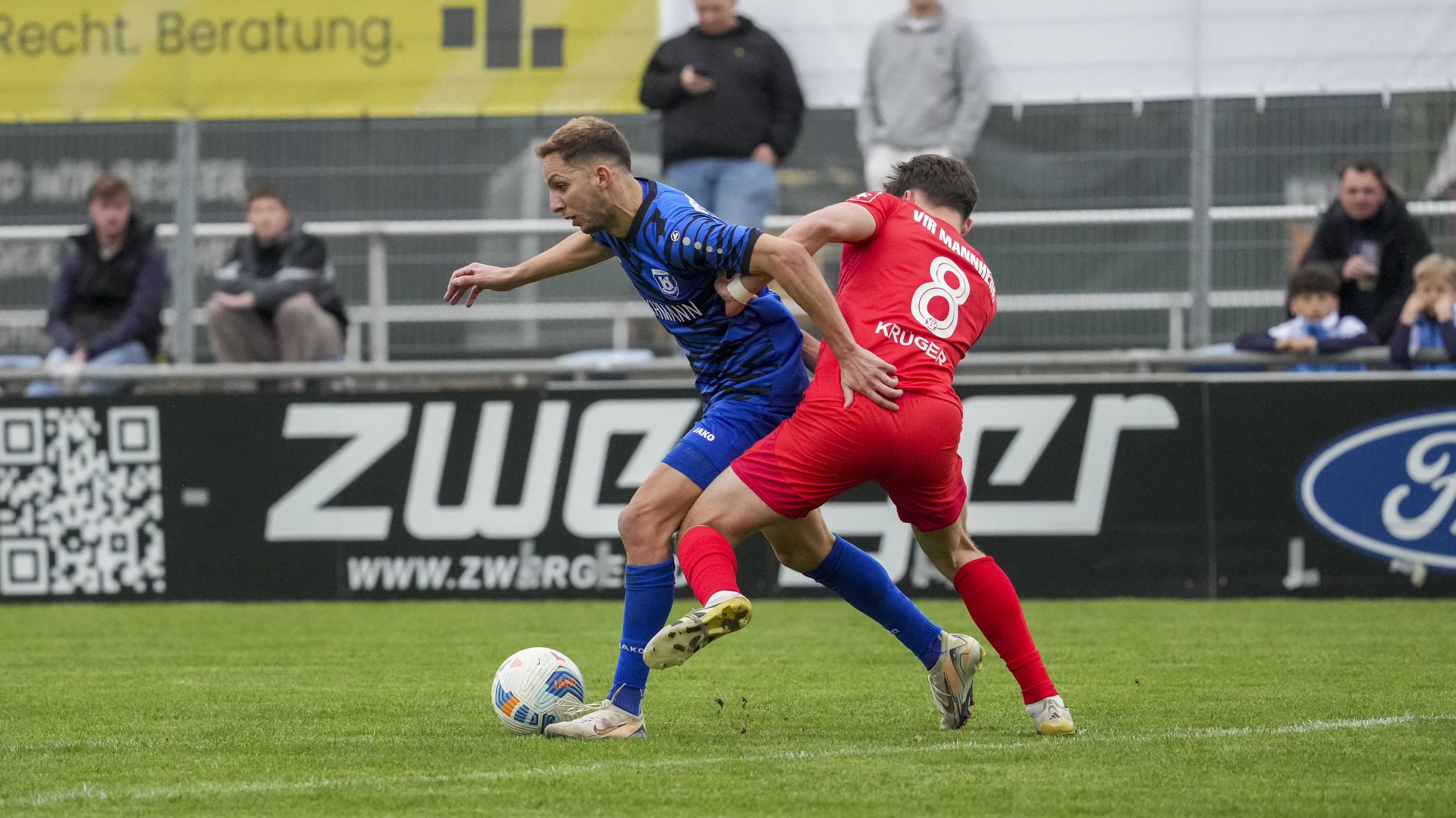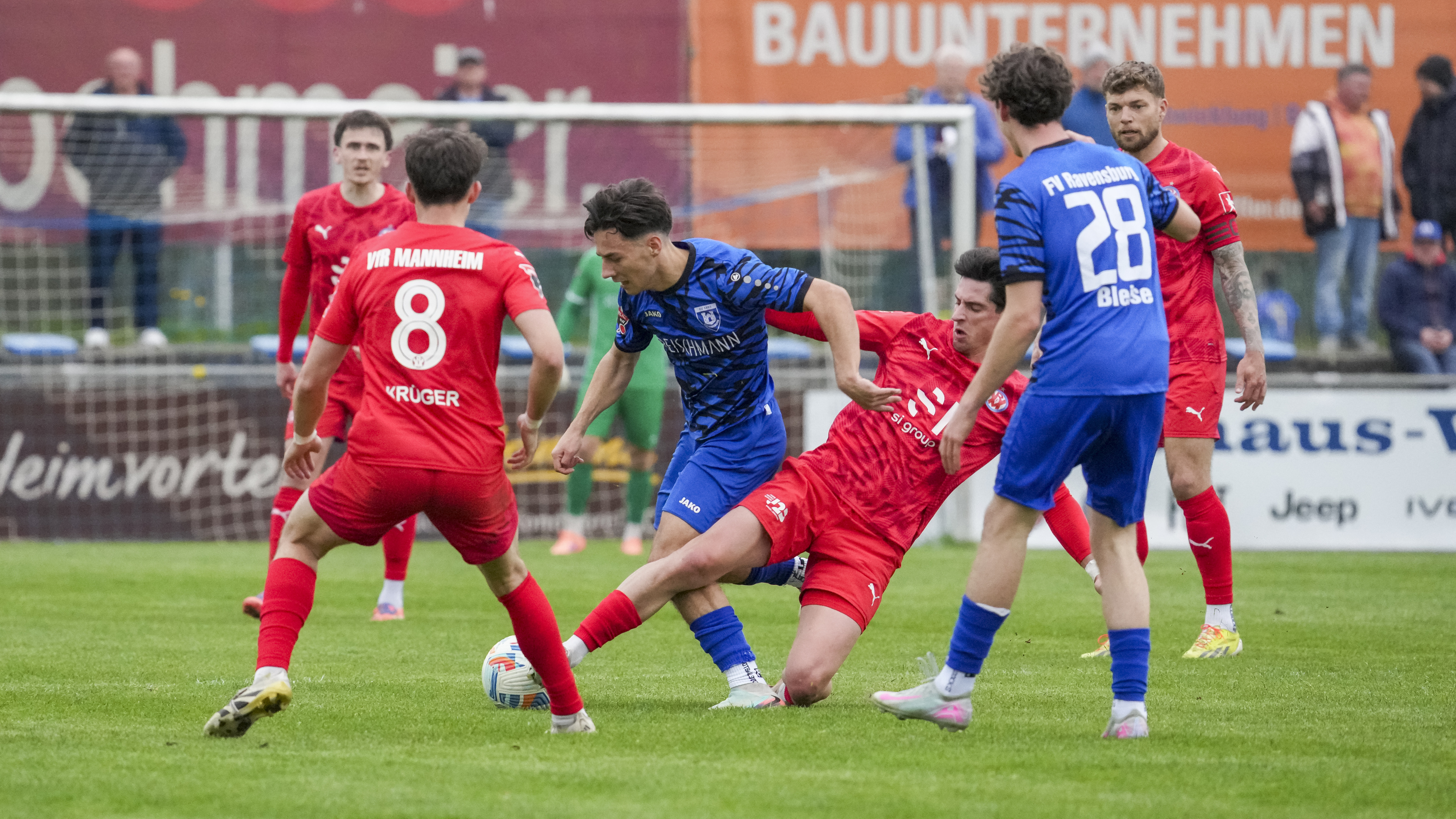 Zweikampf zwischen Lennart Thum (VfR Mannheim, #9) und Maximilian Bachmann (FV Ravensburg, #6), GER, FV Ravensburg vs. VfR Mannheim, Fussball, Oberliga, 20. Spieltag, Spielzeit 2025/2026, 15.04.26 Foto: Maximilian Rist