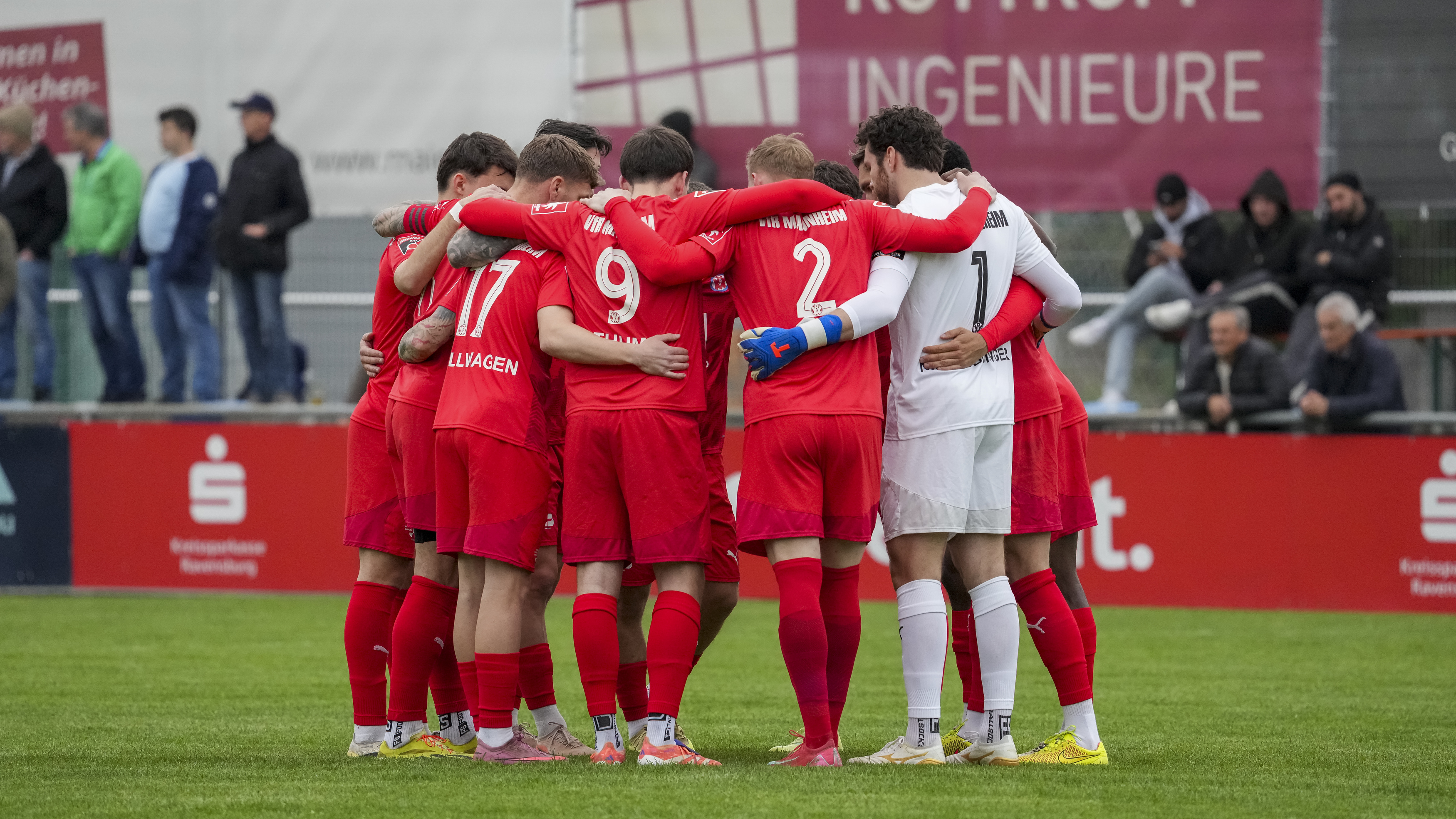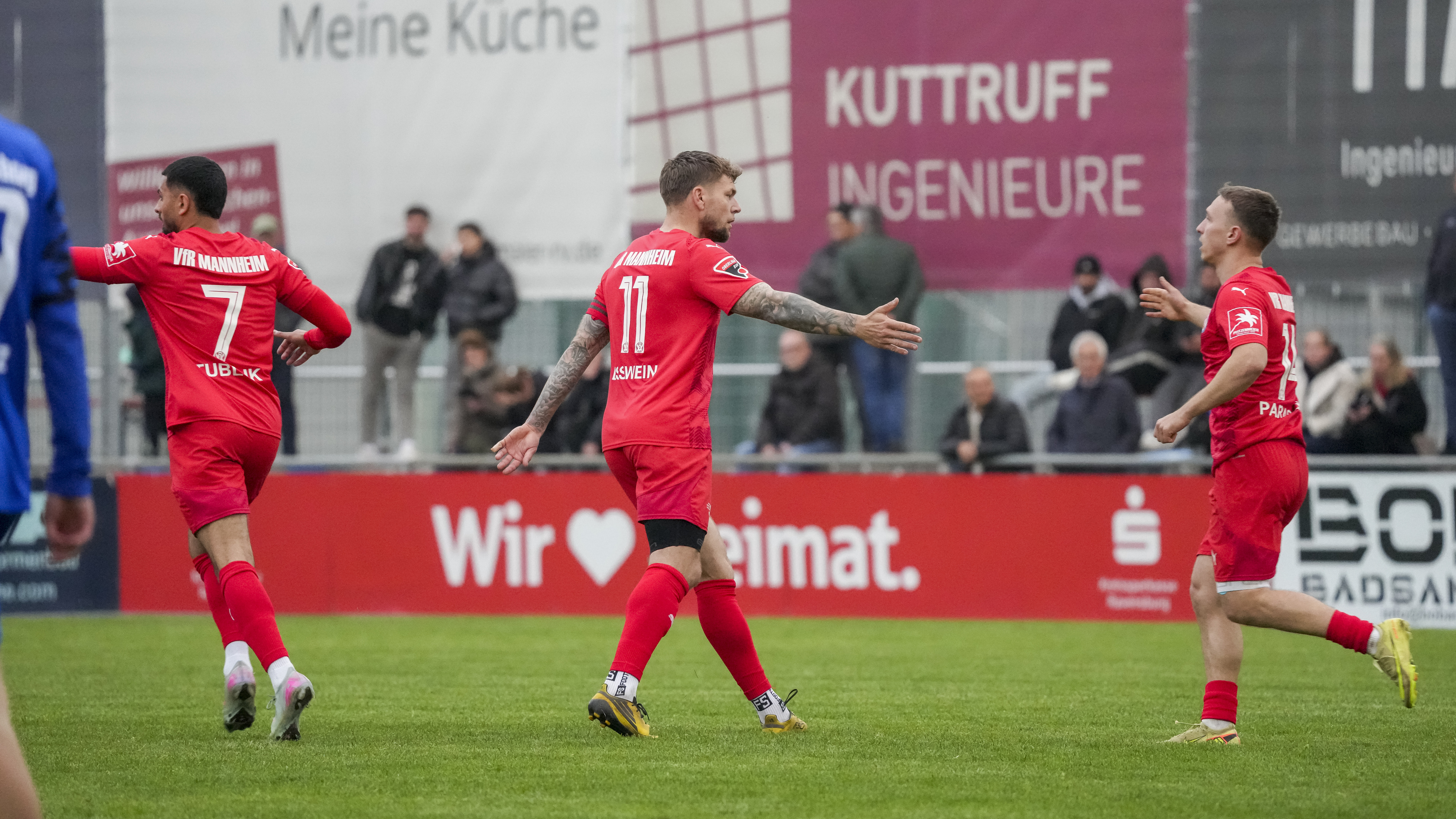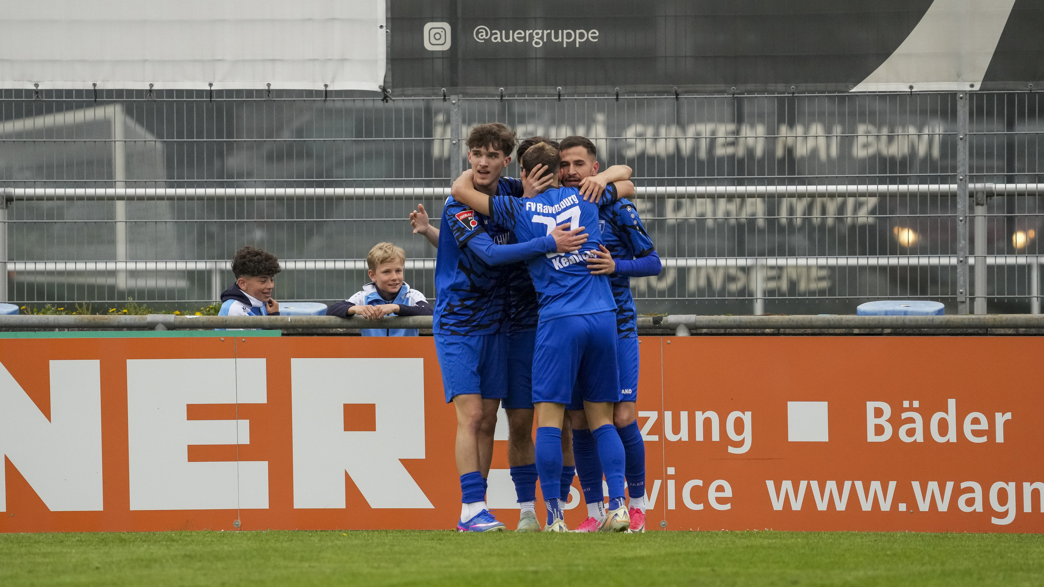 Torjubel zum 1:1 von Alexander Esswein (VfR Mannheim, #11) und Alexandru Paraschiv (VfR Mannheim, #14), GER, FV Ravensburg vs. VfR Mannheim, Fussball, Oberliga, 20. Spieltag, Spielzeit 2025/2026, 15.04.26 Foto: Maximilian Rist