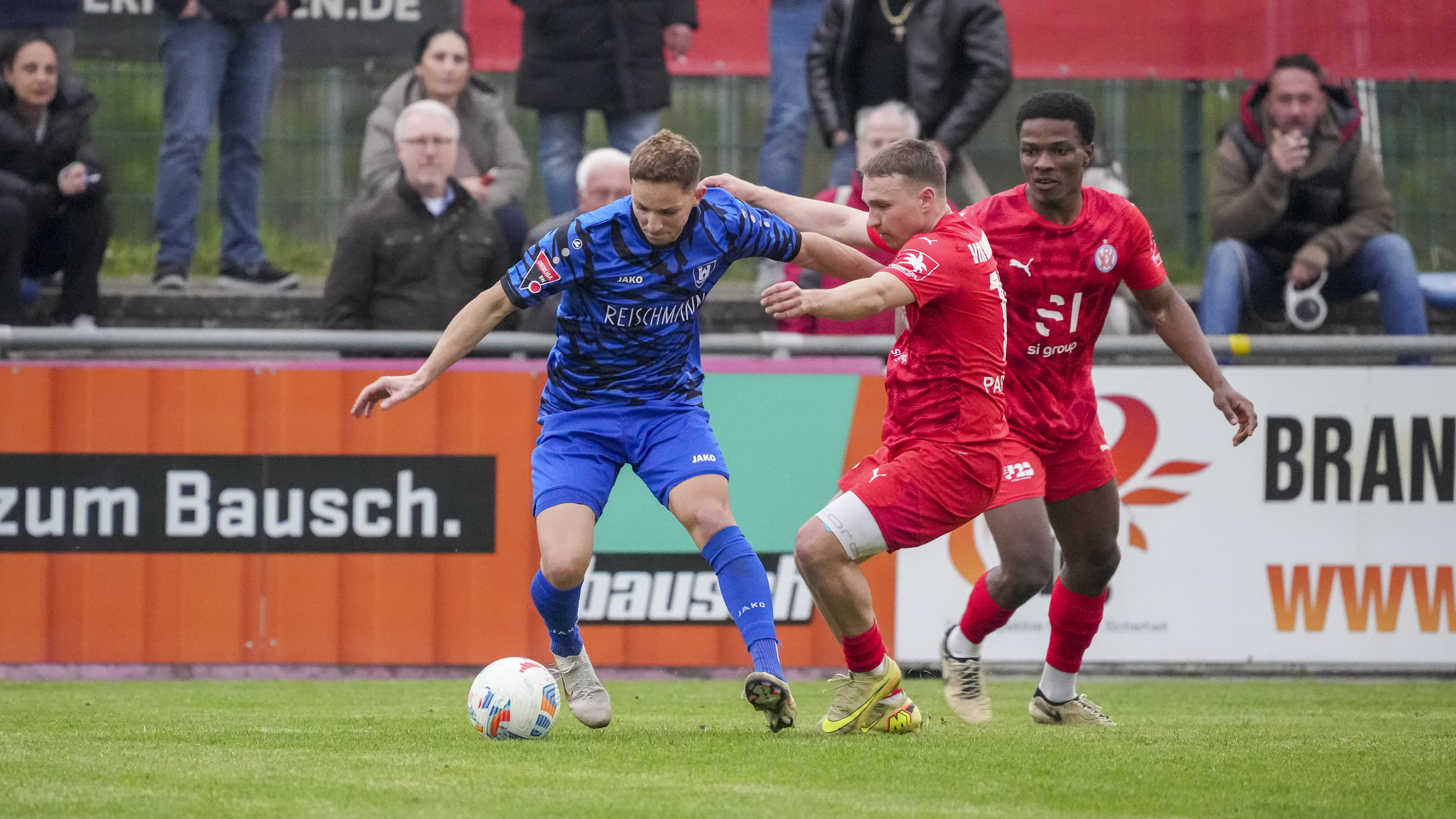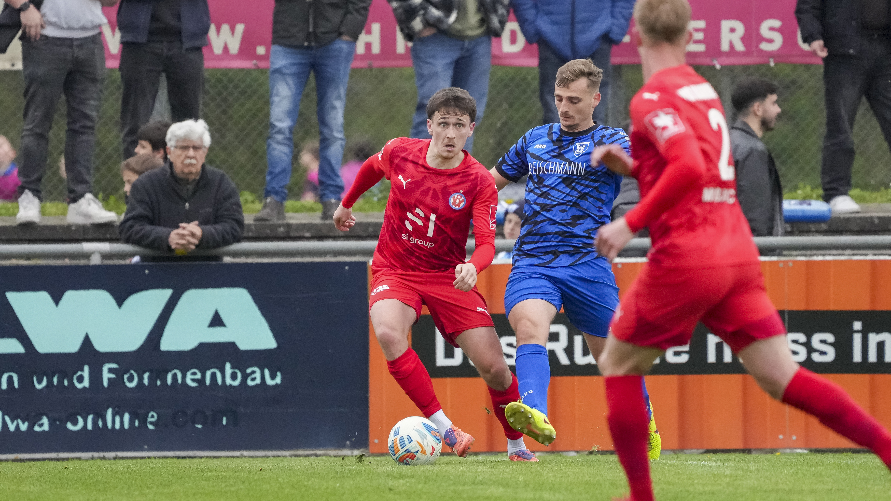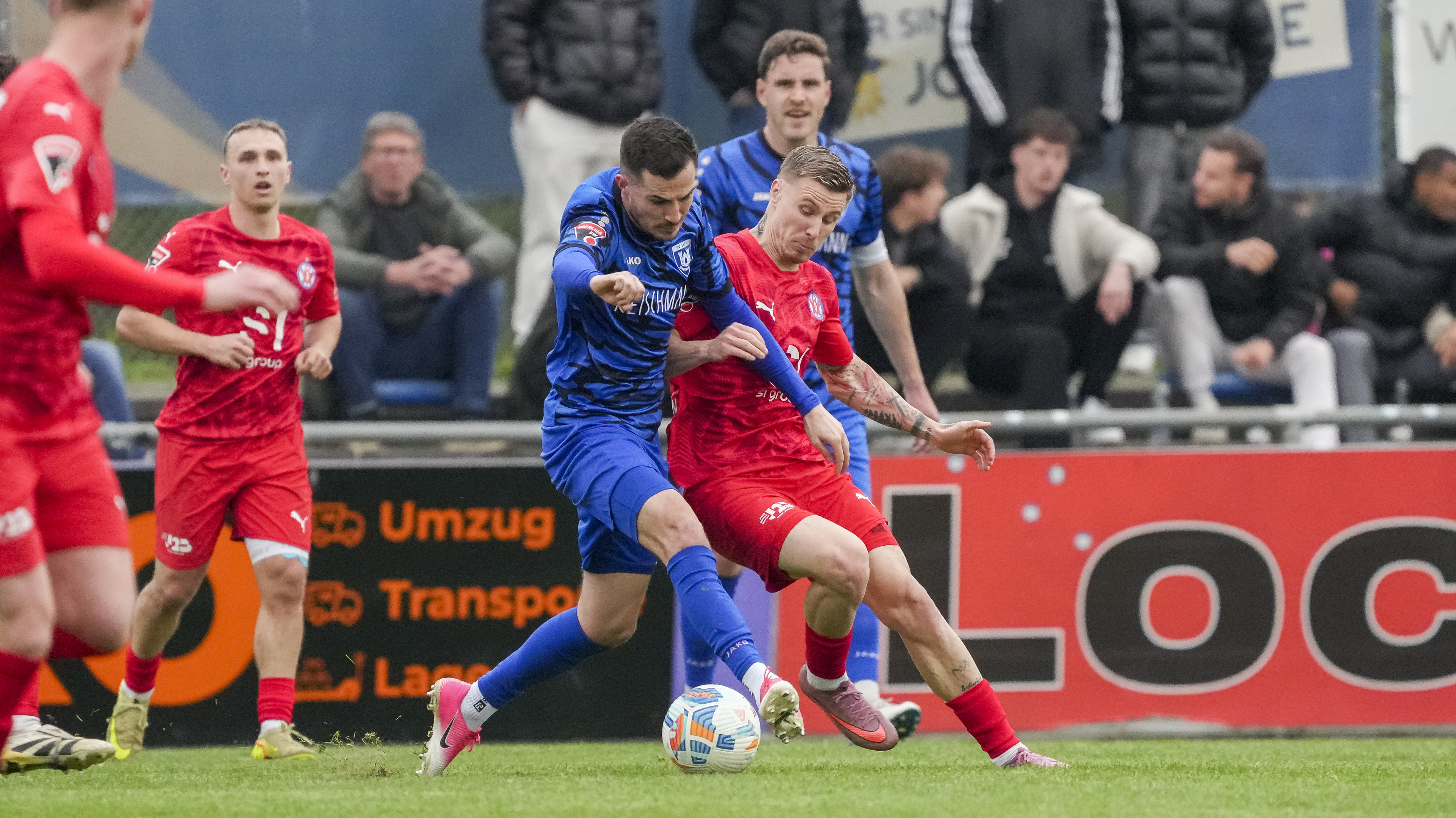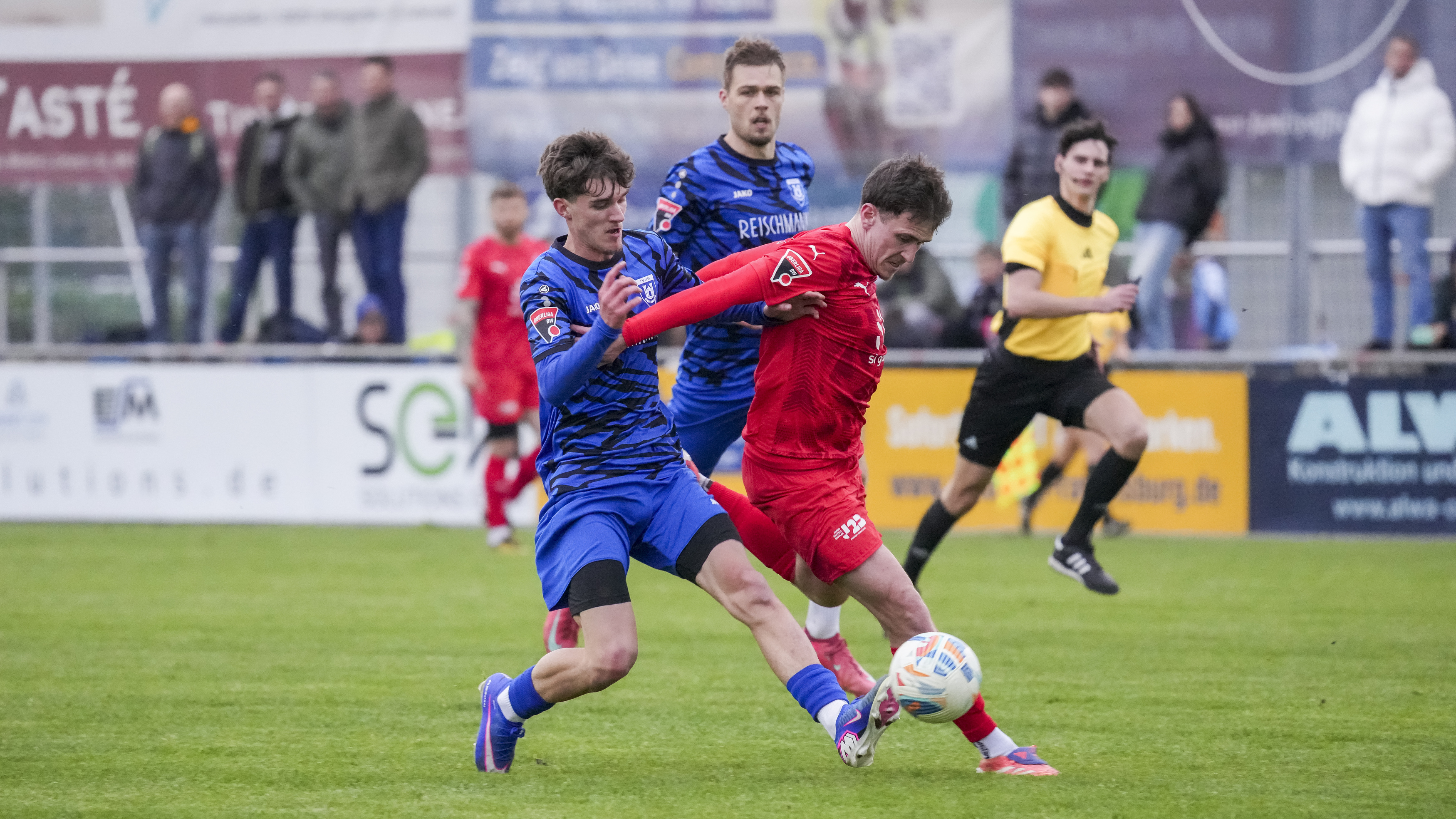 Zweikampf zwischen Paul Schwarz (FV Ravensburg, #19) und Lennart Thum (VfR Mannheim, #9), GER, FV Ravensburg vs. VfR Mannheim, Fussball, Oberliga, 20. Spieltag, Spielzeit 2025/2026, 15.04.26 Foto: Maximilian Rist
