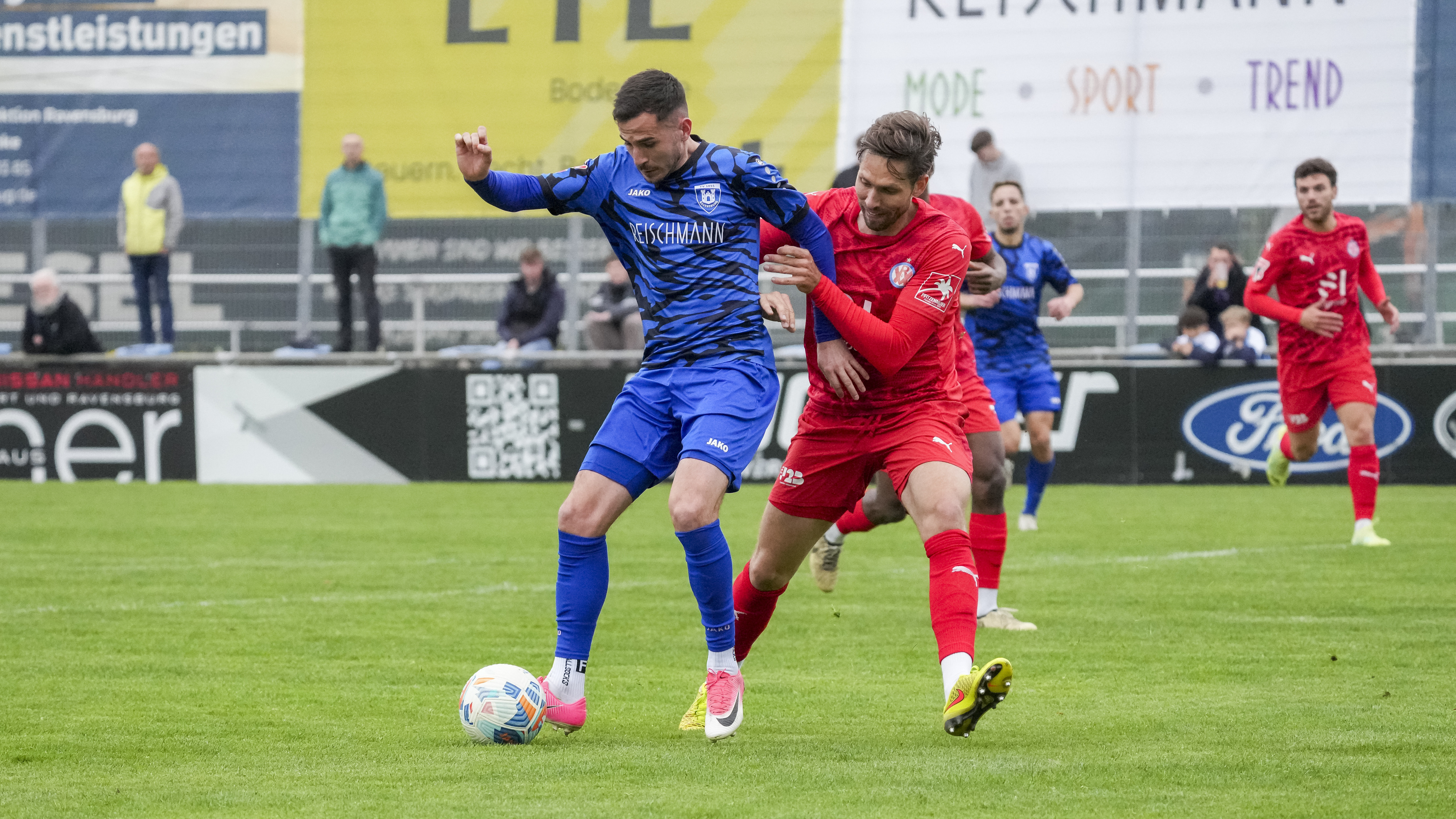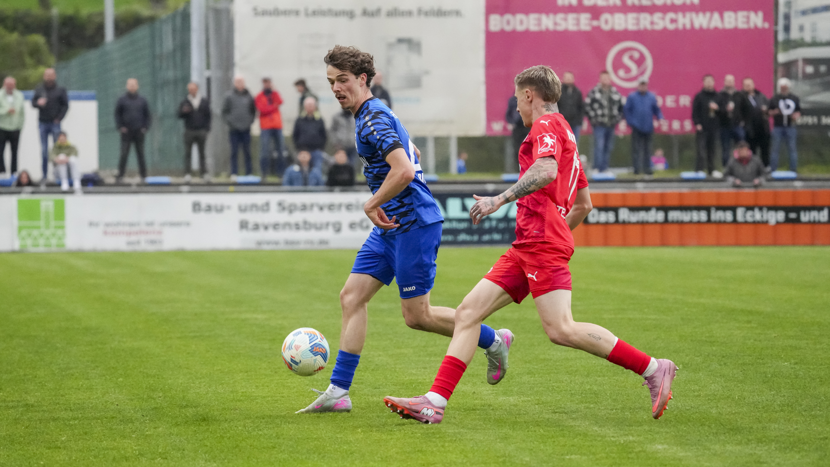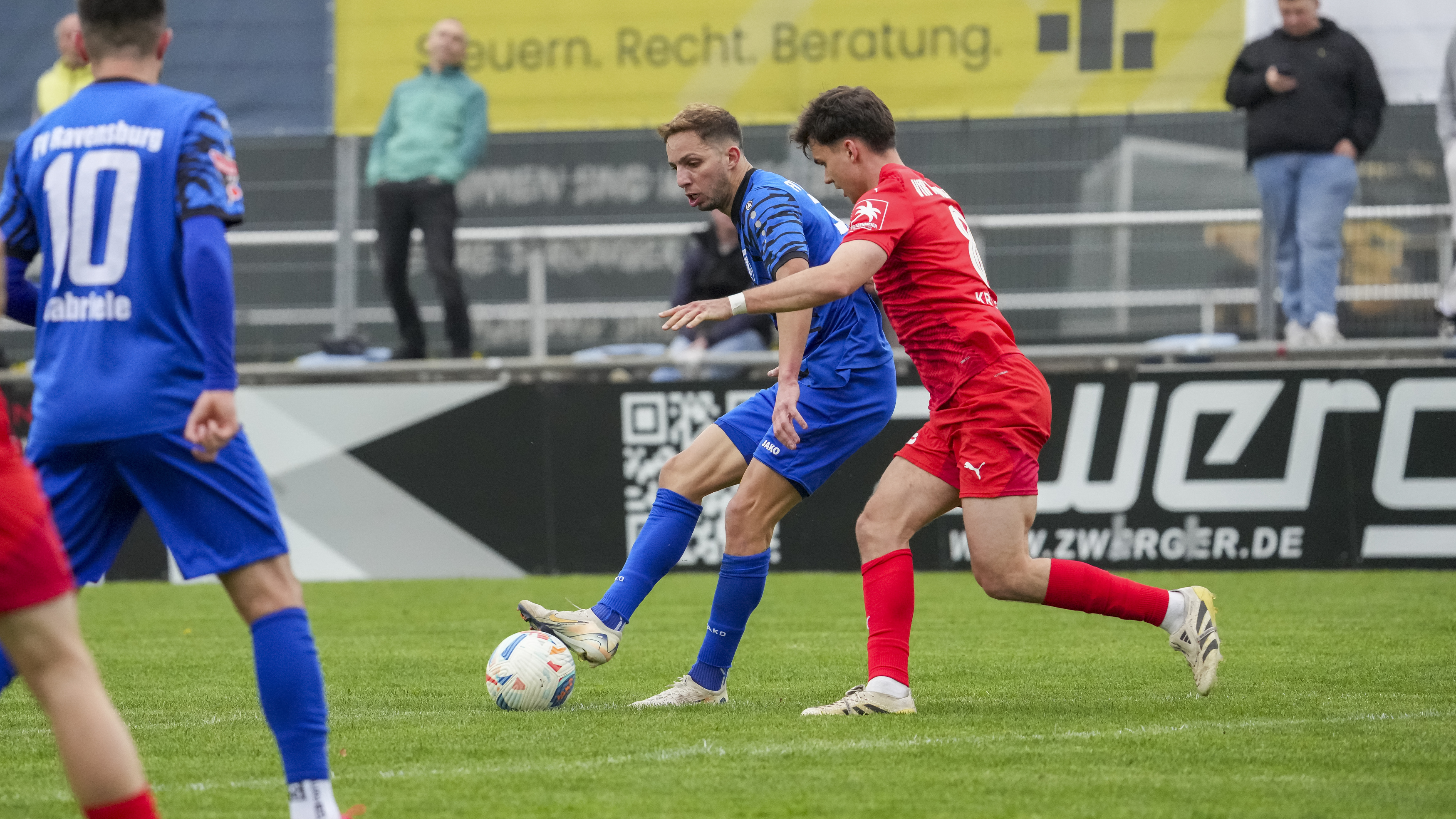 Zweikampf zwischen Marek Bleise (FV Ravensburg, #28) und Luca Stellwagen (VfR Mannheim, #17), GER, FV Ravensburg vs. VfR Mannheim, Fussball, Oberliga, 20. Spieltag, Spielzeit 2025/2026, 15.04.26 Foto: Maximilian Rist