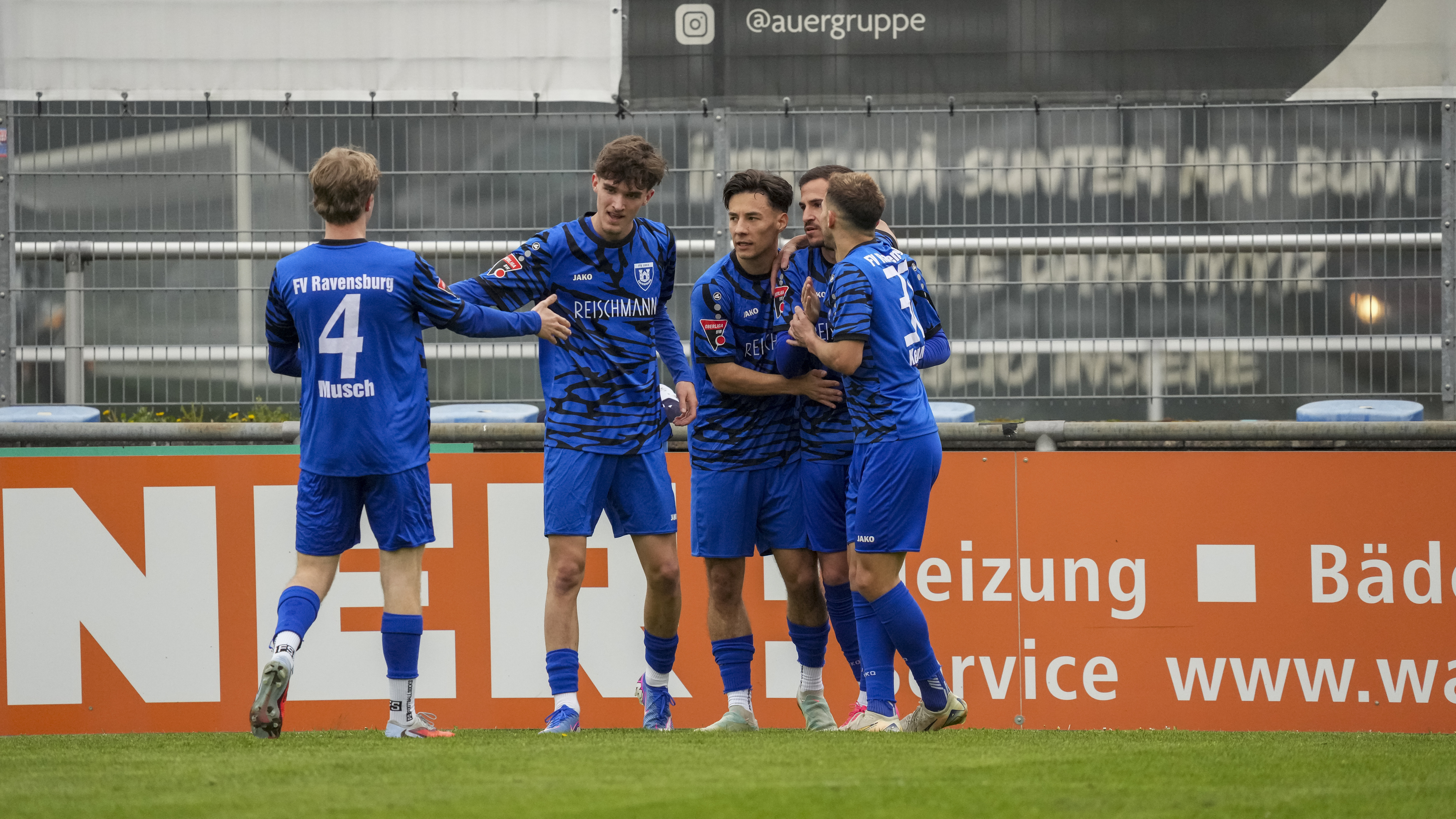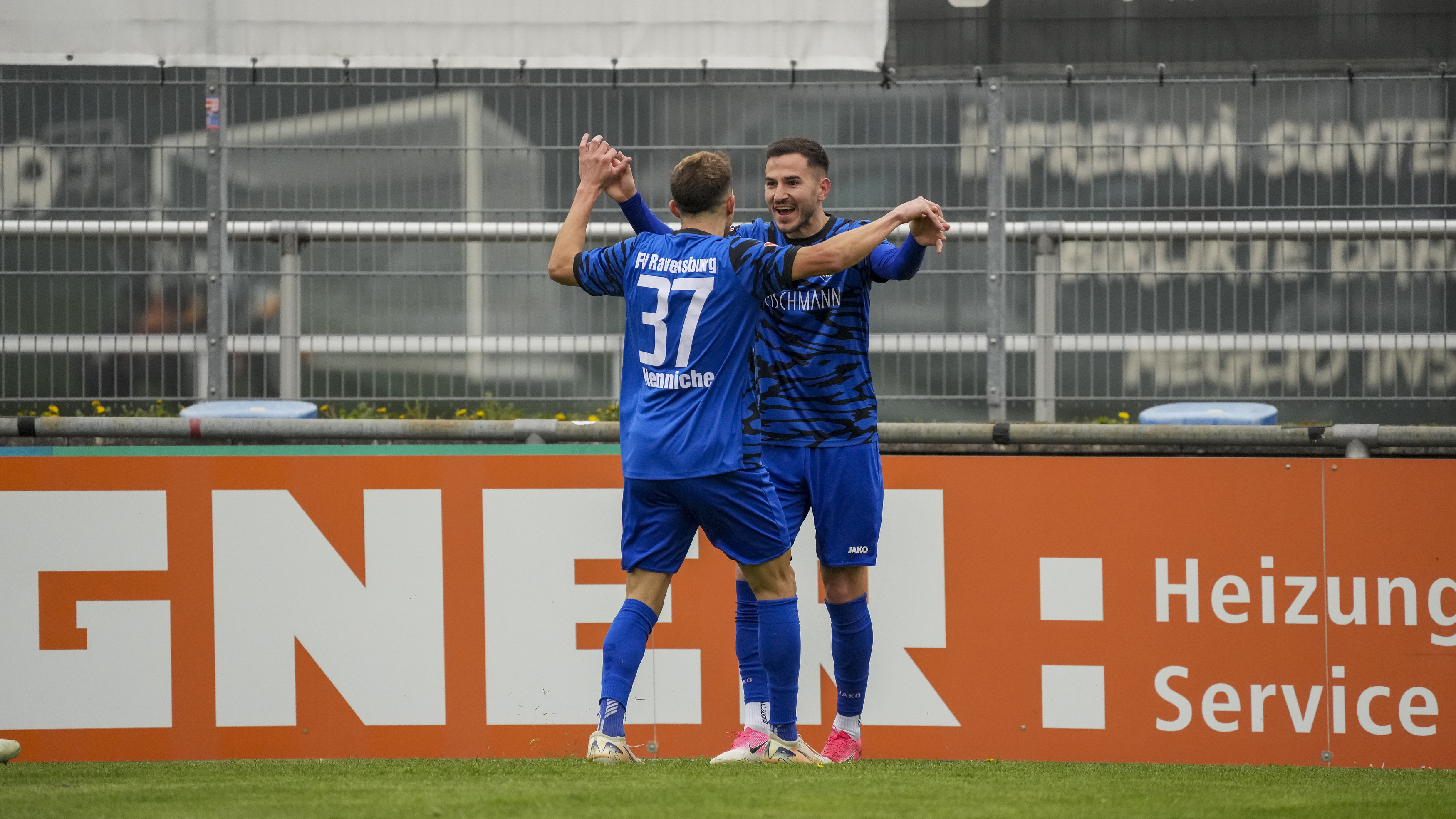 Torjubel zum 1:0 von Daniele Gabriele (FV Ravensburg, #10) und Nesreddine Kenniche (FV Ravensburg, #37), GER, FV Ravensburg vs. VfR Mannheim, Fussball, Oberliga, 20. Spieltag, Spielzeit 2025/2026, 15.04.26 Foto: Maximilian Rist