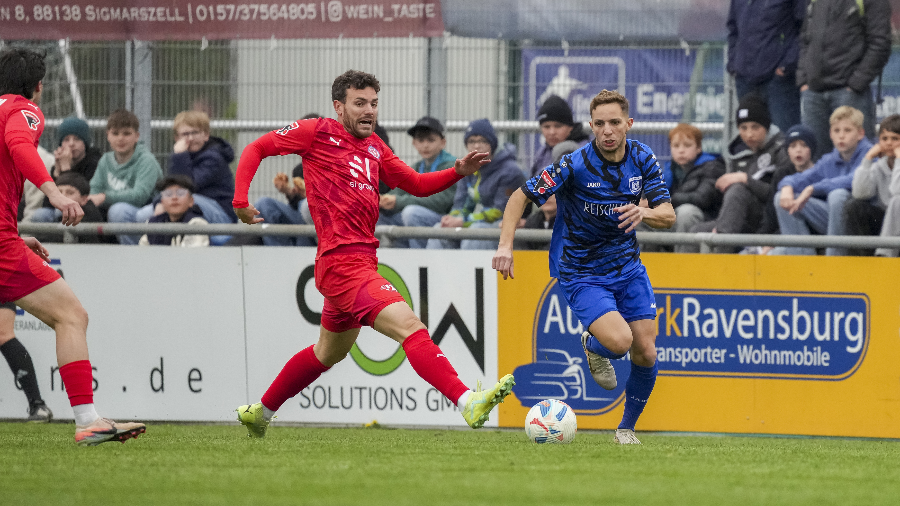 Zweikampf zwischen Daniele Gabriele (FV Ravensburg, #10) und Christian Kuhn (VfR Mannheim, #5), GER, FV Ravensburg vs. VfR Mannheim, Fussball, Oberliga, 20. Spieltag, Spielzeit 2025/2026, 15.04.26 Foto: Maximilian Rist