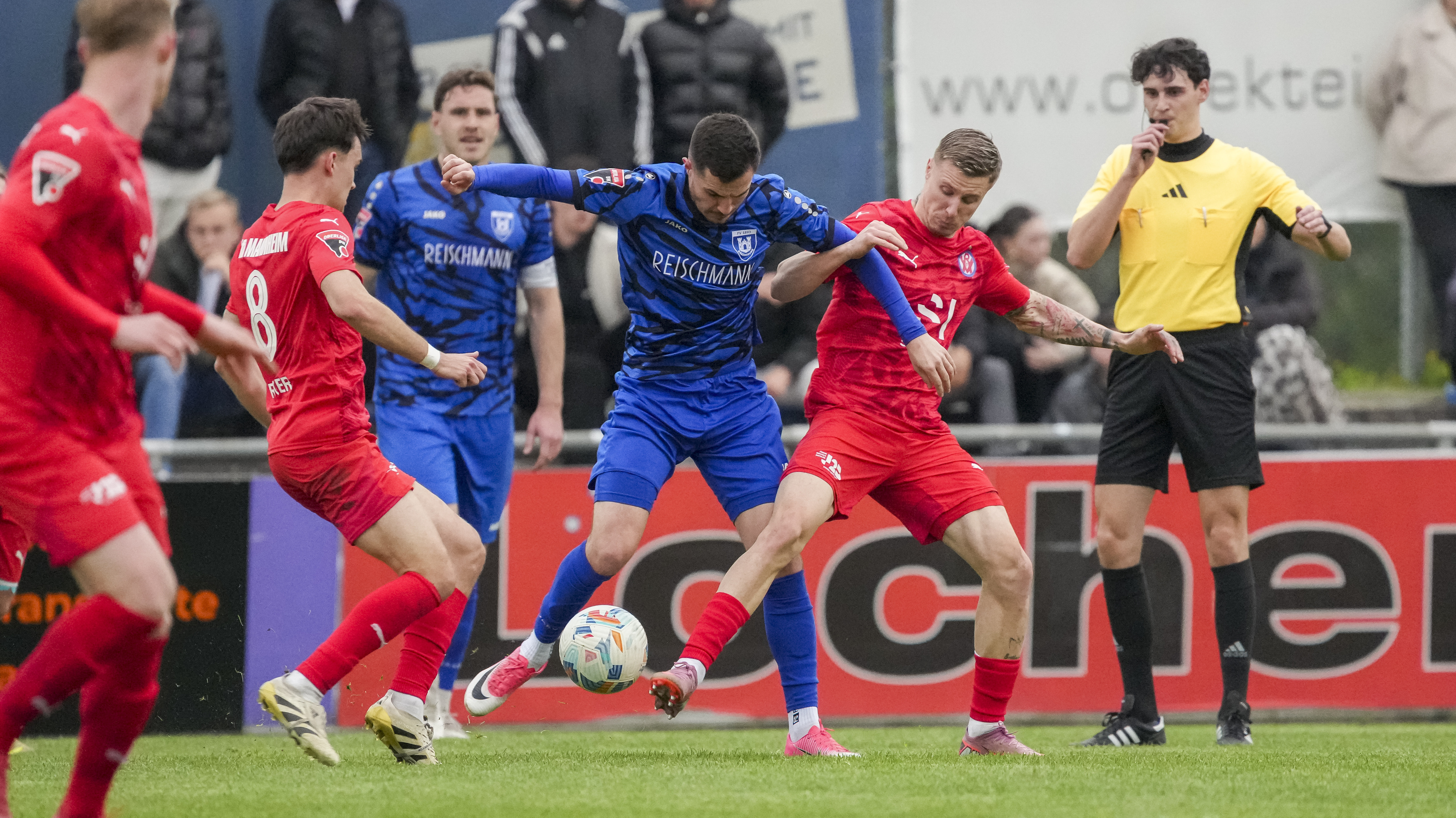 Zweikampf zwischen Christoph Becker (VfR Mannheim, #4) und Nesreddine Kenniche (FV Ravensburg, #37), GER, FV Ravensburg vs. VfR Mannheim, Fussball, Oberliga, 20. Spieltag, Spielzeit 2025/2026, 15.04.26 Foto: Maximilian Rist