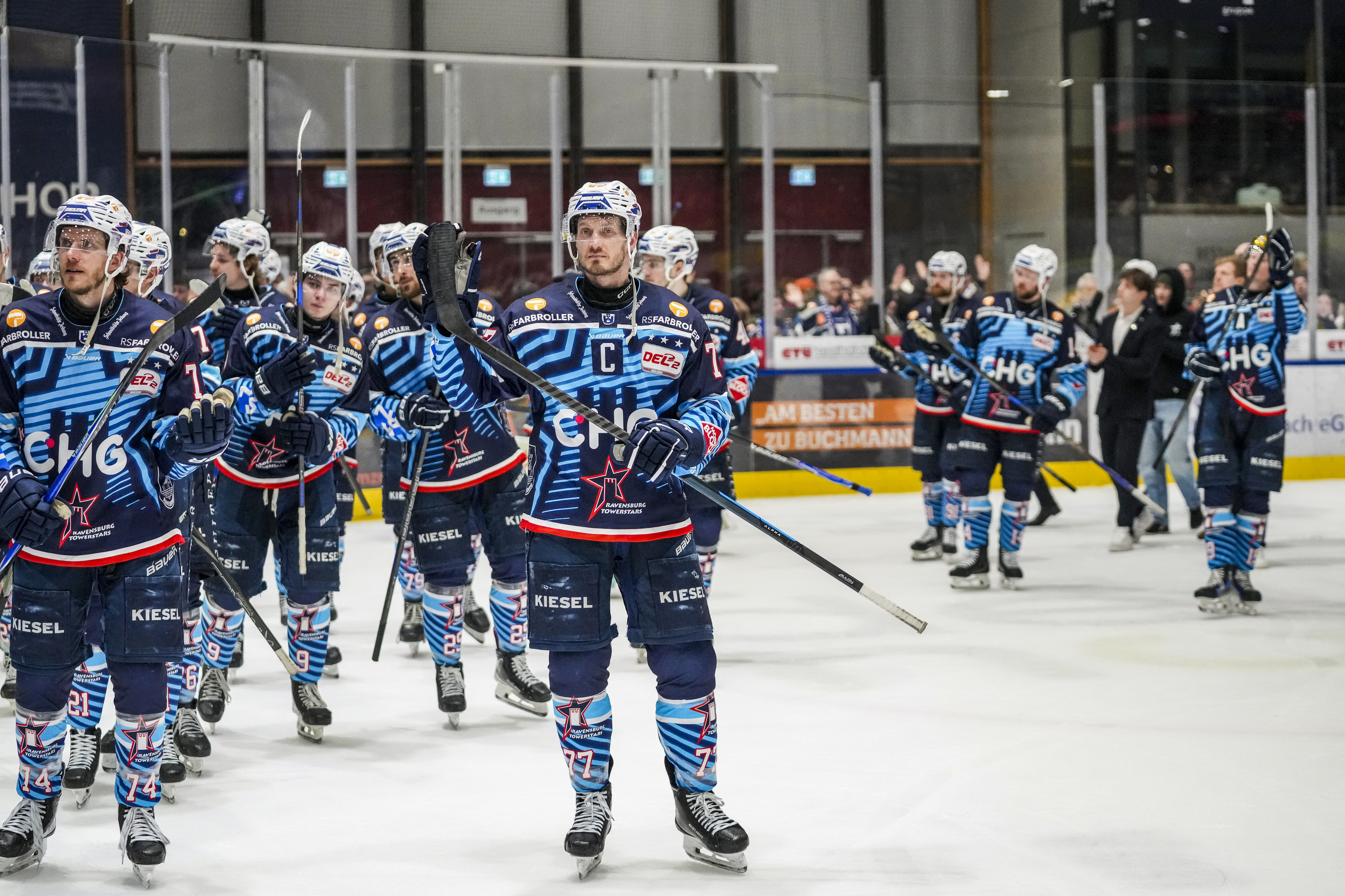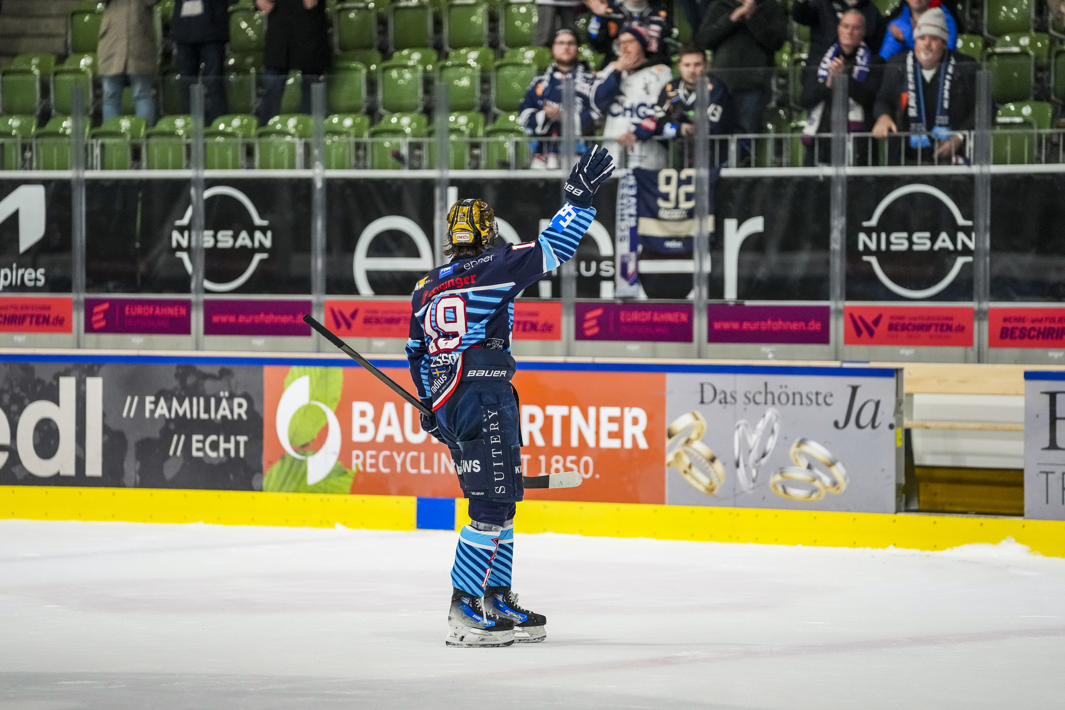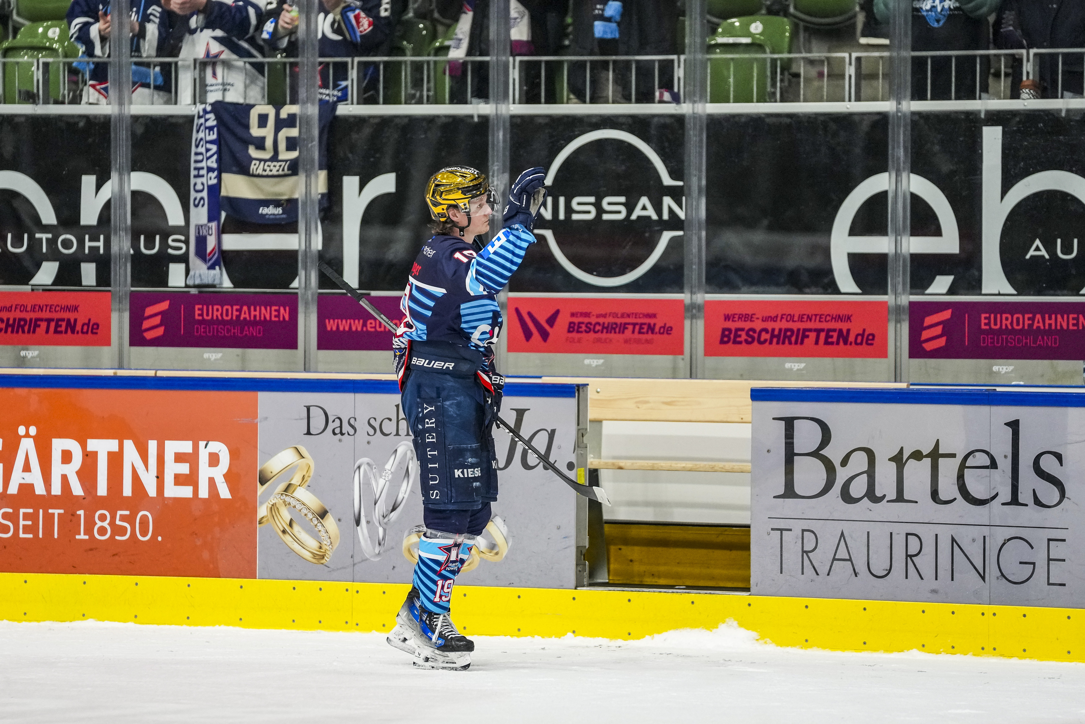 Erik Jinesjoe Karlsson (Ravensburg Towerstars, #19) verabschiedet sich bei den Fans, GER, Ravensburg Towerstars vs. Bietigheim Steelers, Eishockey, DEL2, Spielzeit 2025/2026, Playoff Viertelfinale, Spiel 7, 31.03.26 Foto: Maximilian Rist