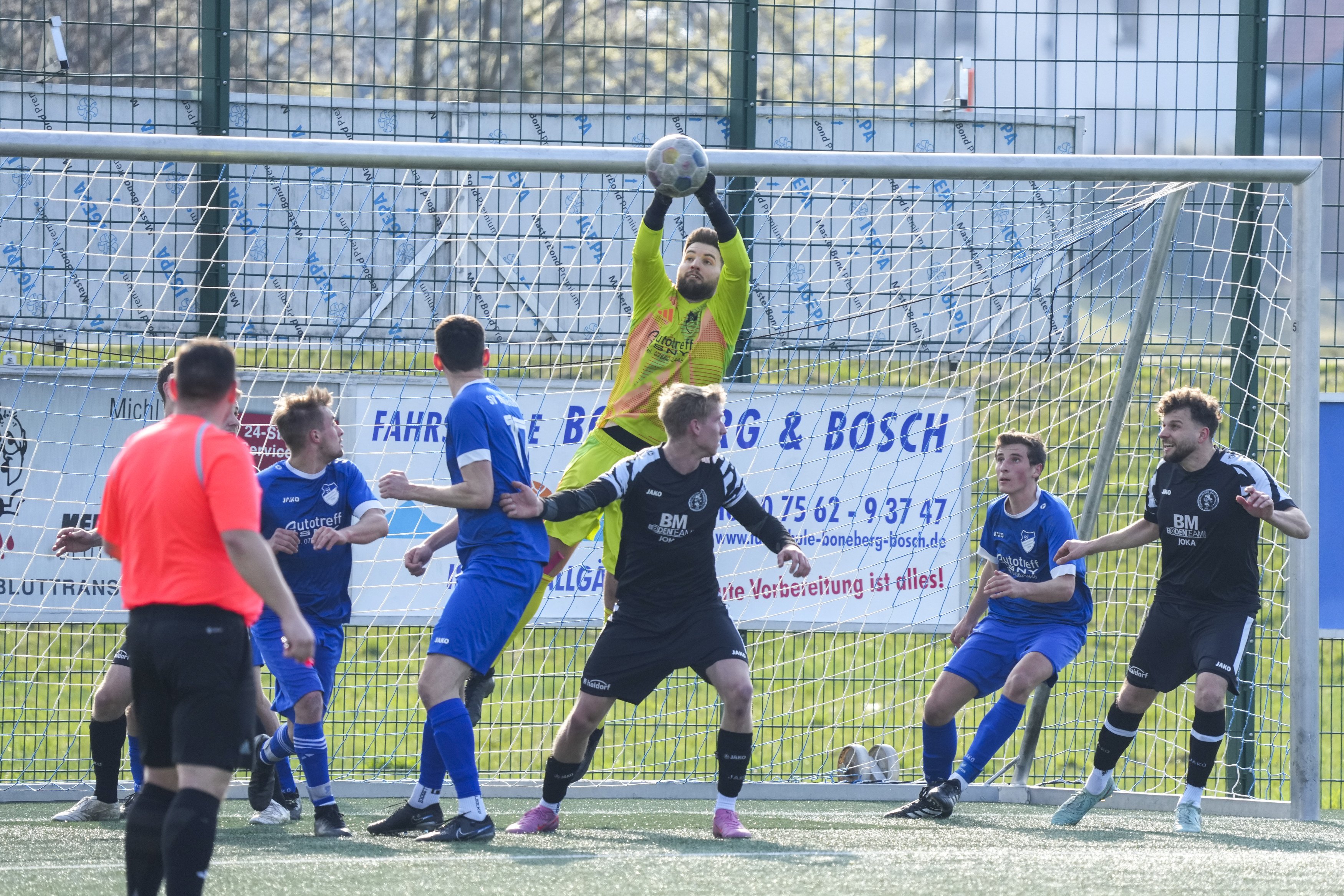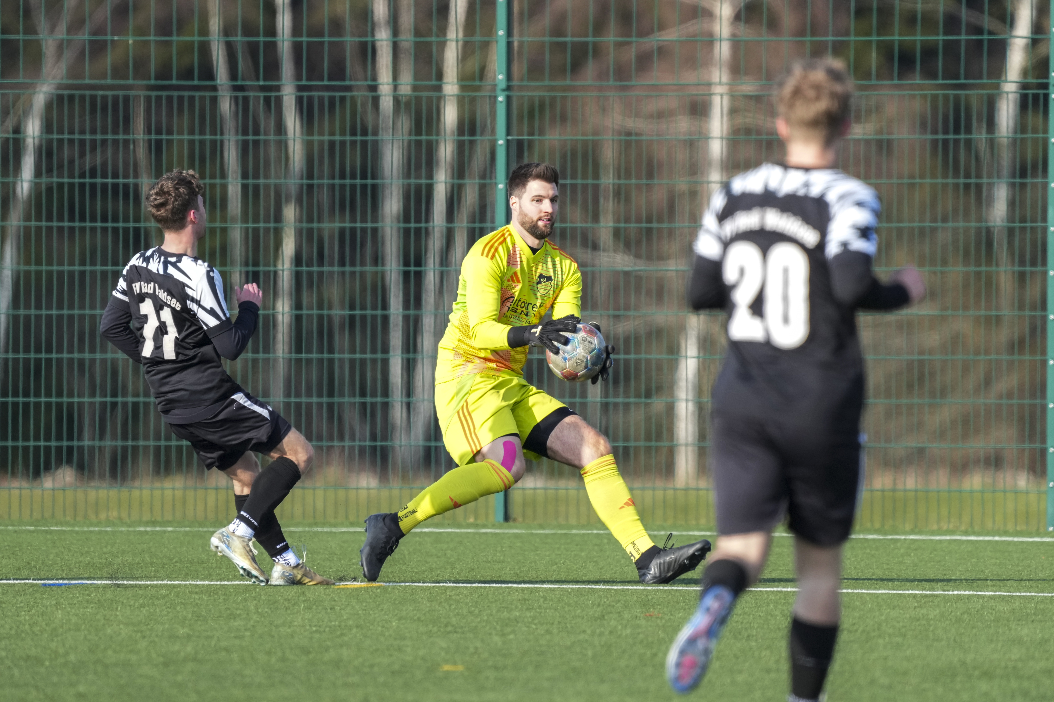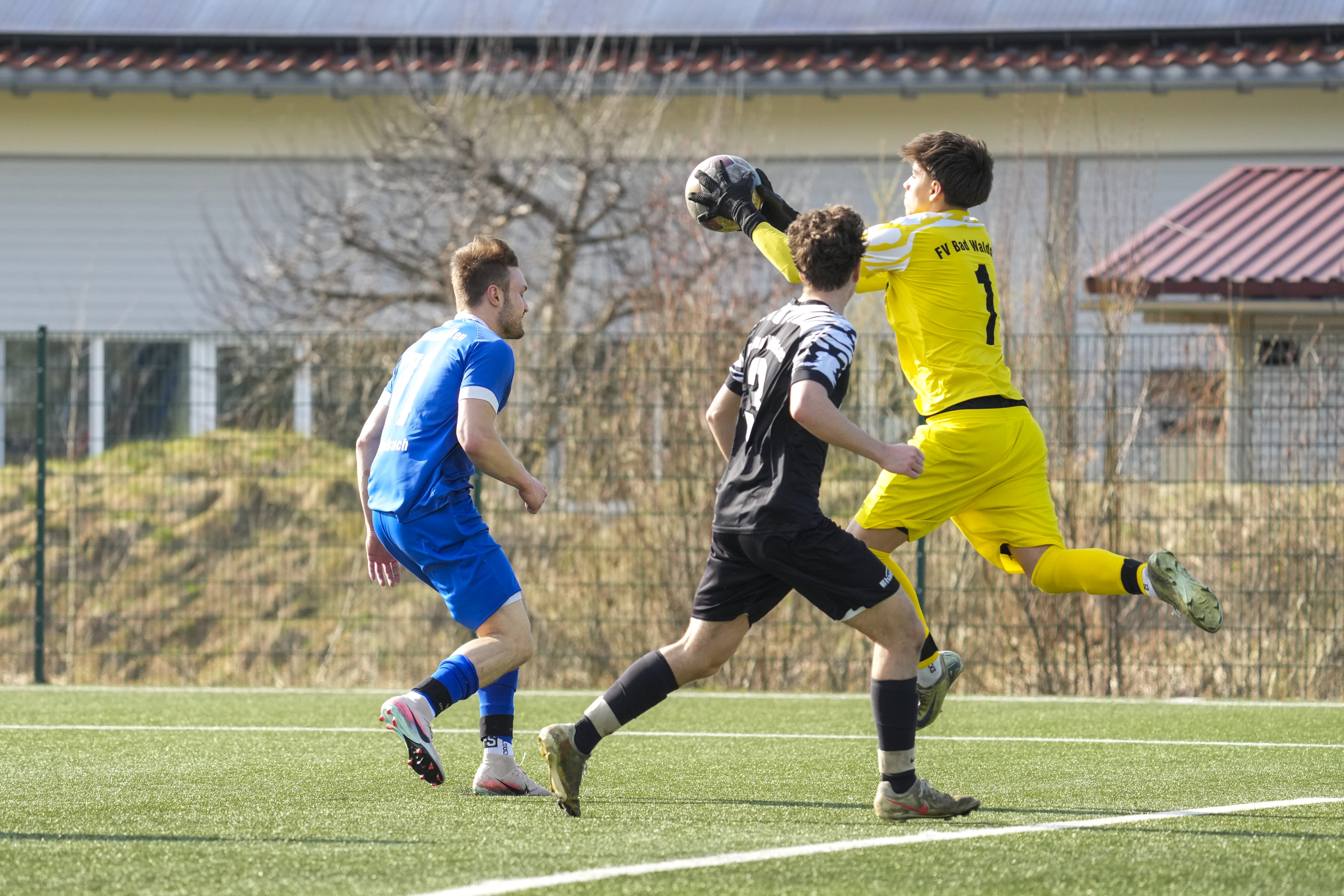 Philipp Greiter (SV Maierhoefen-Gruenenbach, #11) gegen Luca Senn (FV Bad Waldsee, #1), GER, SV Maierhoefen vs. FV Bad Waldsee, Fussball, Bezirksliga Bodensee, 23. Spieltag, Spielzeit 2025/2026, 22.03.26 Foto: Maximilian Rist