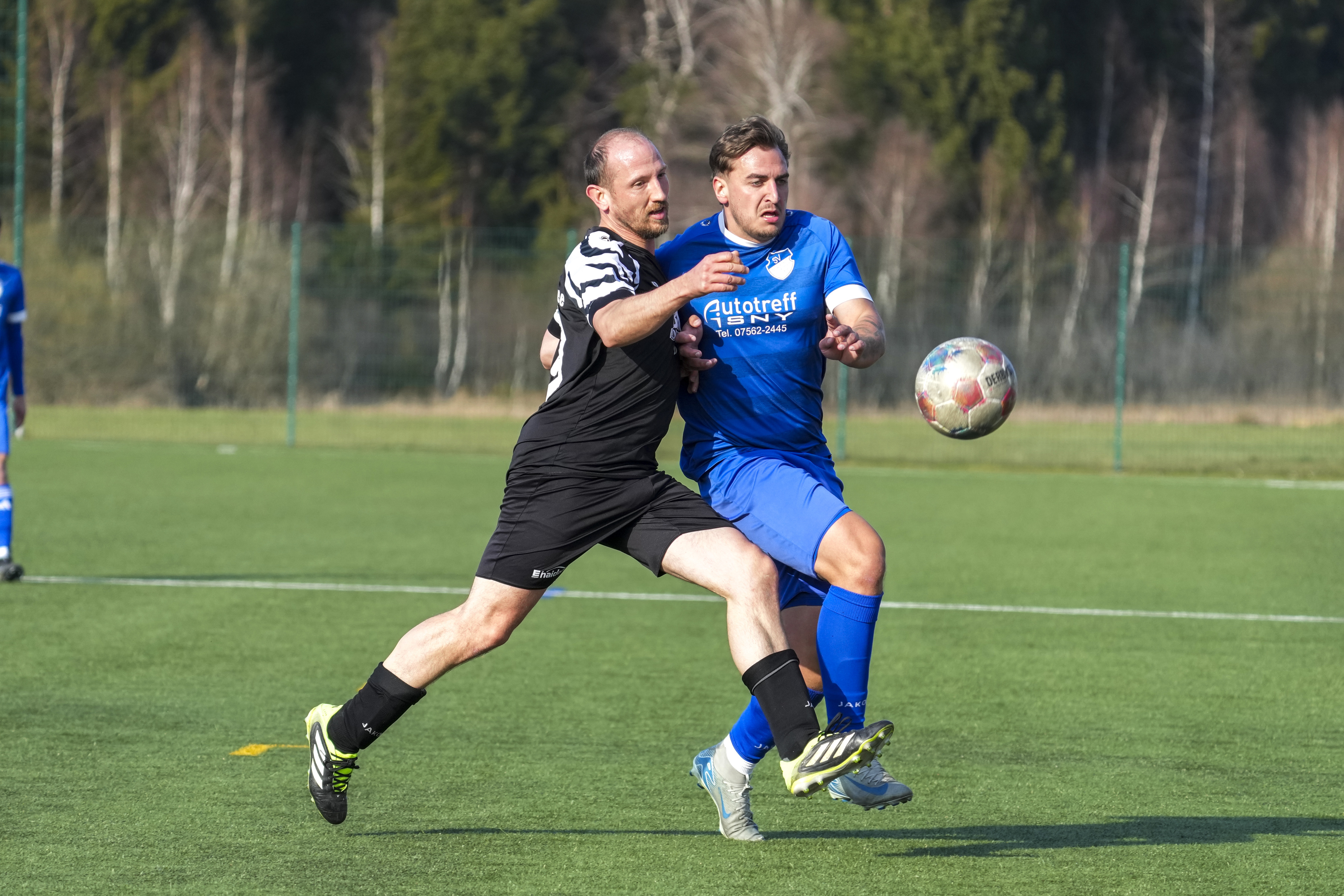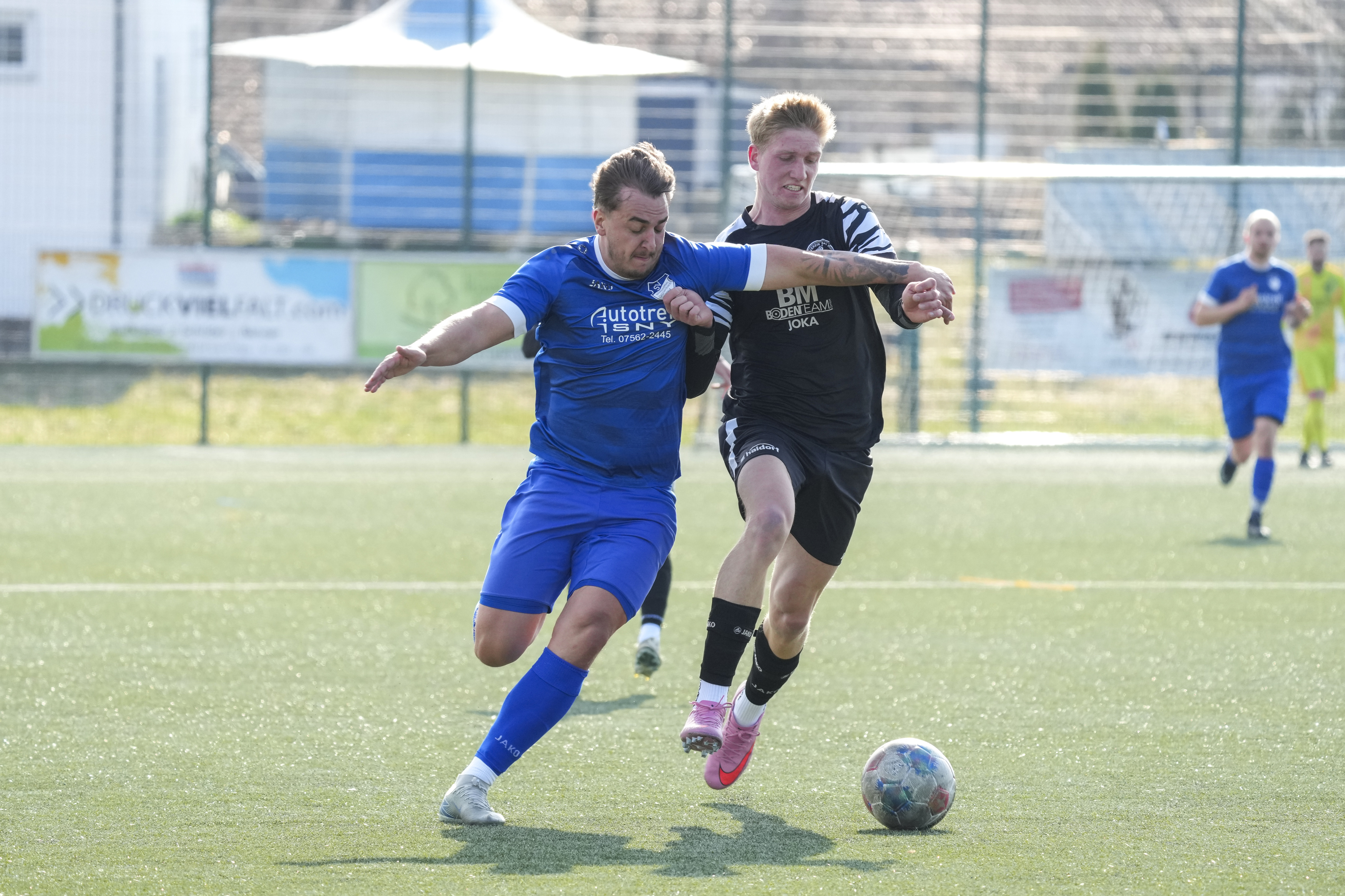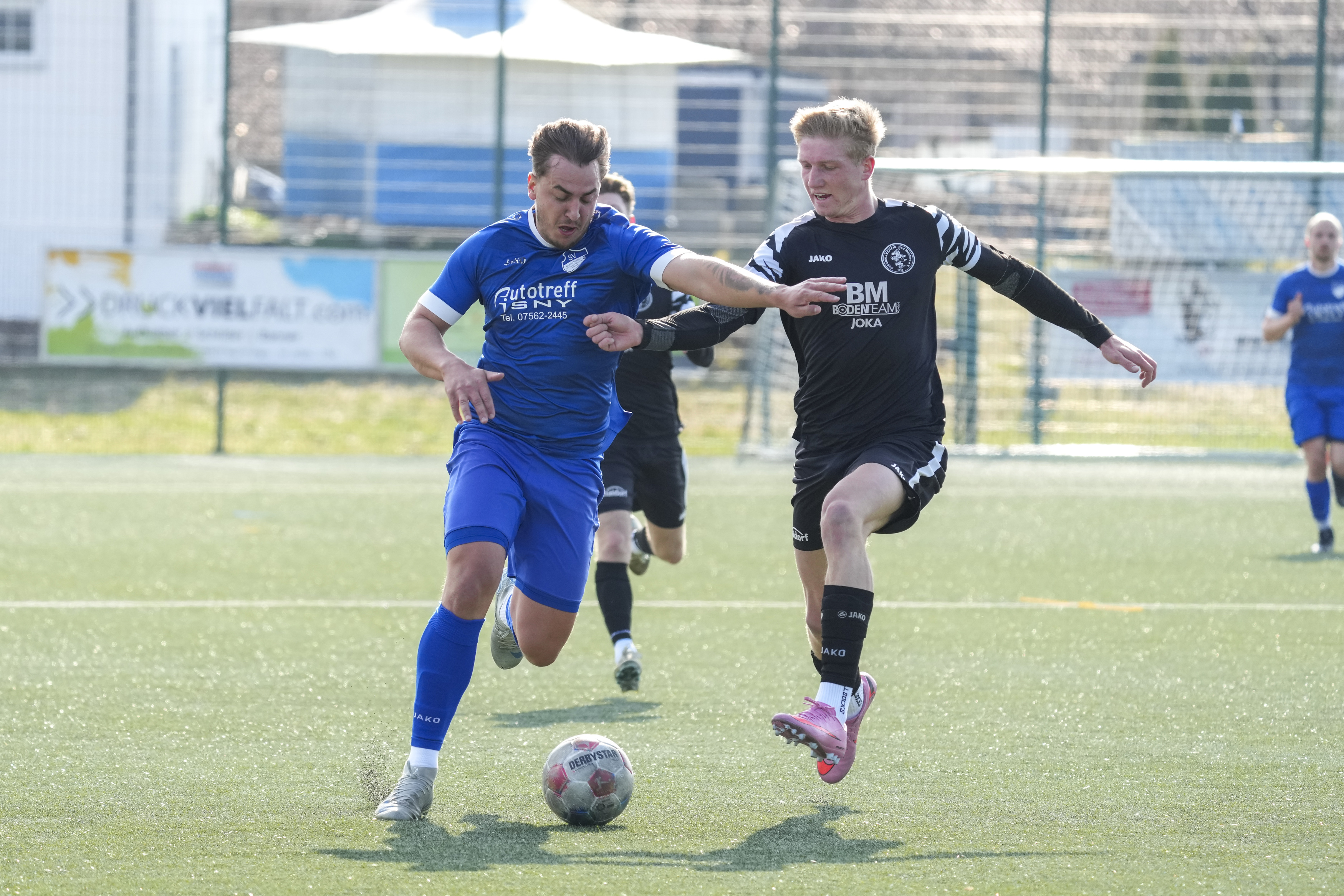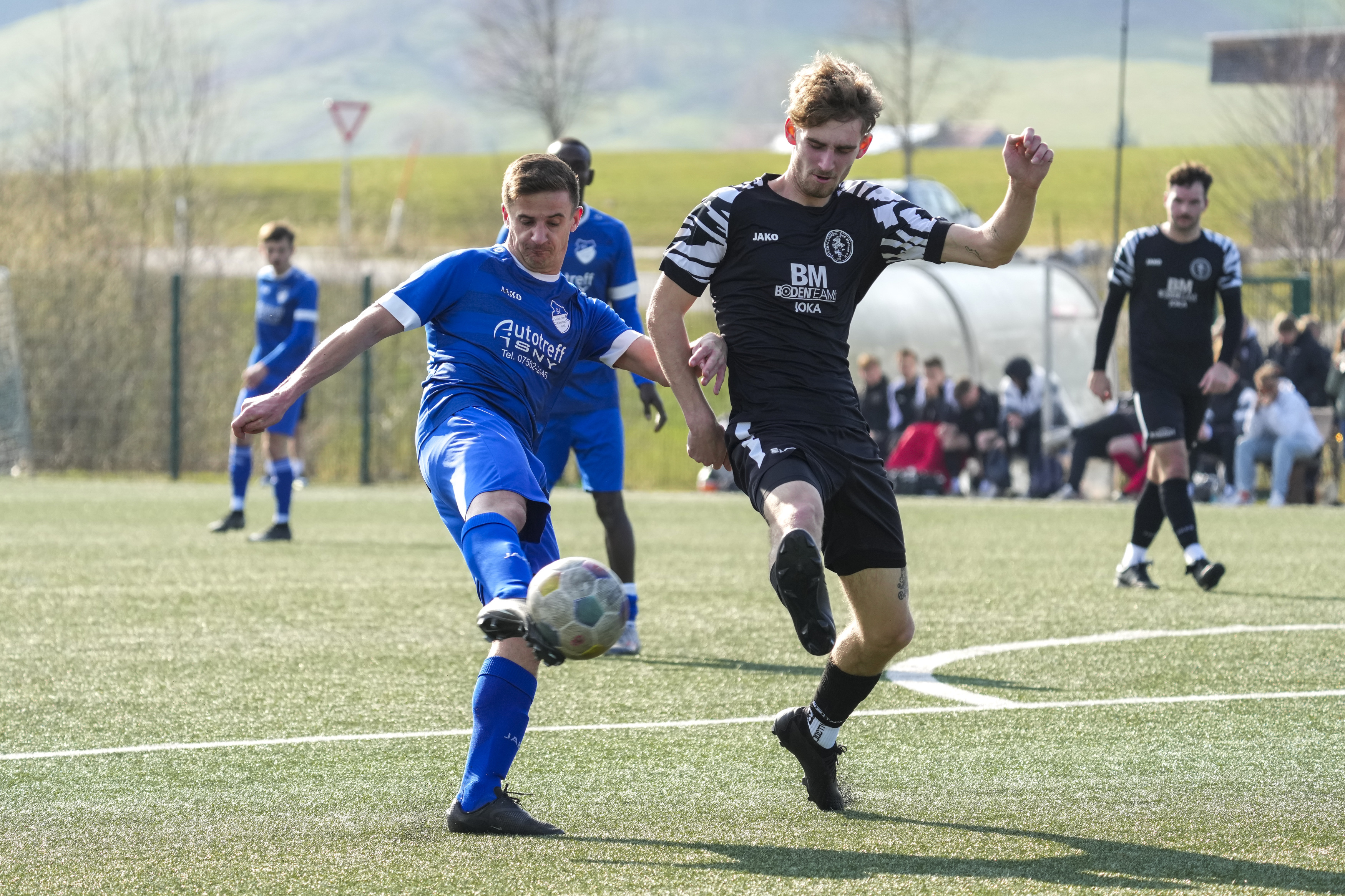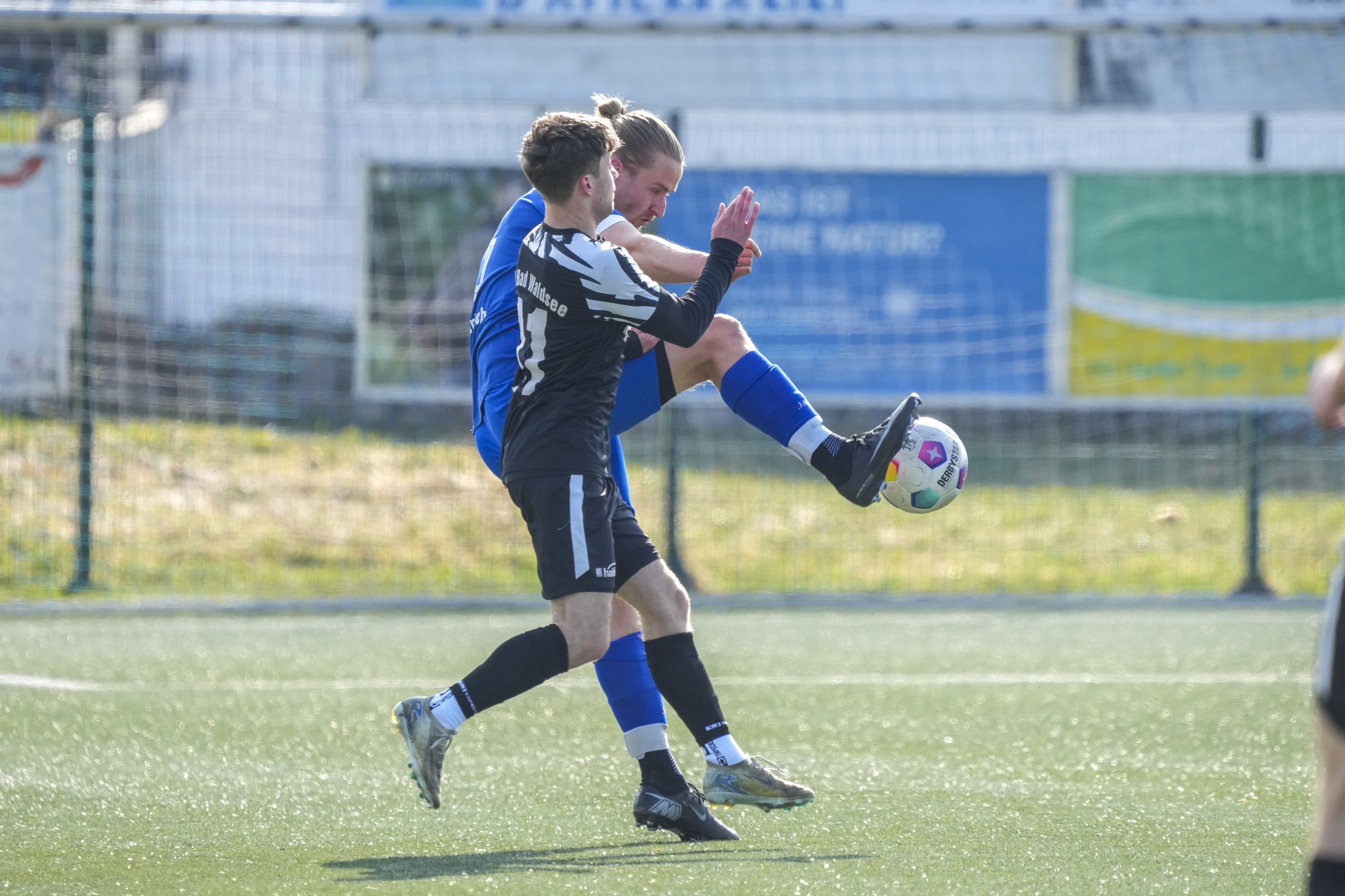 Moritz Zeh (SV Maierhoefen-Gruenenbach, #15) gegen Jonathan Knoll (FV Bad Waldsee, #17), GER, SV Maierhoefen vs. FV Bad Waldsee, Fussball, Bezirksliga Bodensee, 23. Spieltag, Spielzeit 2025/2026, 22.03.26 Foto: Maximilian Rist