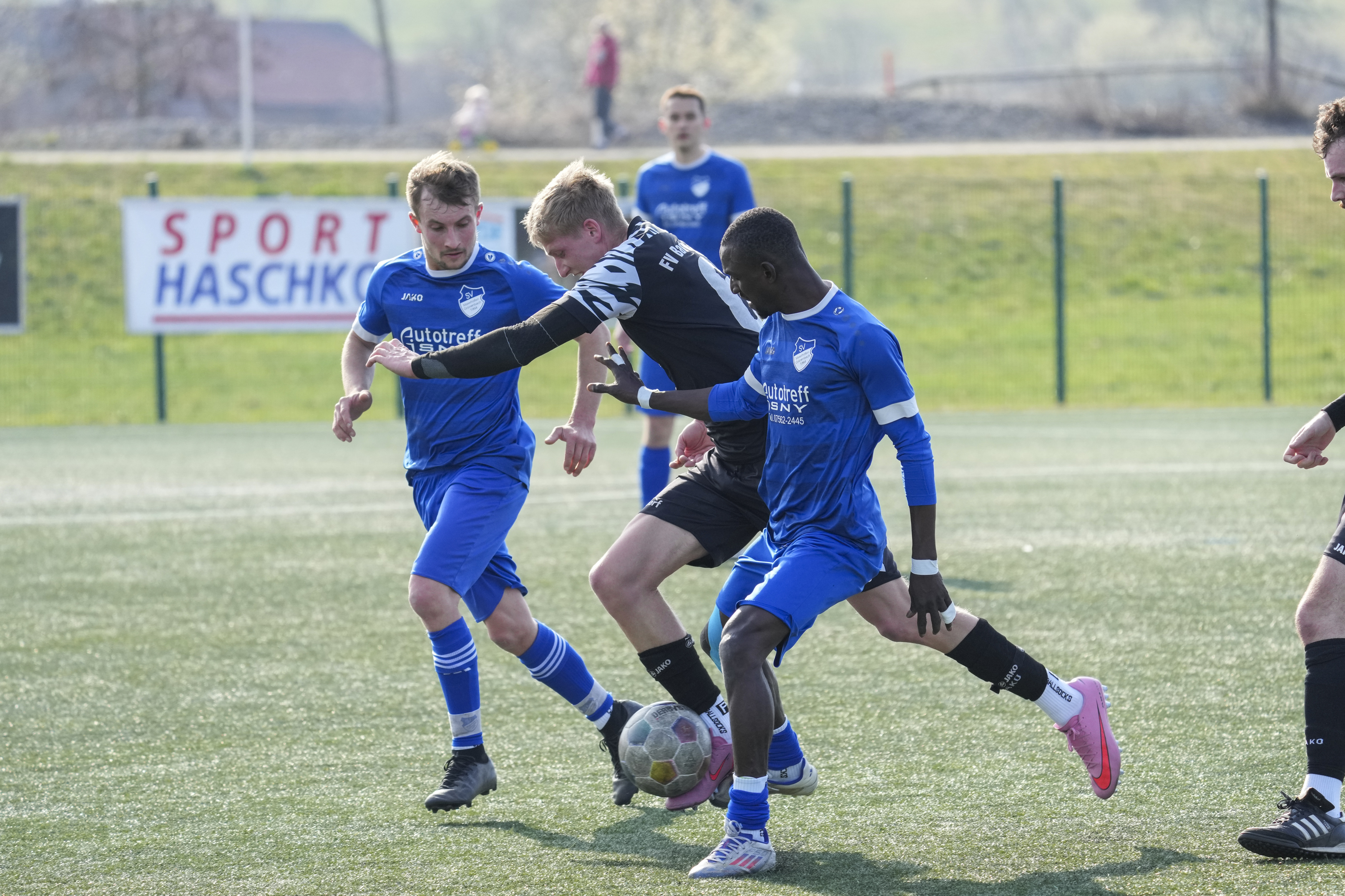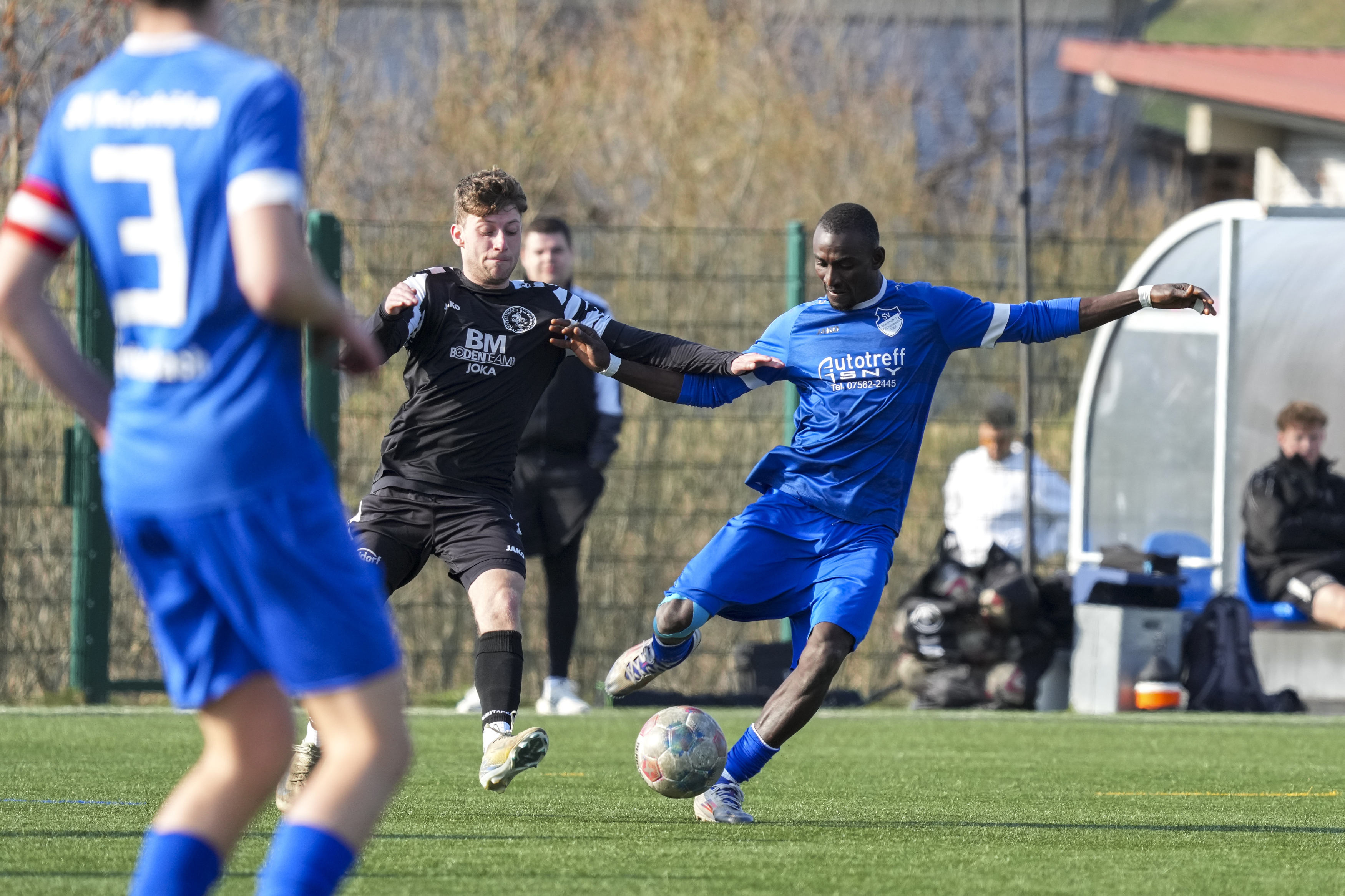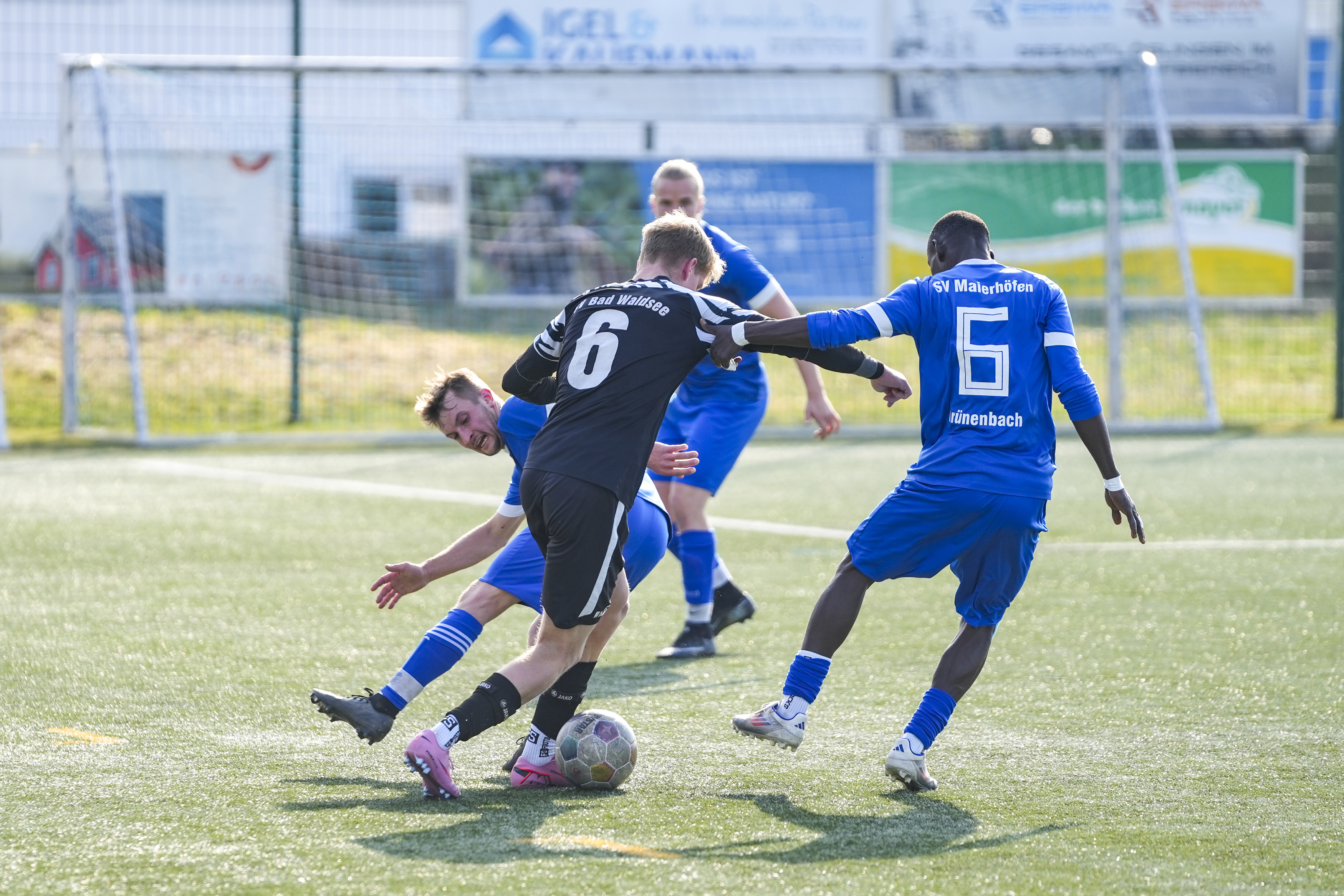 Niklas Heider (FV Bad Waldsee, #6) gegen Manuel Eugler (SV Maierhoefen-Gruenenbach, #8) und Sy Cheick Alassane Savane (SV Maierhoefen-Gruenenbach, #6), GER, SV Maierhoefen vs. FV Bad Waldsee, Fussball, Bezirksliga Bodensee, 23. Spieltag, Spielzeit 2025/2026, 22.03.26 Foto: Maximilian Rist