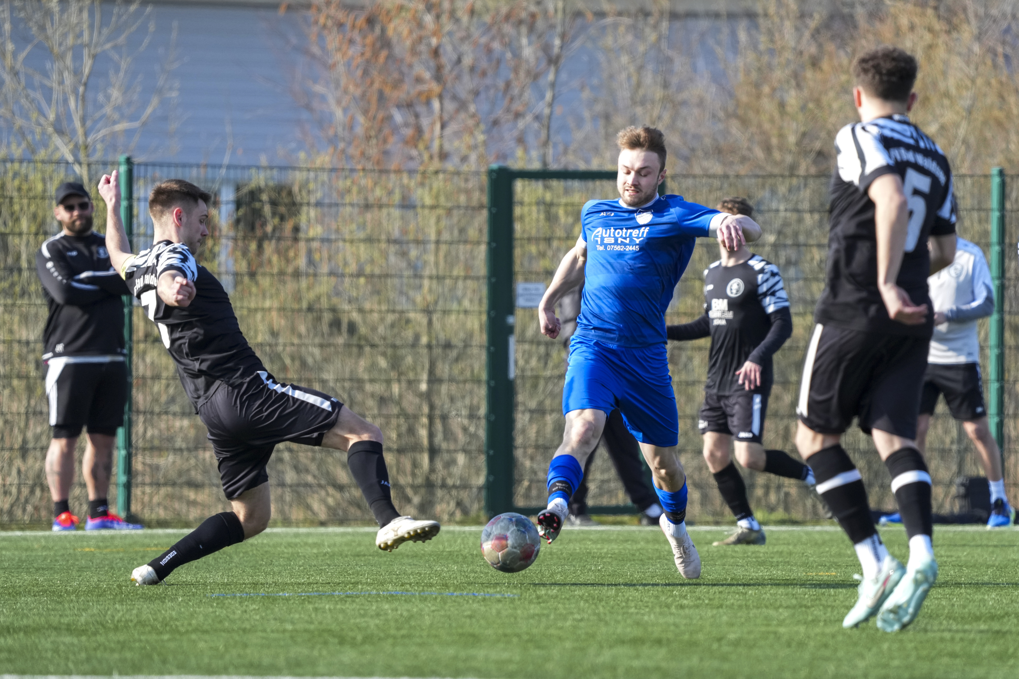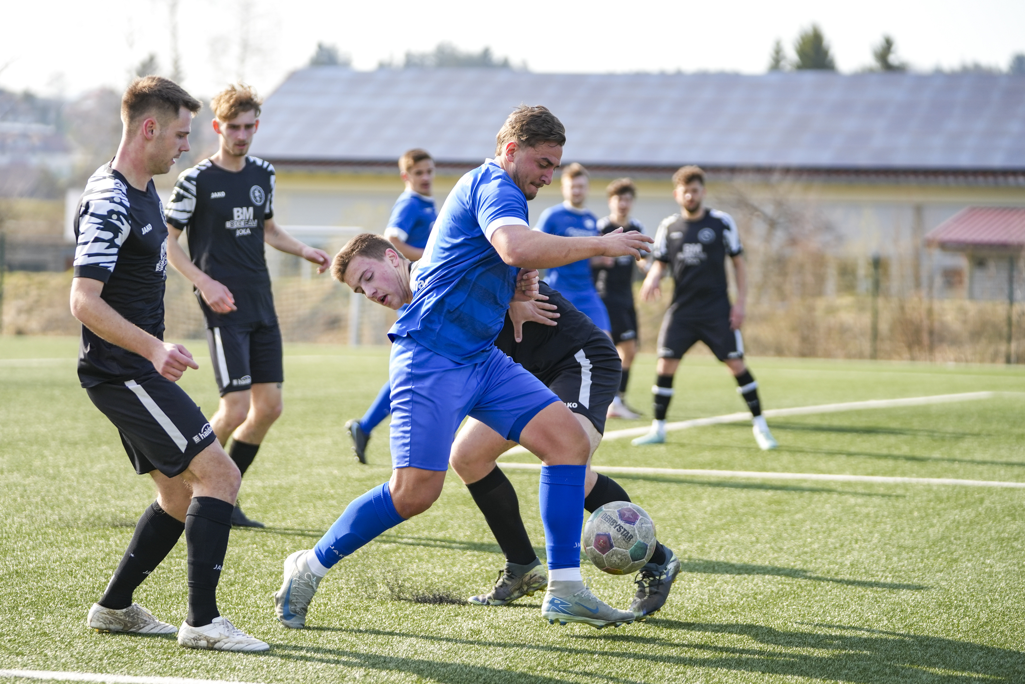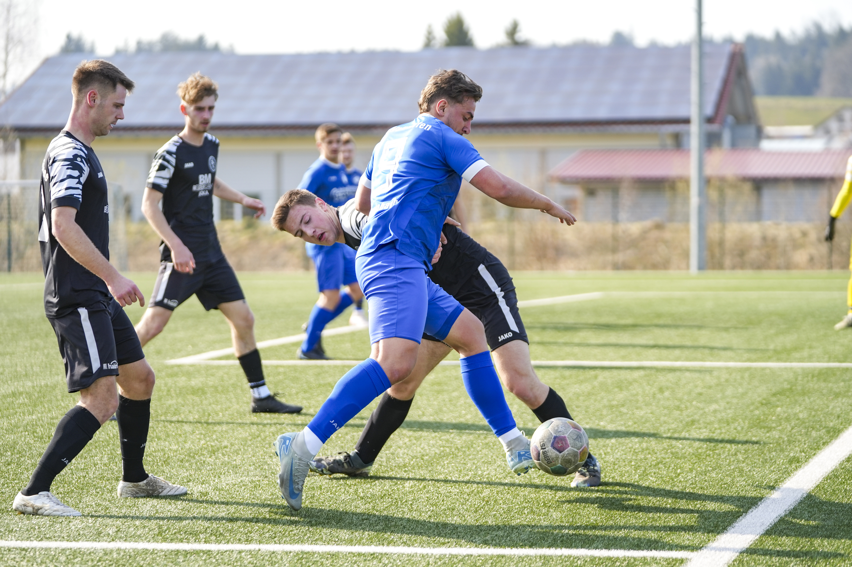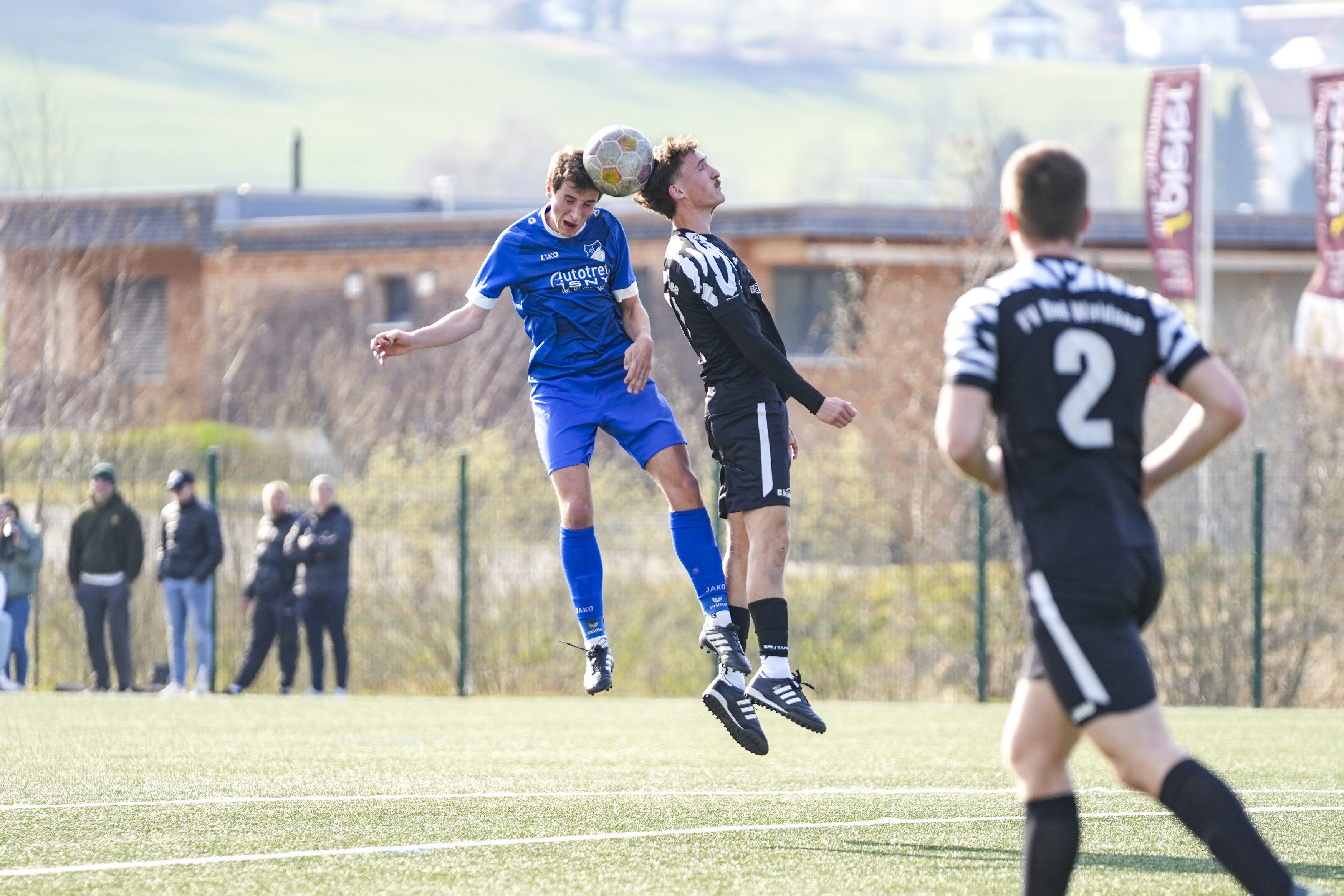 Niklas Heider (FV Bad Waldsee, #6) gegen Manuel Eugler (SV Maierhoefen-Gruenenbach, #8) und Sy Cheick Alassane Savane (SV Maierhoefen-Gruenenbach, #6), GER, SV Maierhoefen vs. FV Bad Waldsee, Fussball, Bezirksliga Bodensee, 23. Spieltag, Spielzeit 2025/2026, 22.03.26 Foto: Maximilian Rist
