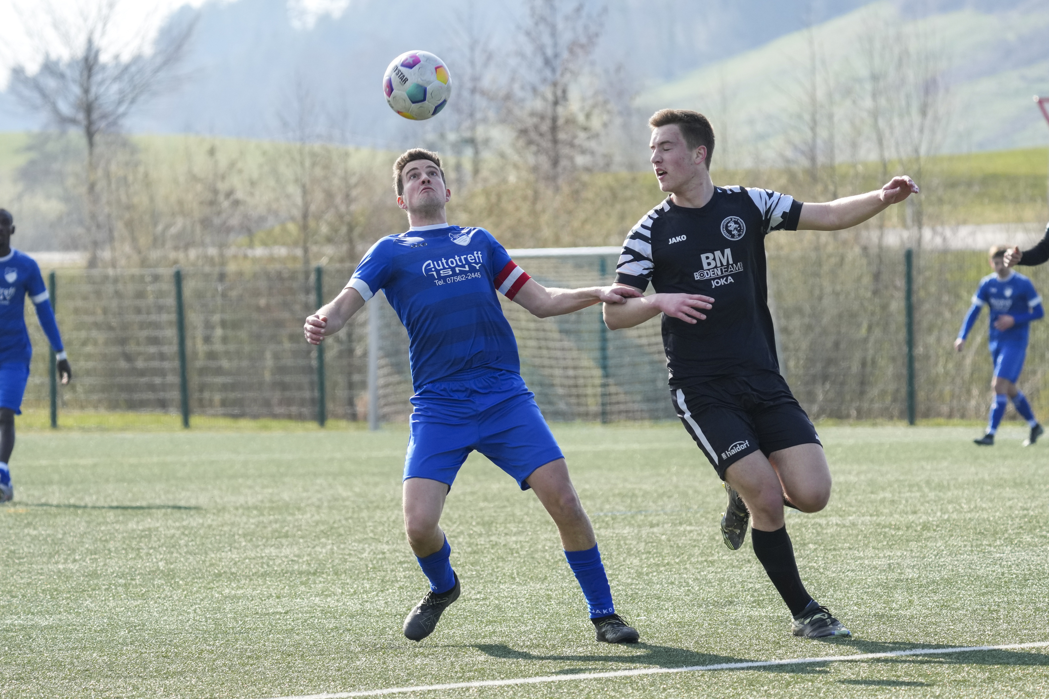 Felix Merz (SV Maierhoefen-Gruenenbach, #4) gegen Jonathan Knoll (FV Bad Waldsee, #17), GER, SV Maierhoefen vs. FV Bad Waldsee, Fussball, Bezirksliga Bodensee, 23. Spieltag, Spielzeit 2025/2026, 22.03.26 Foto: Maximilian Rist