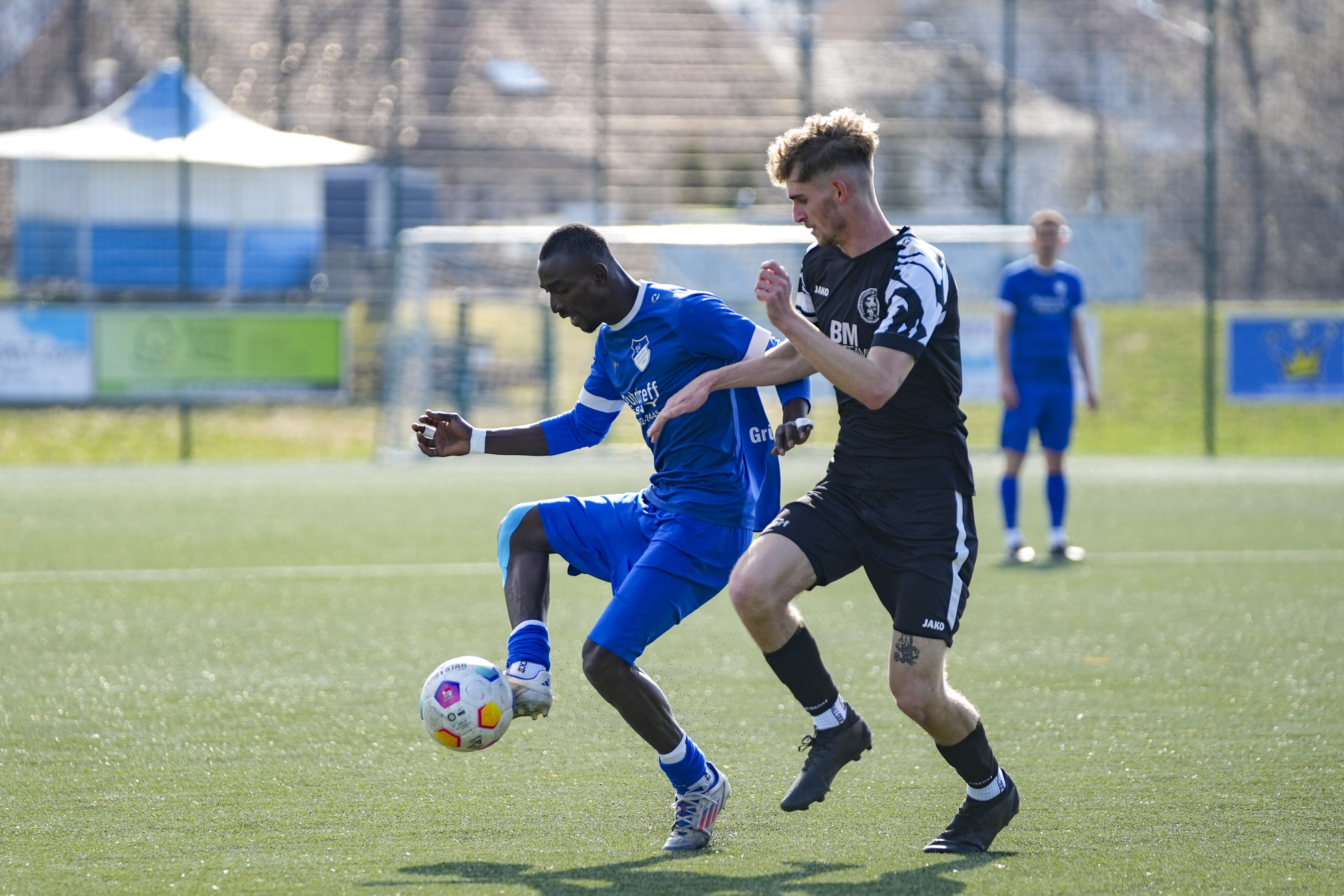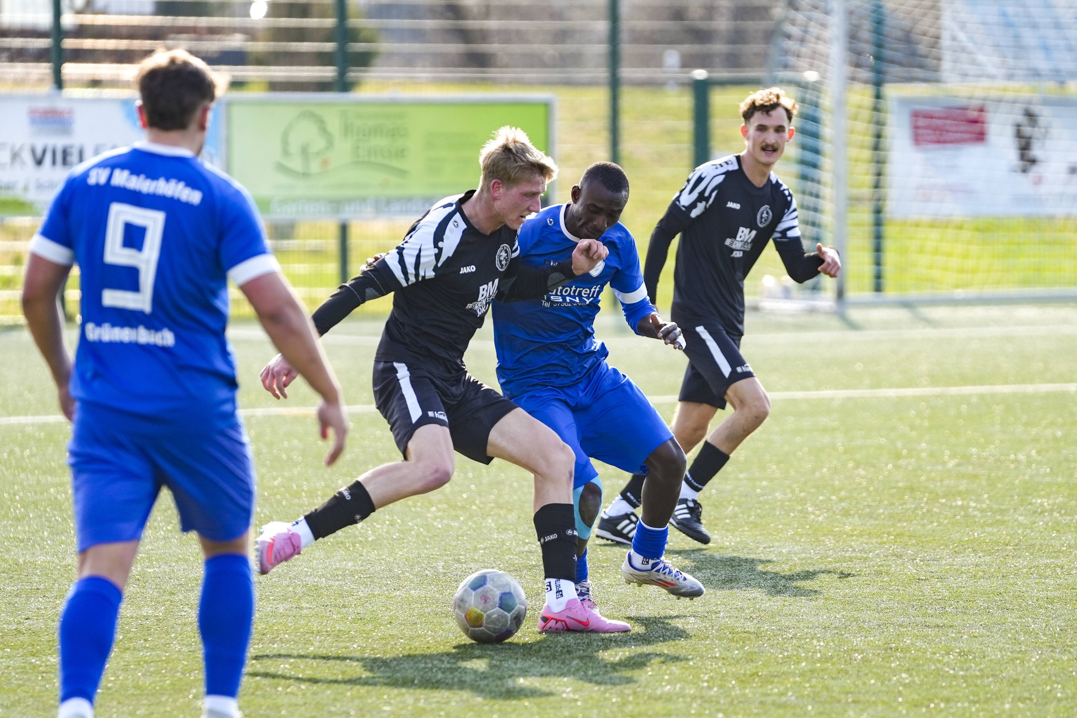 Sy Cheick Alassane Savane (SV Maierhoefen-Gruenenbach, #6) gegen Jonathan Knoll (FV Bad Waldsee, #17), GER, SV Maierhoefen vs. FV Bad Waldsee, Fussball, Bezirksliga Bodensee, 23. Spieltag, Spielzeit 2025/2026, 22.03.26 Foto: Maximilian Rist