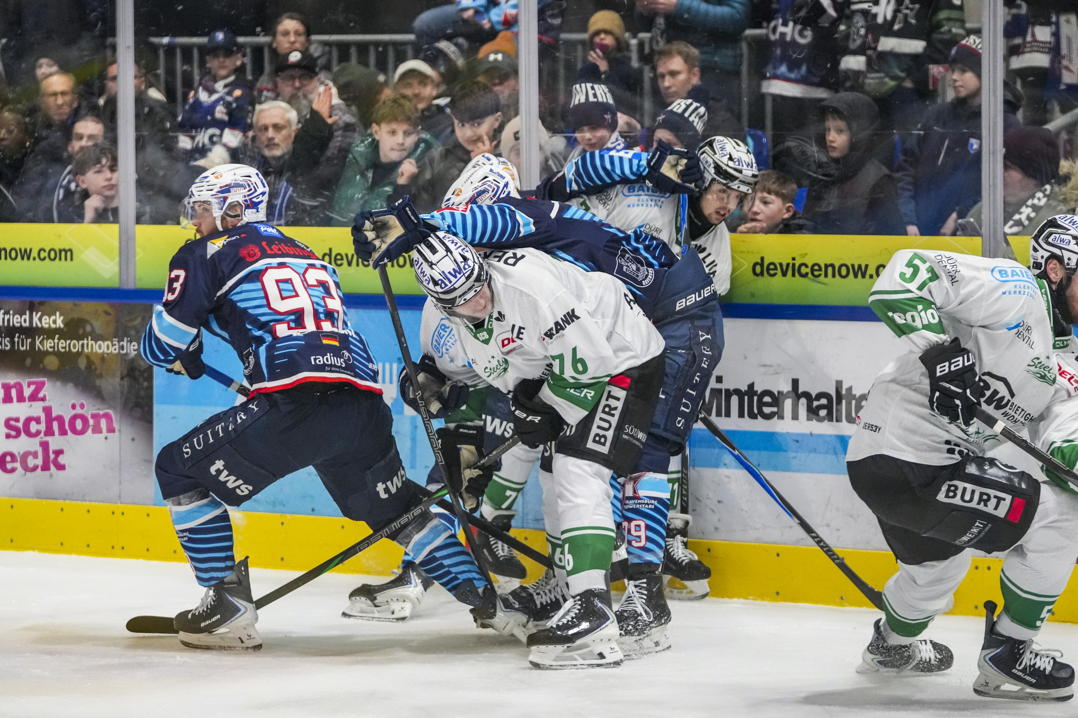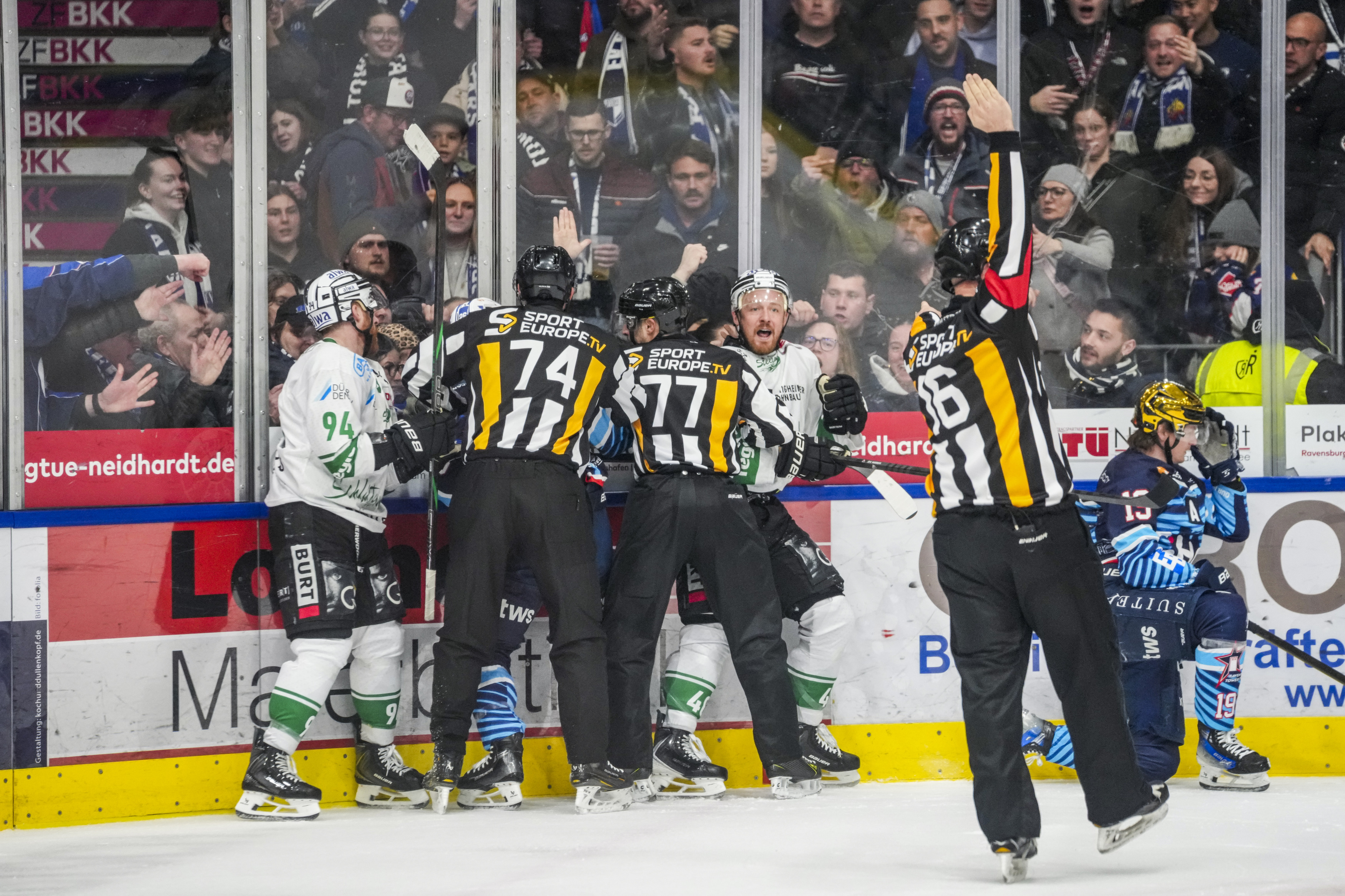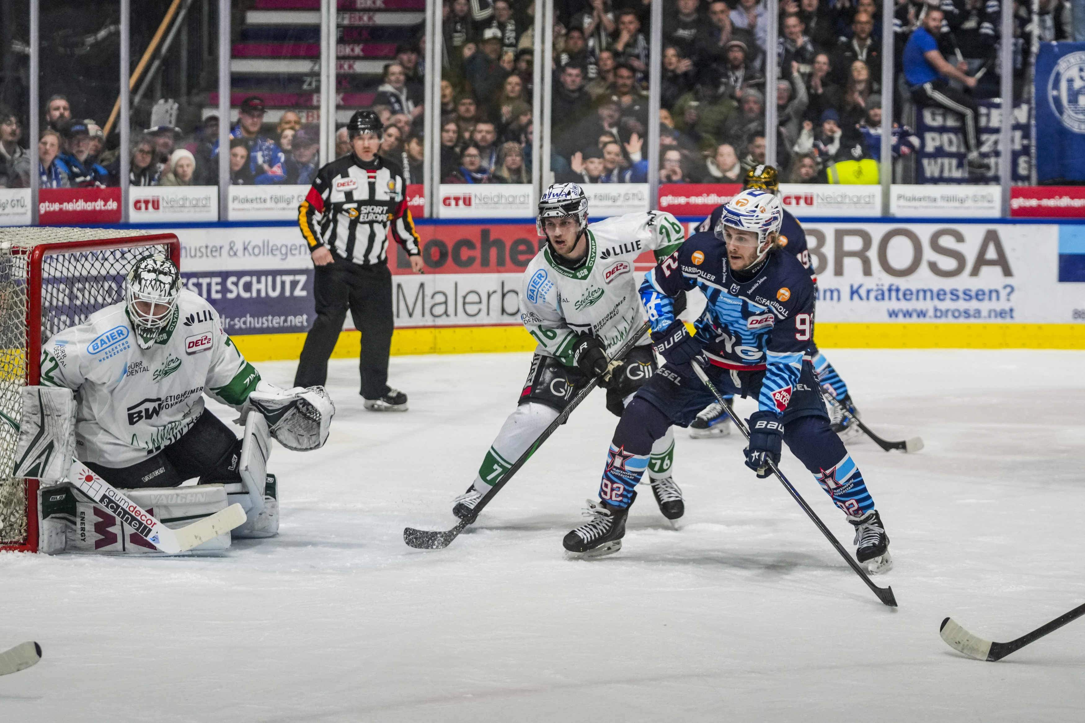Gerangel rund um Tim Schuele (Bietigheim Steelers, #40) , GER, Ravensburg Towerstars vs. Bietigheim Steelers, Eishockey, DEL2, Spielzeit 2025/2026, Playoff Viertelfinale, Spiel 5, 27.03.26 Foto: Maximilian Rist , GER, Ravensburg Towerstars vs. Bietigheim Steelers, Eishockey, DEL2, Spielzeit 2025/2026, Playoff Viertelfinale, Spiel 5, 27.03.26 Foto: Maximilian Rist