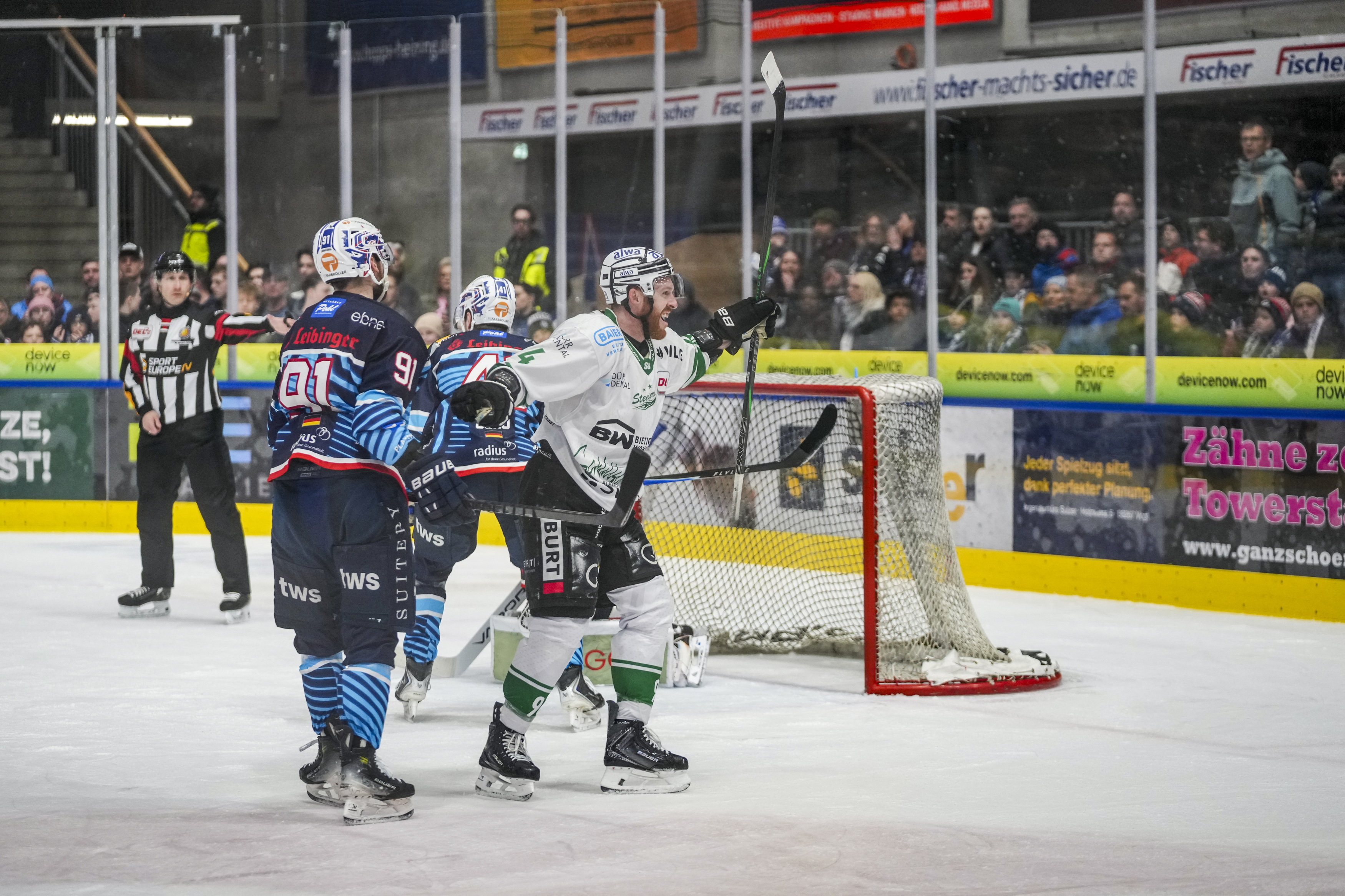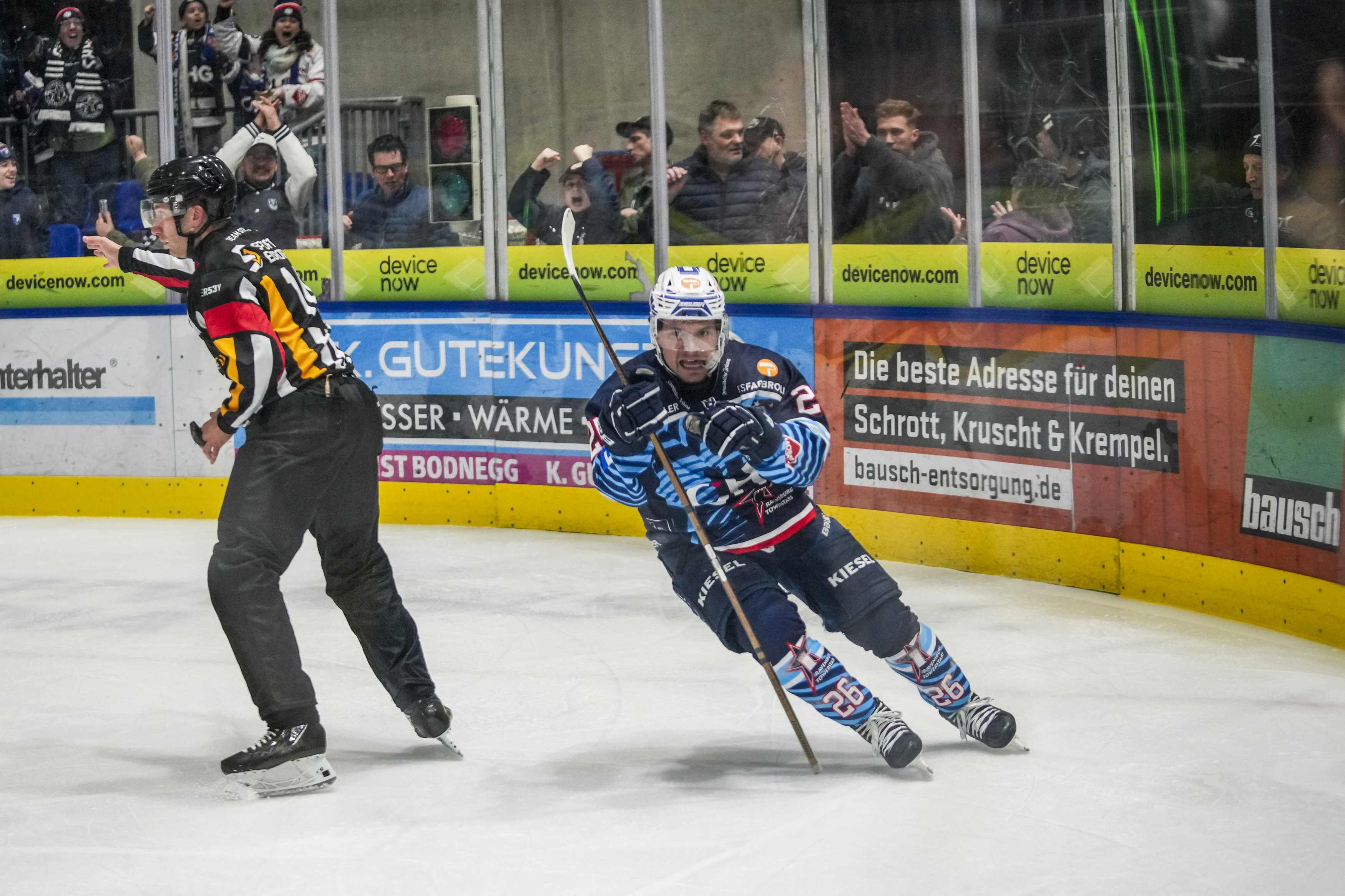 Torjubel zum 0:1, GER, Ravensburg Towerstars vs. Bietigheim Steelers, Eishockey, DEL2, Spielzeit 2025/2026, Playoff Viertelfinale, Spiel 5, 27.03.26 Foto: Maximilian Rist , GER, Ravensburg Towerstars vs. Bietigheim Steelers, Eishockey, DEL2, Spielzeit 2025/2026, Playoff Viertelfinale, Spiel 5, 27.03.26 Foto: Maximilian Rist