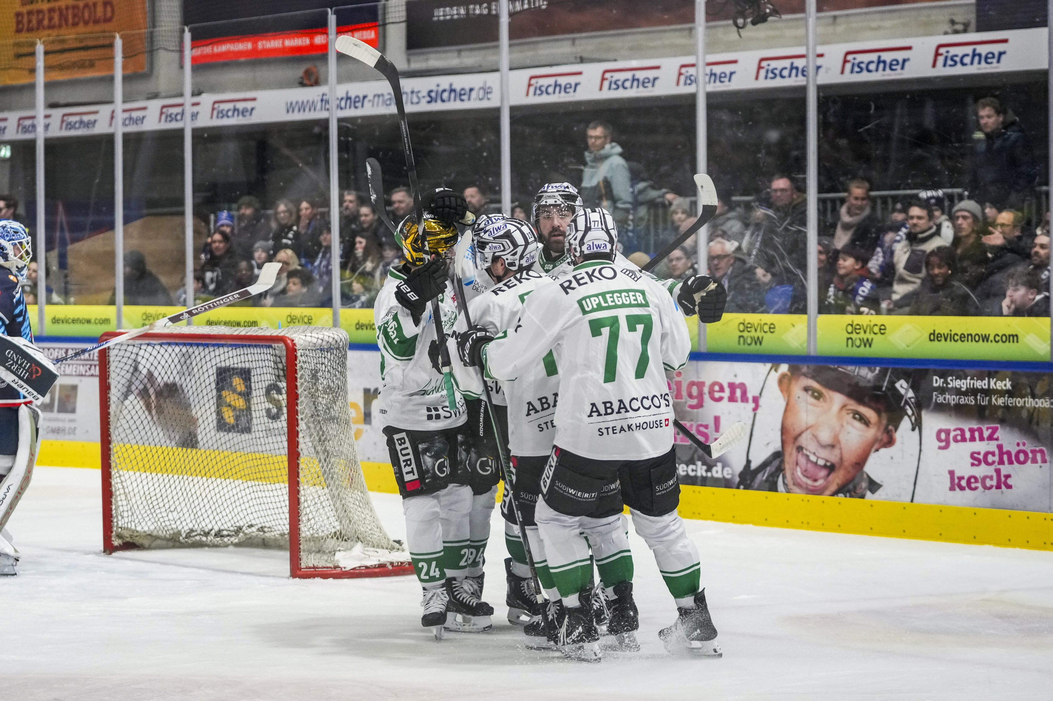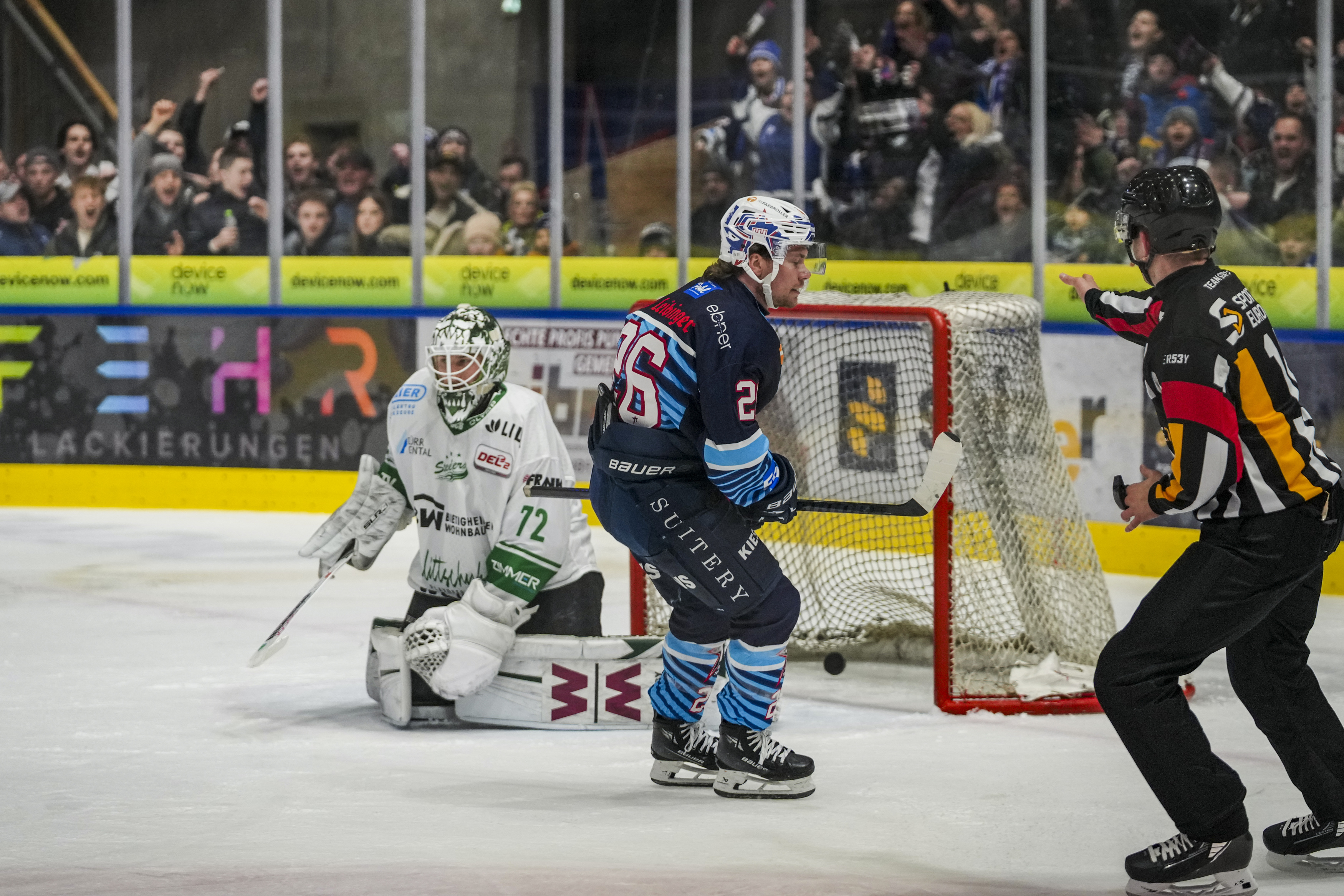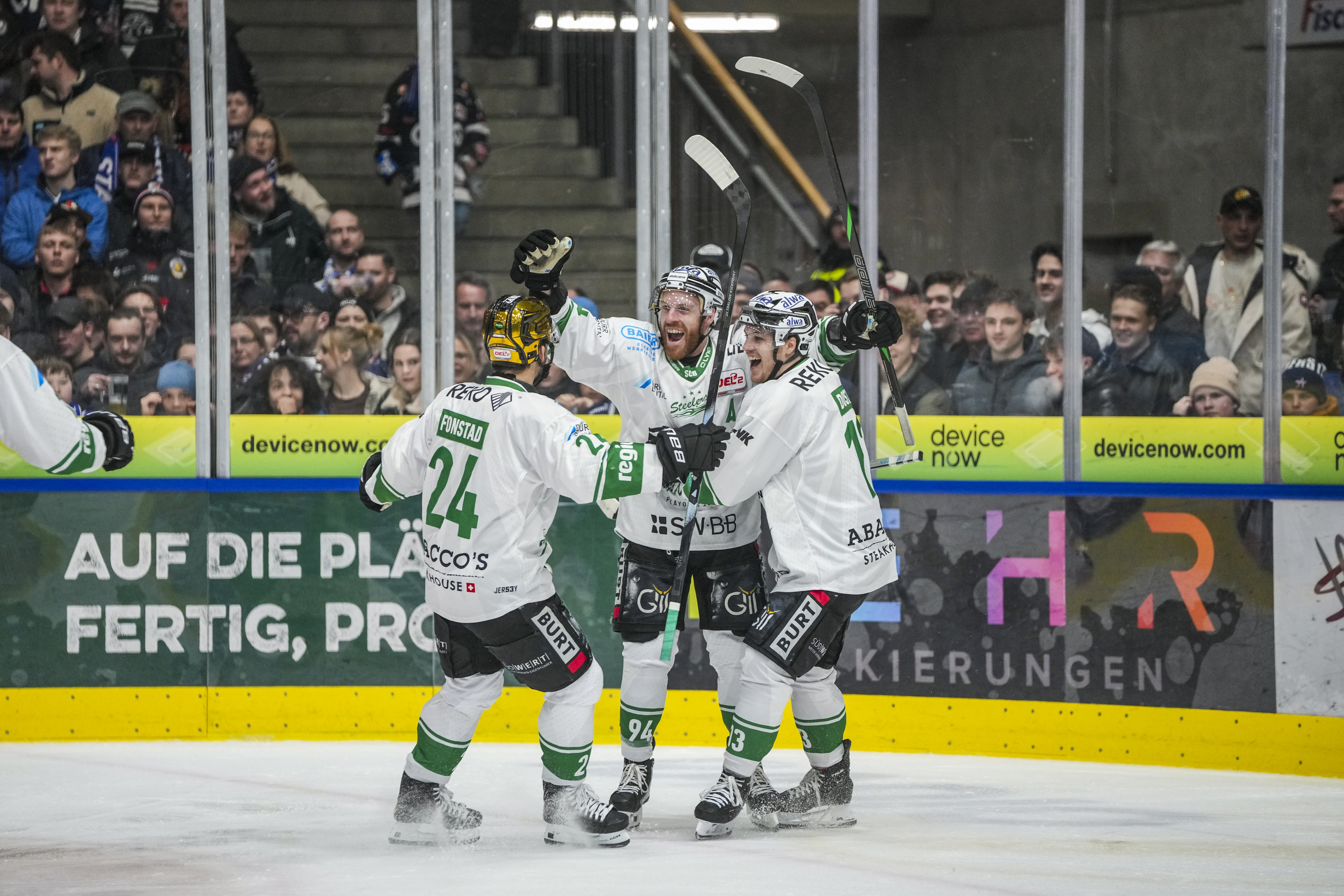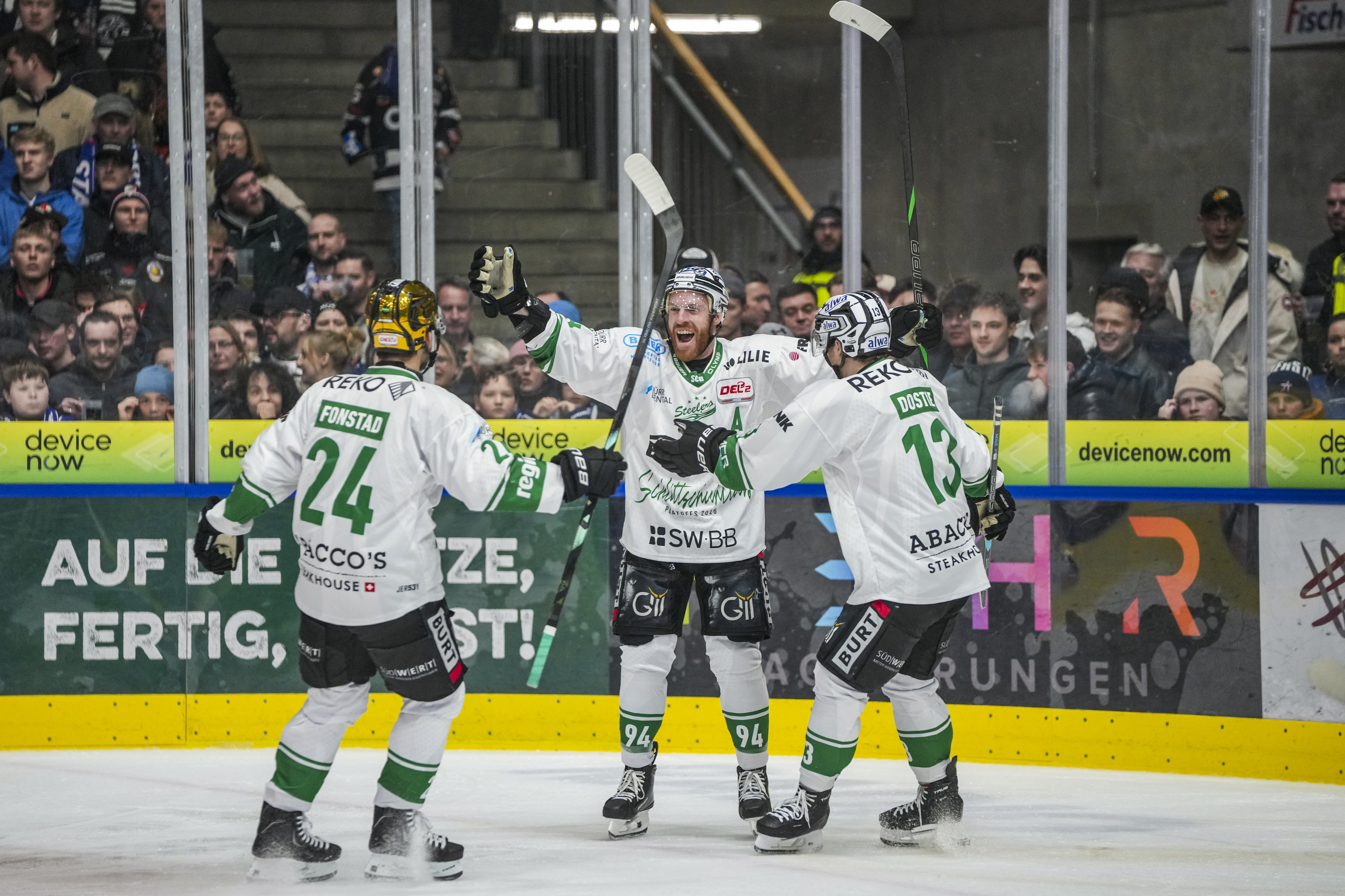 Torjubel zum 0:1 von Cole Fonstad (Bietigheim Steelers, #24) Tyler McNeely (Bietigheim Steelers, #94) und Alex Dostie (Bietigheim Steelers, #13), GER, Ravensburg Towerstars vs. Bietigheim Steelers, Eishockey, DEL2, Spielzeit 2025/2026, Playoff Viertelfinale, Spiel 5, 27.03.26 Foto: Maximilian Rist , GER, Ravensburg Towerstars vs. Bietigheim Steelers, Eishockey, DEL2, Spielzeit 2025/2026, Playoff Viertelfinale, Spiel 5, 27.03.26 Foto: Maximilian Rist