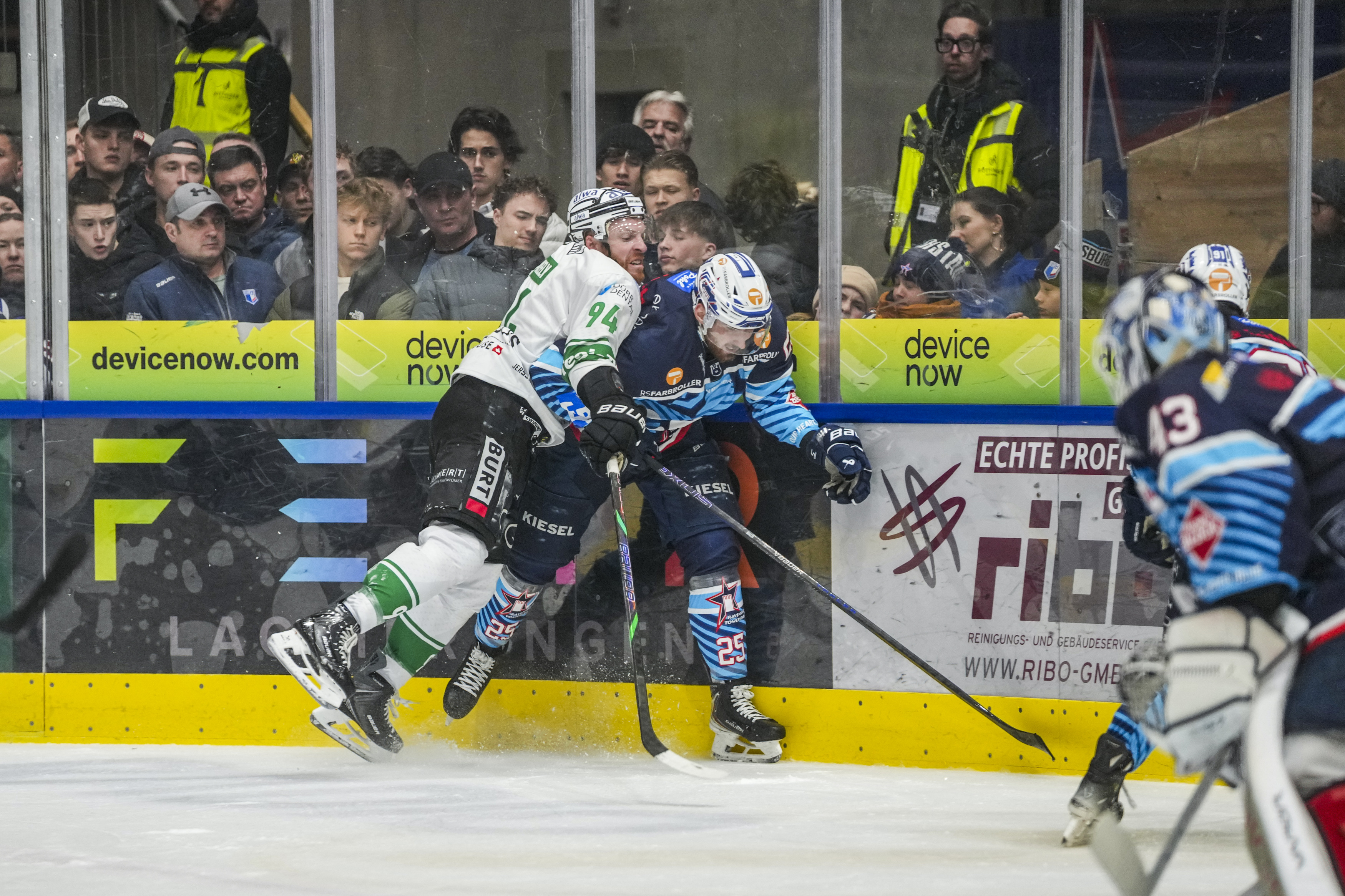 Check an der Bande von Tyler McNeely (Bietigheim Steelers, #94) gegen Philipp Mass (Ravensburg Towerstars, #25), GER, Ravensburg Towerstars vs. Bietigheim Steelers, Eishockey, DEL2, Spielzeit 2025/2026, Playoff Viertelfinale, Spiel 5, 27.03.26 Foto: Maximilian Rist , GER, Ravensburg Towerstars vs. Bietigheim Steelers, Eishockey, DEL2, Spielzeit 2025/2026, Playoff Viertelfinale, Spiel 5, 27.03.26 Foto: Maximilian Rist