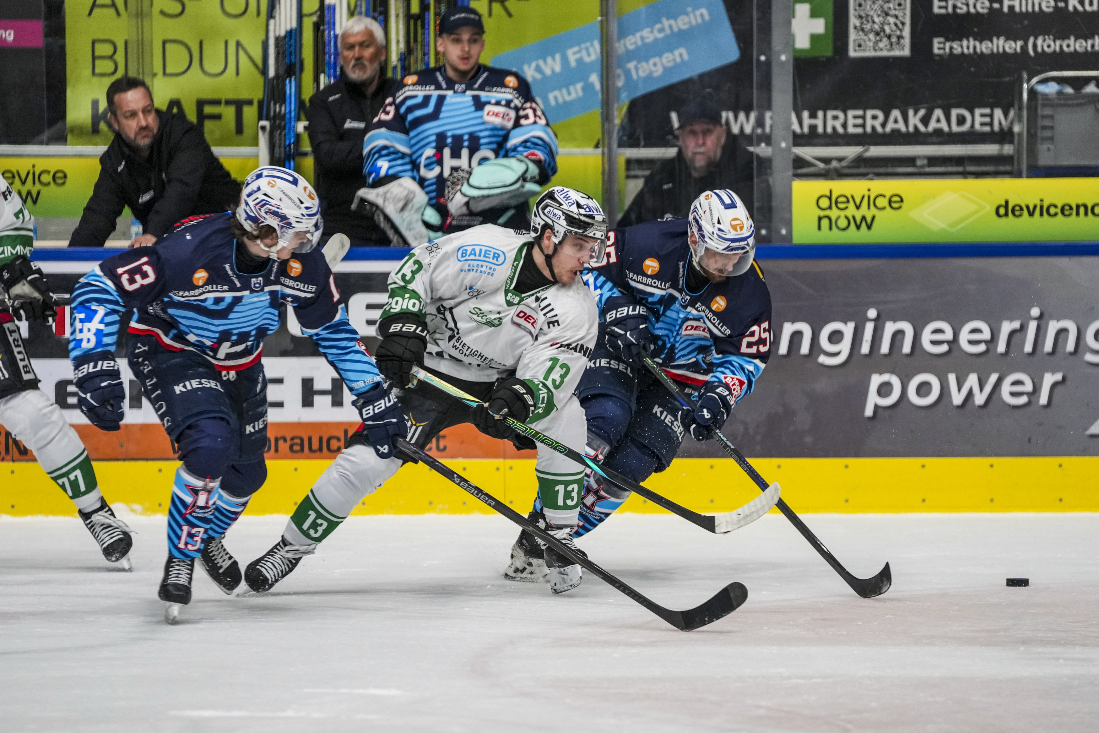 Torchance Tyler McNeely (Bietigheim Steelers, #94) gegen Ilya Sharipov (Ravensburg Towerstars, #43) und Marvin Schmid (Ravensburg Towerstars, #13), GER, Ravensburg Towerstars vs. Bietigheim Steelers, Eishockey, DEL2, Spielzeit 2025/2026, Playoff Viertelfinale, Spiel 5, 27.03.26 Foto: Maximilian Rist , GER, Ravensburg Towerstars vs. Bietigheim Steelers, Eishockey, DEL2, Spielzeit 2025/2026, Playoff Viertelfinale, Spiel 5, 27.03.26 Foto: Maximilian Rist